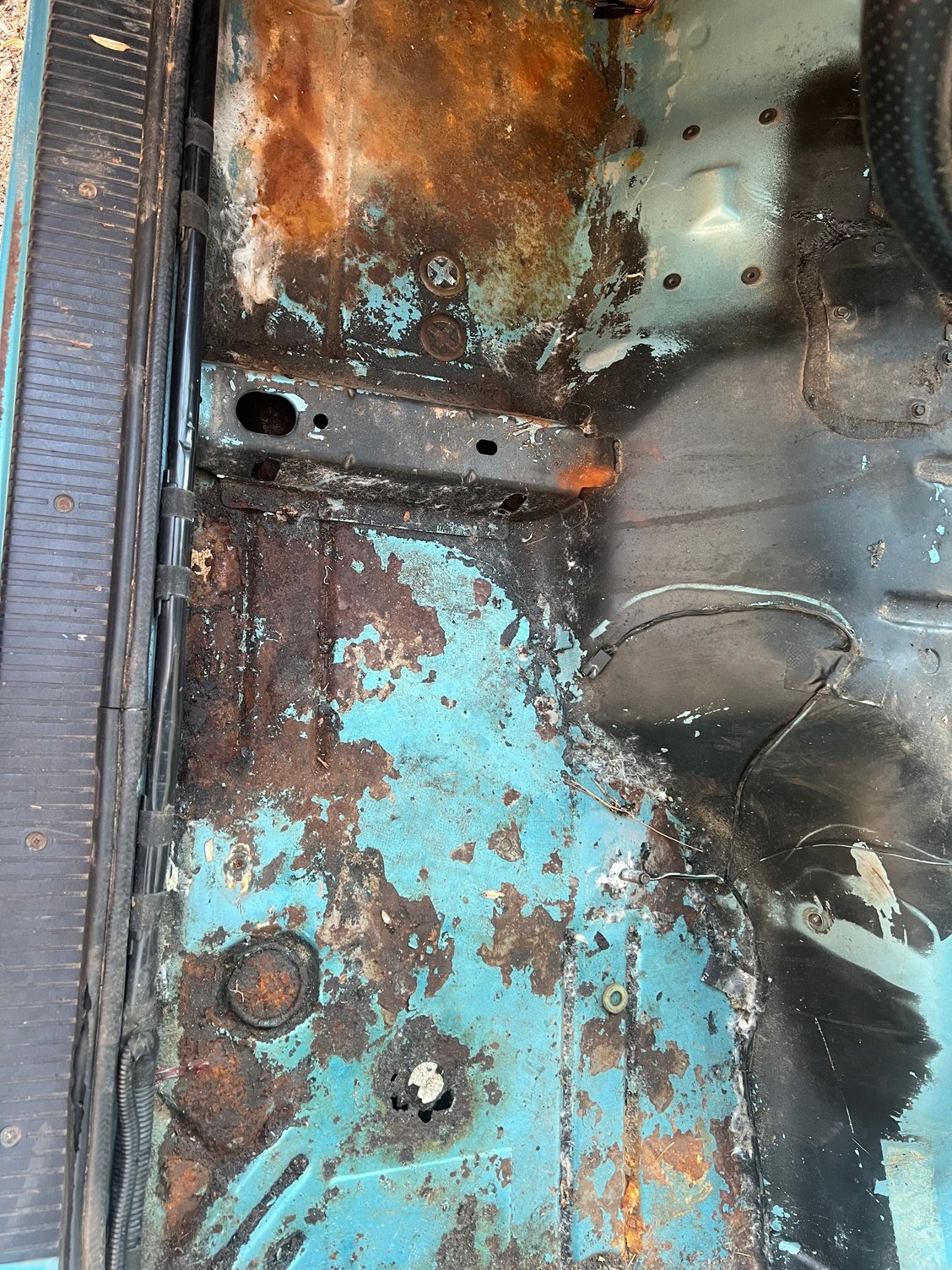 While I was trying to figure that out, I realized the biggest mistake that I’ve made in quite some time. If anyone remembers (or just go back to the beginning of the thread), I thought it was a grand Ol’ idea to put house insulation under my carpets. And now I’m realizing the massive errors of that, because guess what? They soak up water and hold it like a paper towel. After removing the carpet to figure out what kind of bracket I need to make, I discovered more rust and more holes from said rust because of my dumbass.