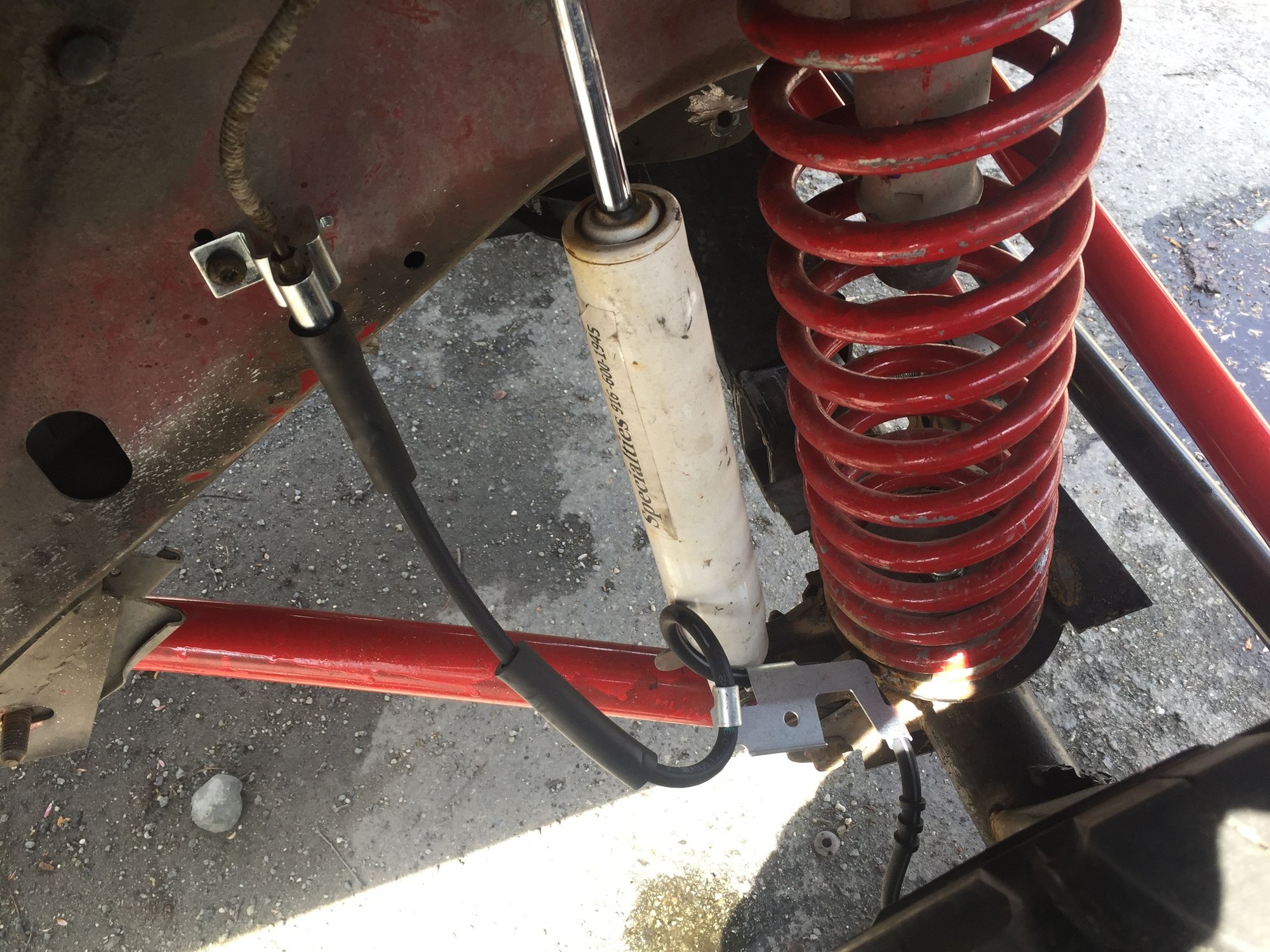 Front brake lines ordered and finally got the front shocks mocked up and brackets in. Had to pull it out of the garage for awhile, but should be driveable as soon as the lines show up