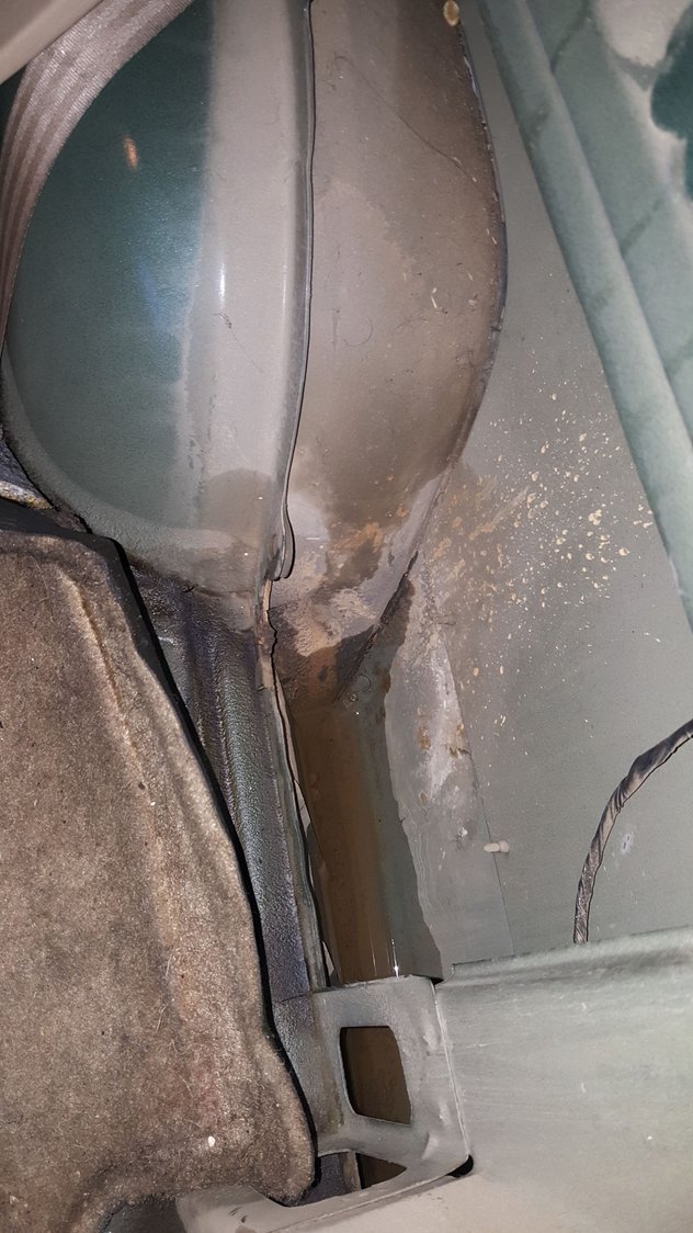 Carpet was soaked, smells like acid, paints peeling, huge pool in the passenger side rocker.