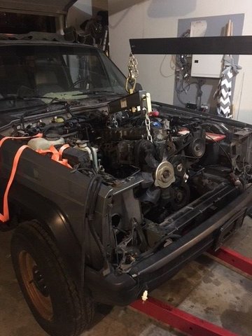 So after fighting with the "new" engine for two hours to get to this point I couldn't get the engine mounts to line up. I decided to take one more look at the mounts on the "new" engine and on the engine that was originally in the jeep and low and behold the mount off the left hand(driver side) of the motor was different. Now not only am I wishing I had just swapped the mounts while both engines were sitting side by side, but I also have to hope I can get the engine high enough to swap them out without completely pulling engine, trans, and transfer case all the way back out. FML