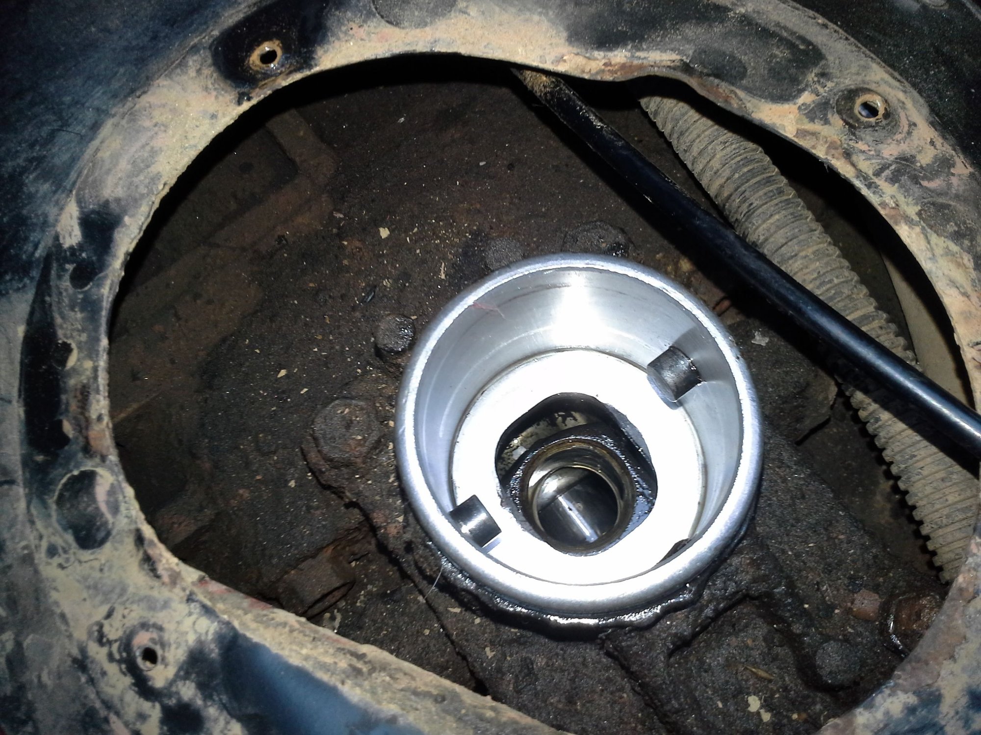 At this point I replaced the breather tube and reinstall could begin. Lining it up was a pain in the ***, but a little at a time got it done. Realized part way though that I had forgotten to reinstall the inspection plate...which goes behind the flywheel....Soooooo pressure plate, clutch disc, and flywheel came back off, then got reinstalled with the plate correctly mounted behind it.