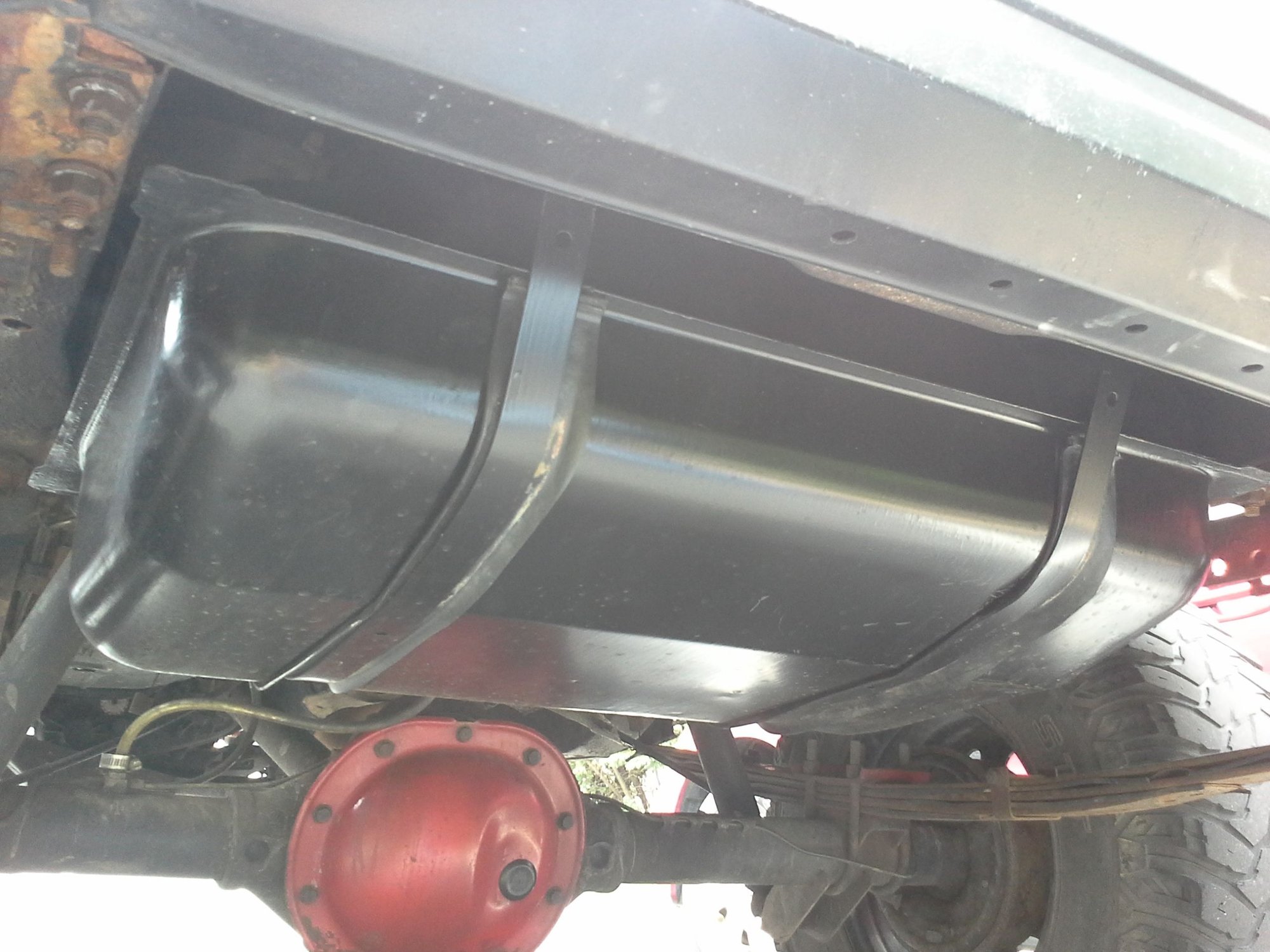New tank is in and jeep is back on the road. I ended up cutting up the stock plastic cover with a utility knife and just used the sections that go between the straps and the tank. This should limit the continuous mud/water contact that caused the rusting of the first tank. I should be able to easily spray any mud out of the skid plate with this setup instead of leaving it trapped for years