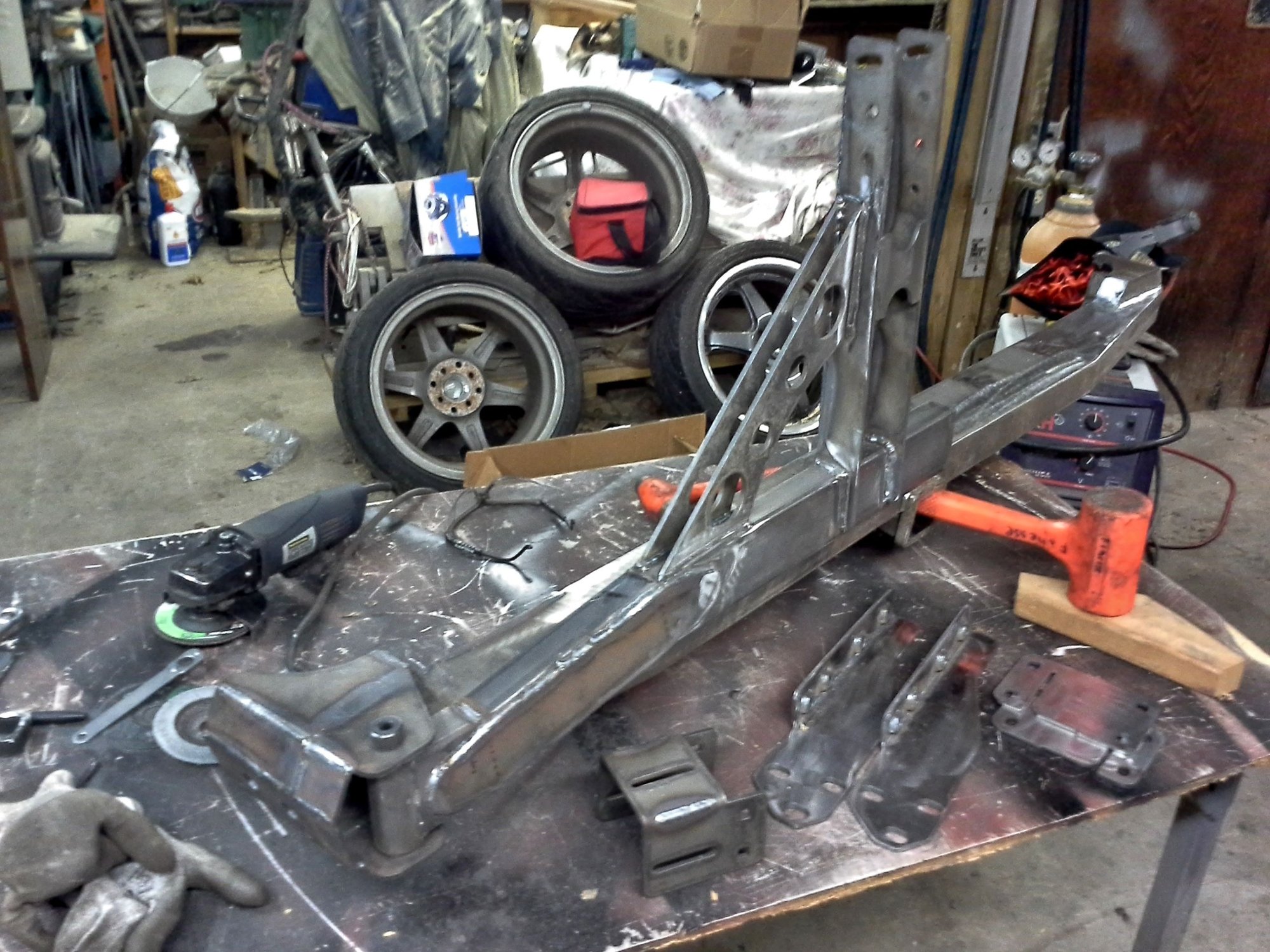 More work done on the rear bumper. Getting closed to finished. Installed the tire carrier vertical support and gusseting last night, and capped the swing arm tube