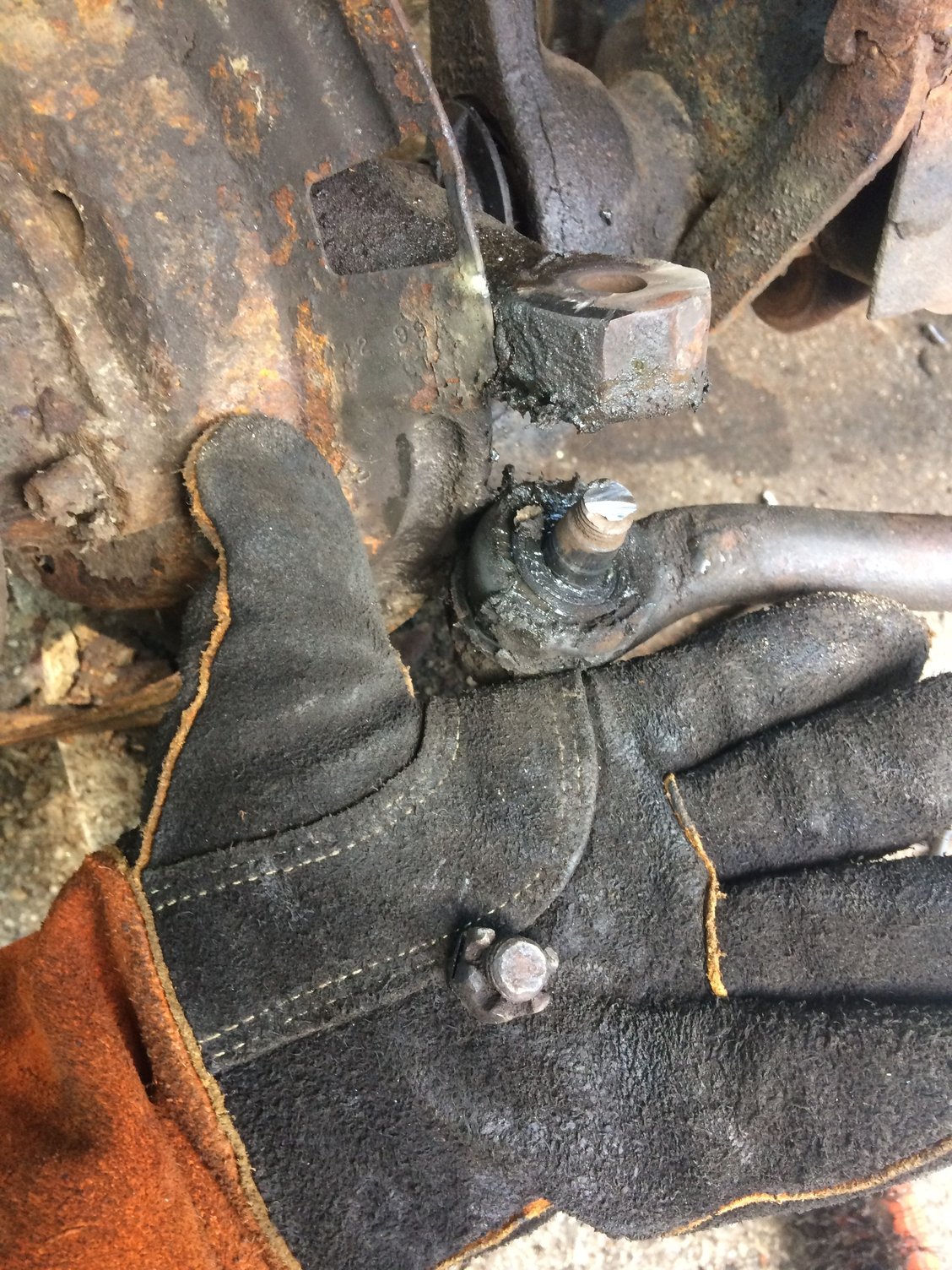 Next I removed my tie rod and drag link to prepare to replace them. I'm not super happy about replacing them with ZJ stuff because its still factory geometry but I need to do something about my bent stock rod. This stud on one of the TRE's was spinning with the nut. I wasn't in the mood to play footsies with it so I cut it right off and kept moving.