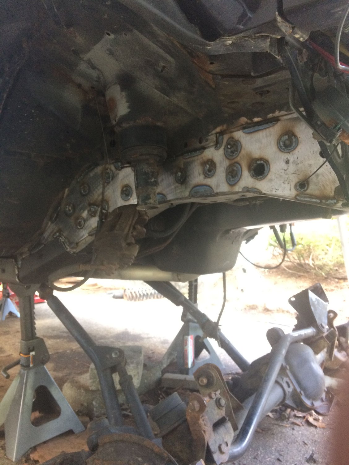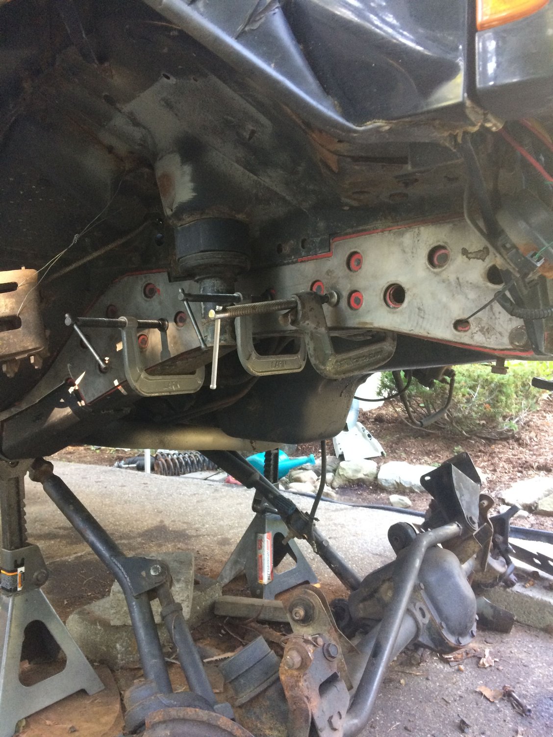 Next was getting my crossmember back on, which is never a fun task. Five of the six nuts that I welded to the stiffiners lined up fine but for some reason one did not. I bought a carbide burr for my die grinder and it ate right through the thick steel.
