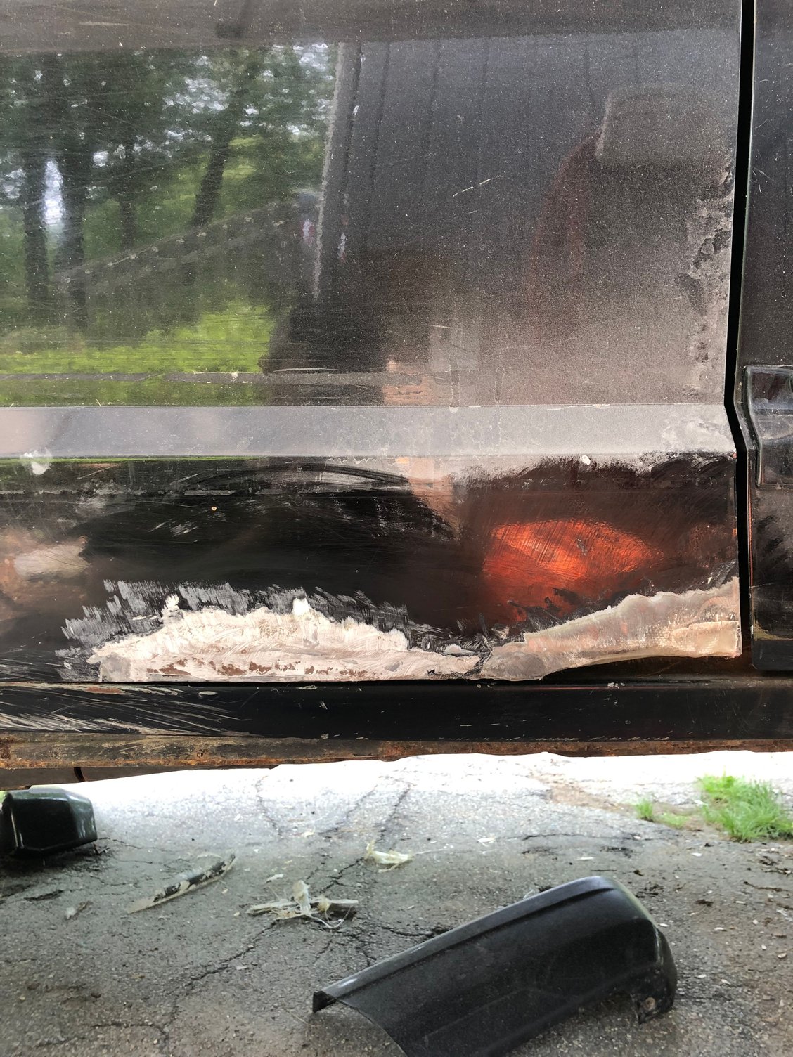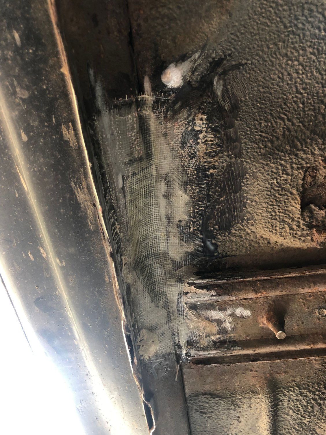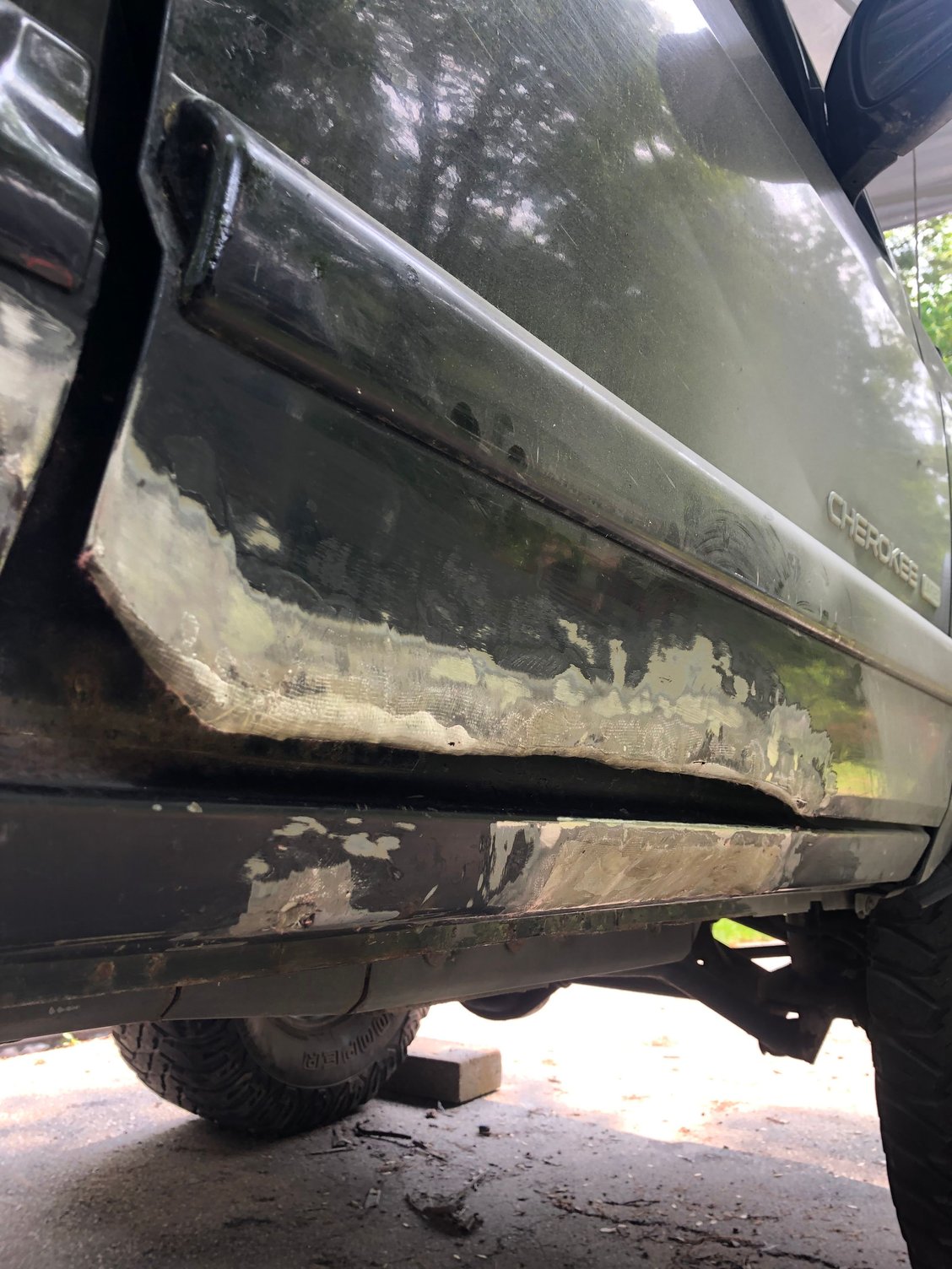 Rockers inboard of the pinch seam on both sides, outboard on passenger side, all 4 doors, and both lower quarter panels. None of this is news to me, just finally time to do something about it. Now, all of these locations I have plans for doing heavier modification to rather than just fixing. For example, I want to cut my rockers out past the pinch seam and replace with 2x6 that will sit high enough to require trimming the bottom of the doors. I also want to do a cut and fold on the rear quarters. However, this trip is in a week and I need a sticker now, so instead of starting more aggressive fabrication projects I instead fiberglassed over all the holes.