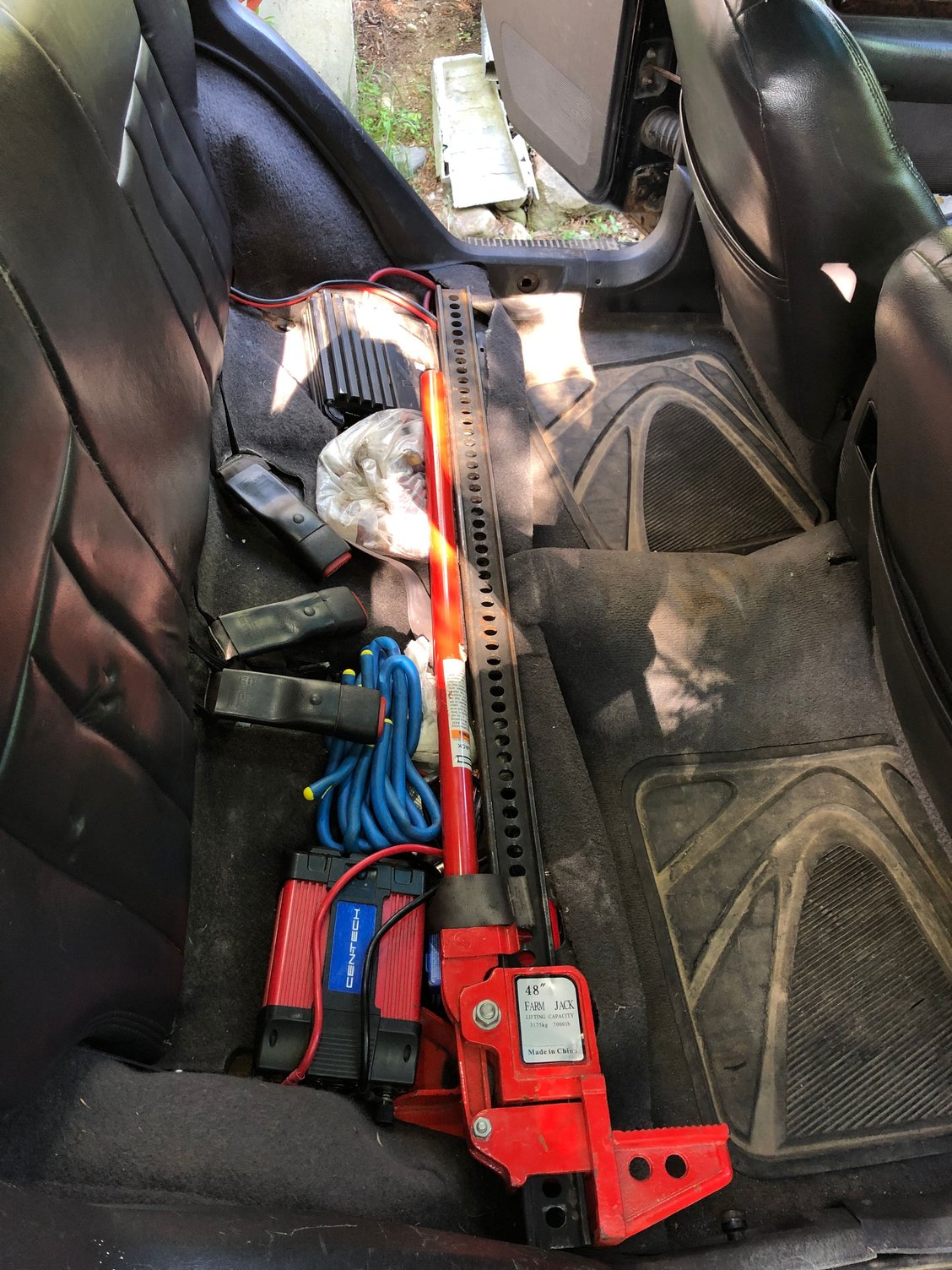 From there I got myself packed up. This is the first time in a long time I have the full interior back in the Jeep and cleaned out everything so I took the opportunity to pack some permanent things that will live in the Jeep. The items I brought are divided between Jeep stuff, be it recovery gear, spare parts, tools, and camping gear, like a canopy, folding table, etc. I started packing the Jeep gear because if all goes well I shouldn't need any of it. Under the rear seat I have spare parts (u-joints, belt, etc), a high lift, a small bug-out bag, and a power inverter I've never used.