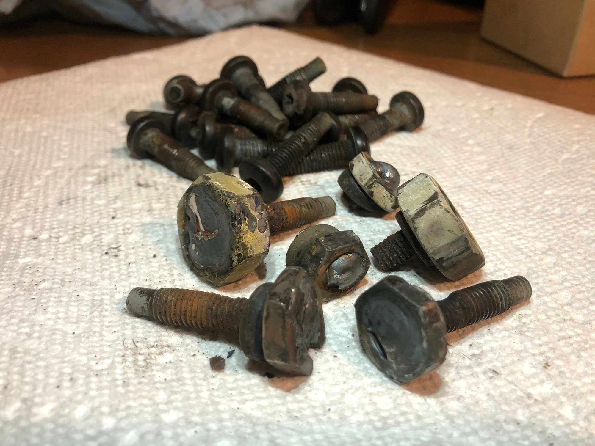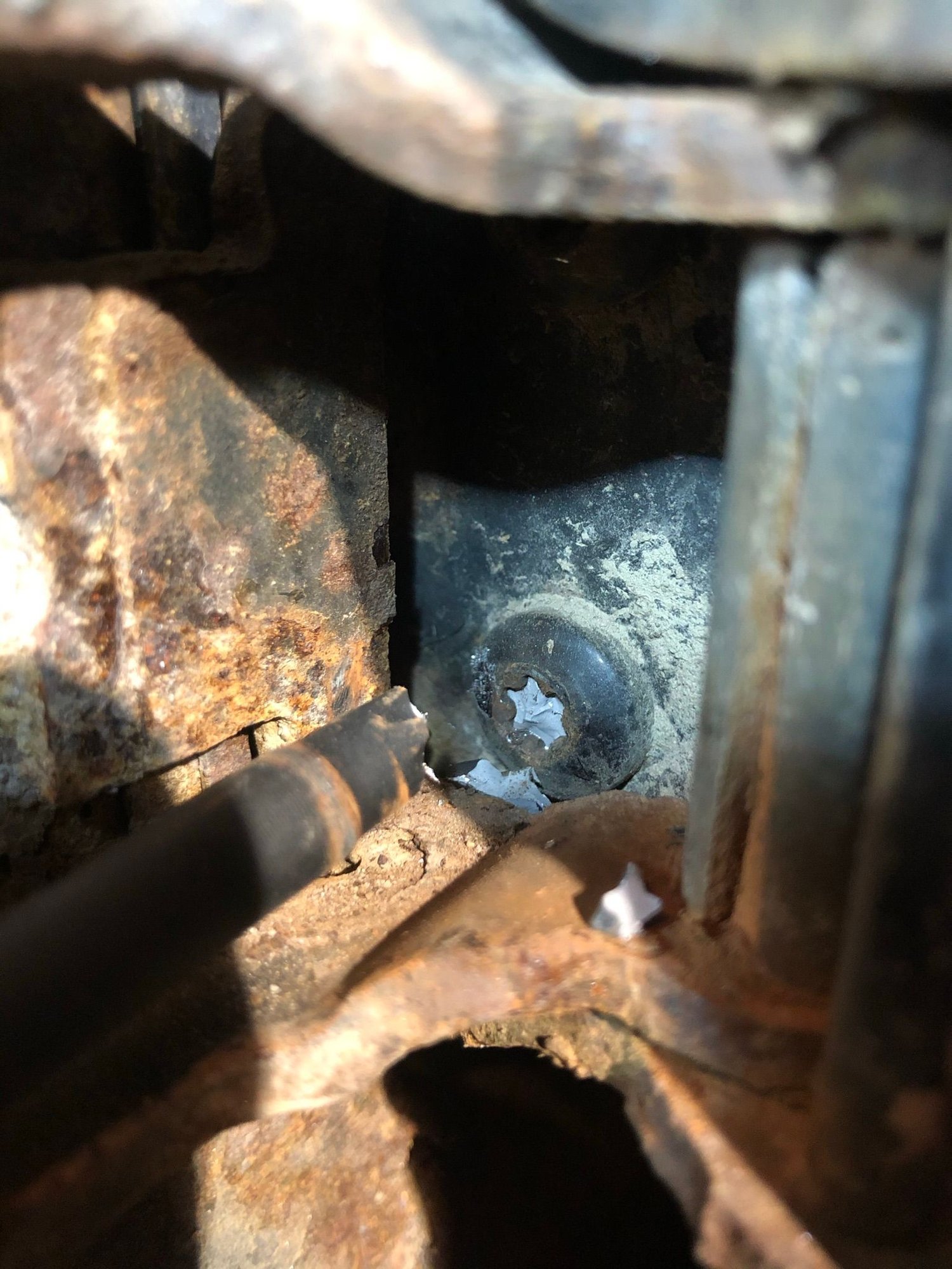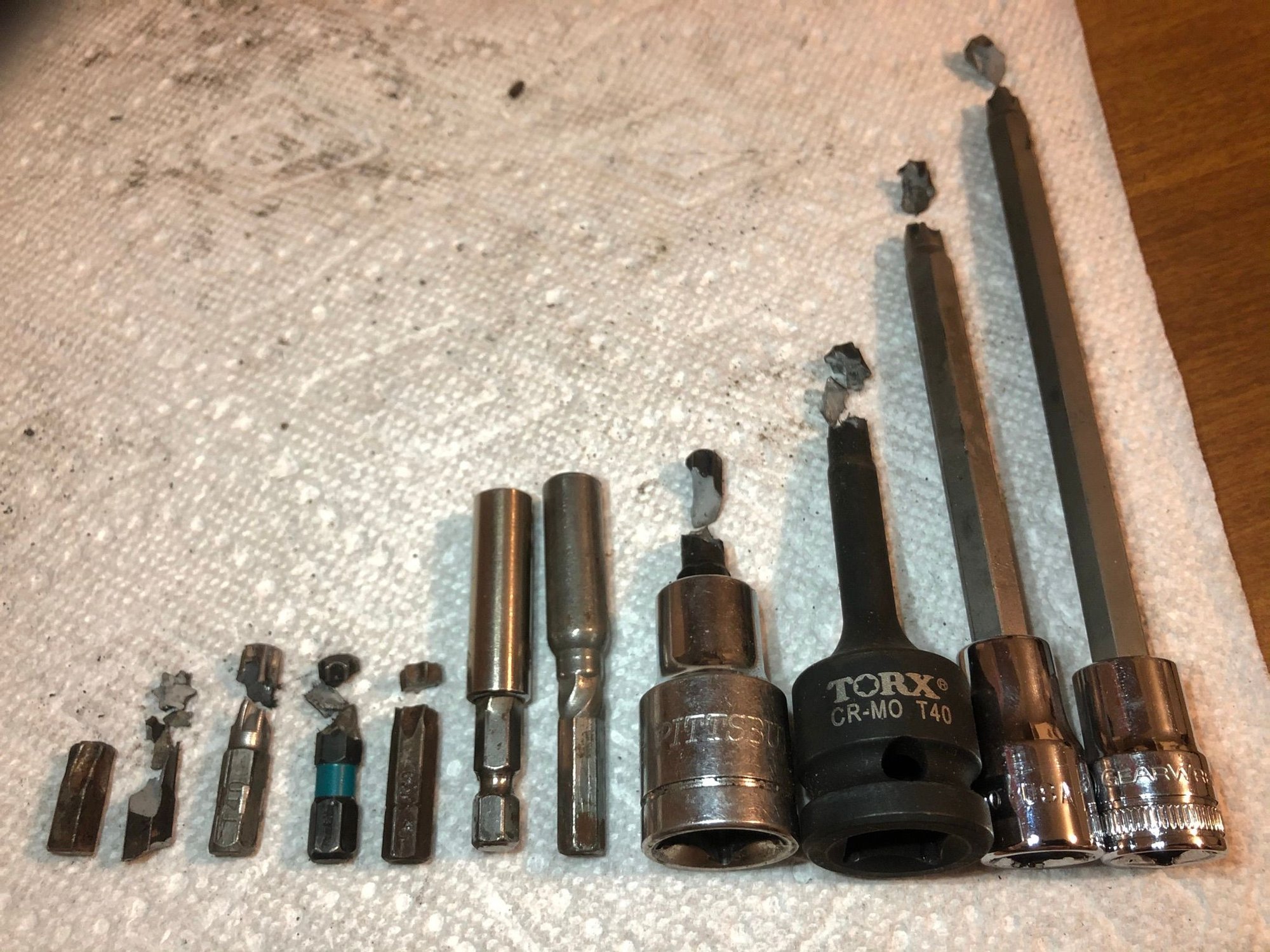 First step was to remove the doors. This didn't go well at all, because why would it? T-40 drivers are not beefy enough to deal with these door bolts that have been rusting into place for over 20 years. I managed to remove the first door with just a small pile of broken driver bits as a result.