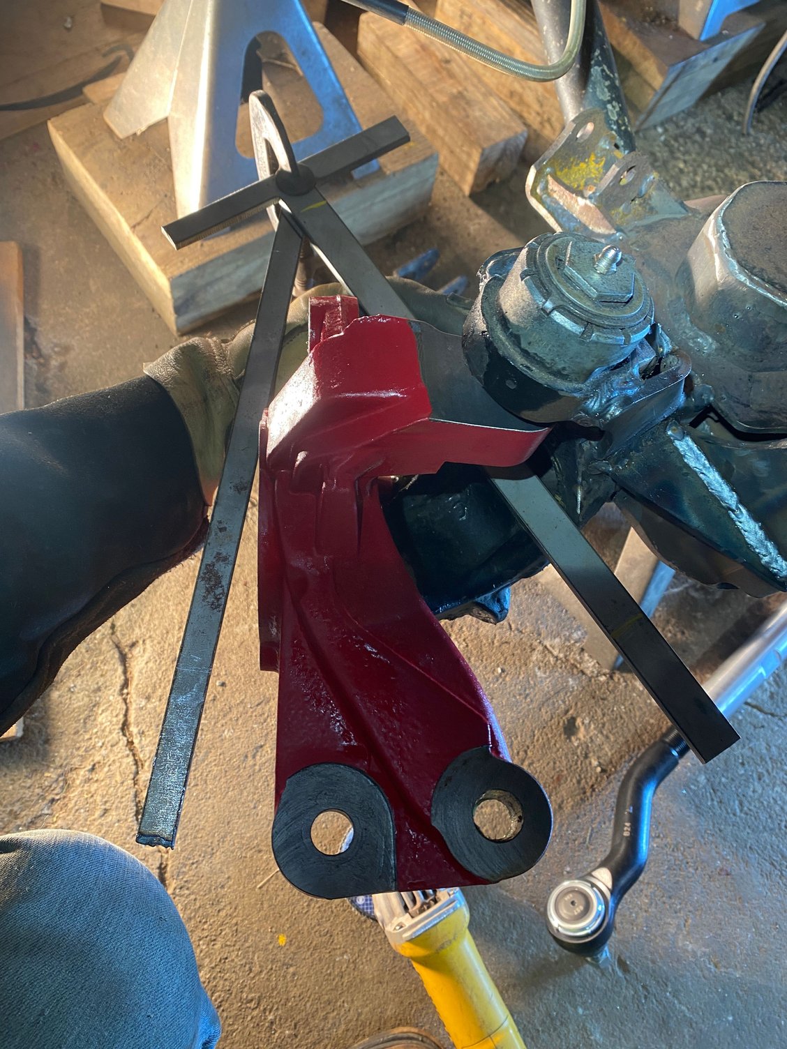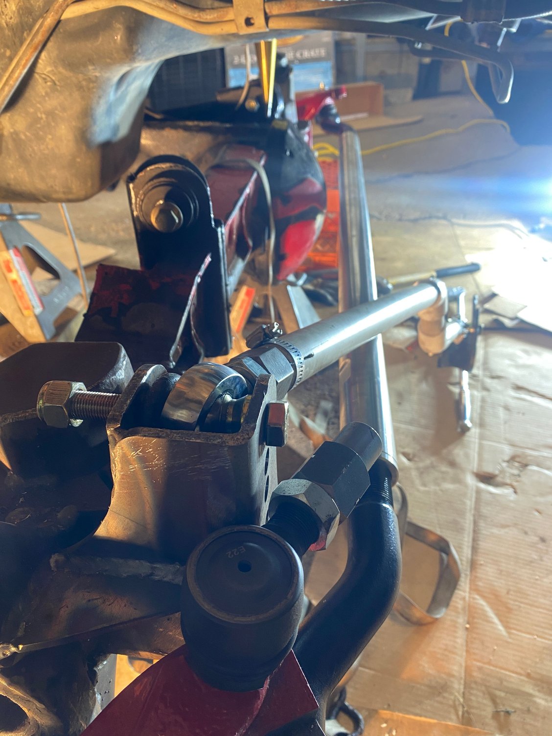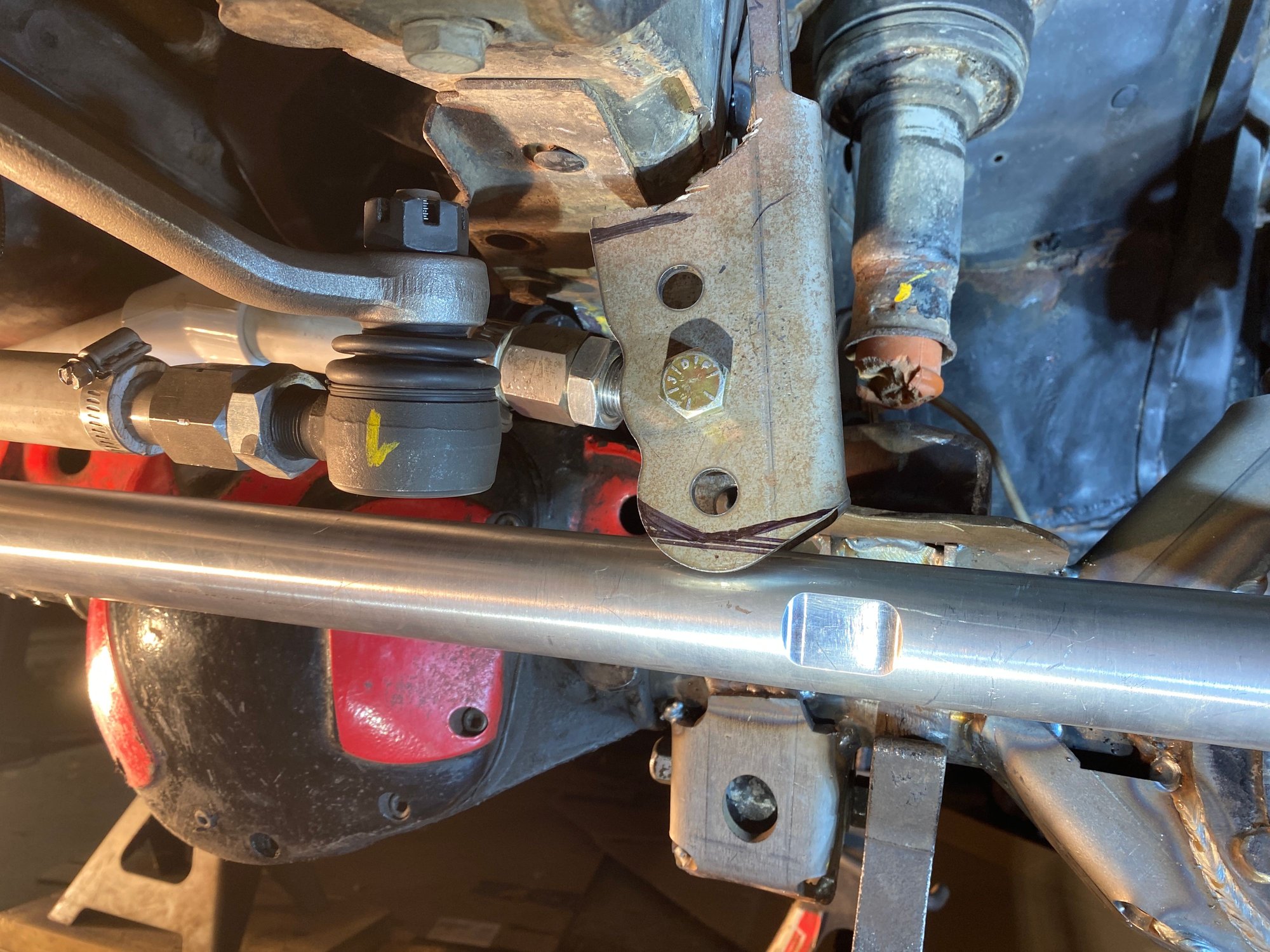 So, this is where I'm at currently. I will be searching around to see what I can find for offset tie rod ends, and worst case I'll have to bend the bar. Bending the bar might just be plan A. For the tie rod clearance, I should be able to just notch the bracket.