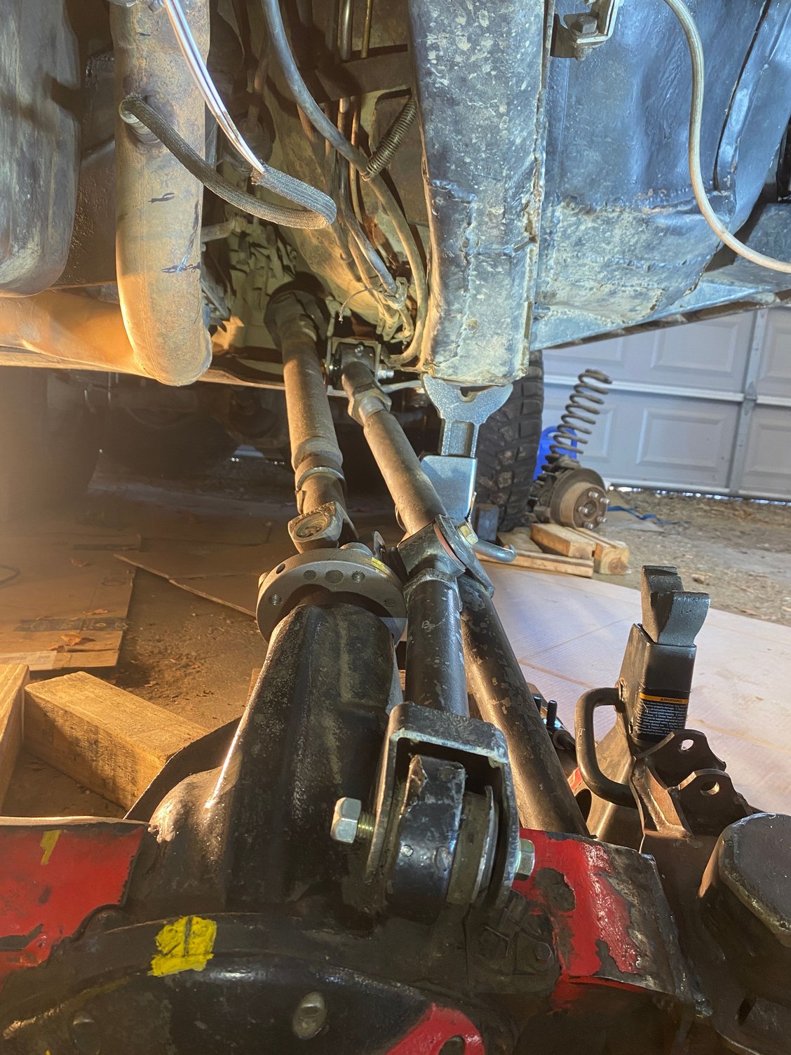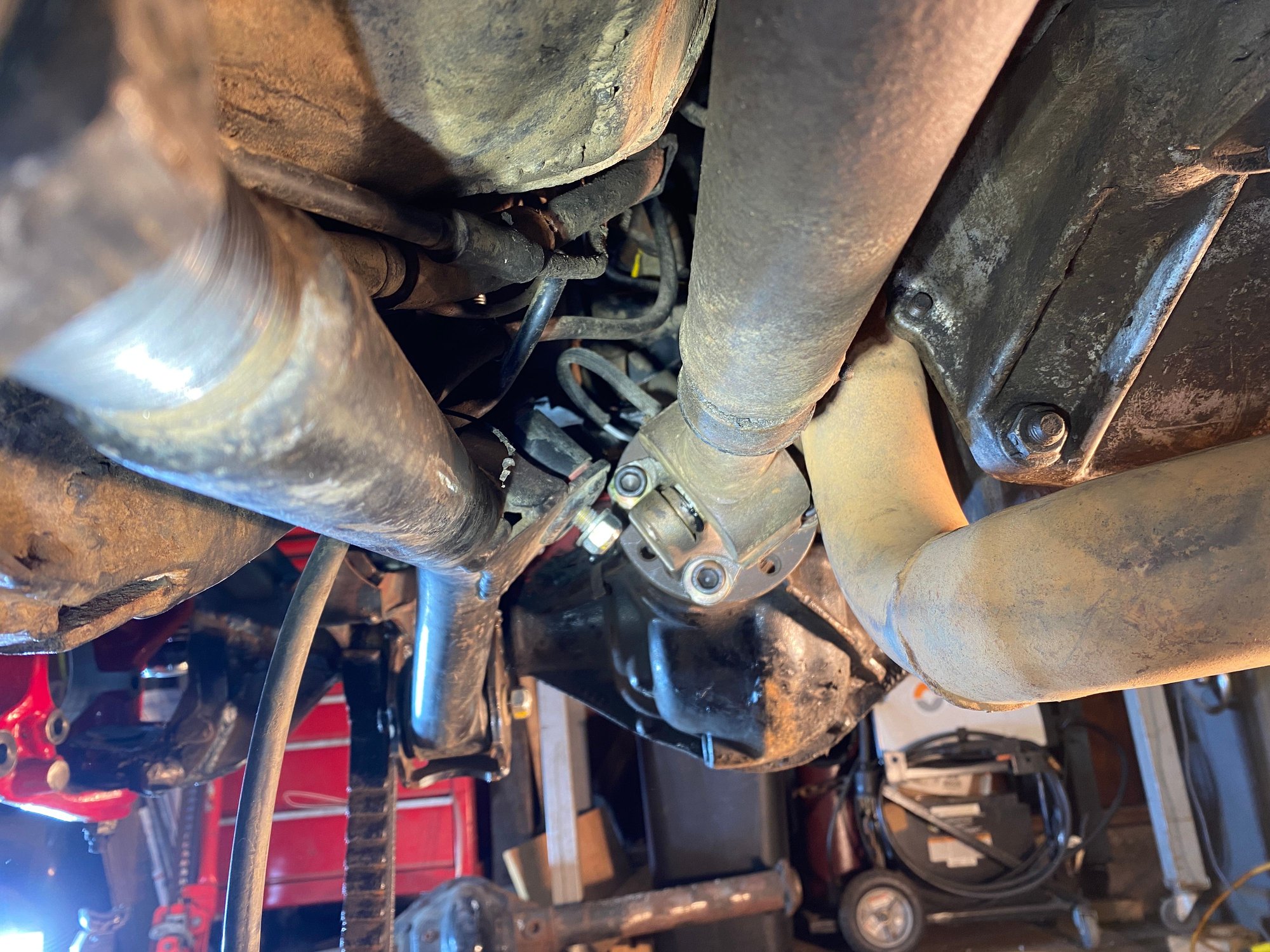 A little dent on the down pipe isn't gonna solve this. So, I have a couple options. One would be to cut the upper control arm mount off the lower arm and move it slightly, and also make a custom downpipe. The other is to swap from a pinion flange to a standard yoke and hope that it gives me the clearance I need. I wanted to stick with the flange rather than the yoke because I feel like its stronger, easier to work with, and my driveshaft length works out great with it. Its looking like at least trying it with a yoke is going to be the easiest path forward here. If that's all it takes to resolve the interference issues and the driveshaft length works out, I'll be feeling lucky.