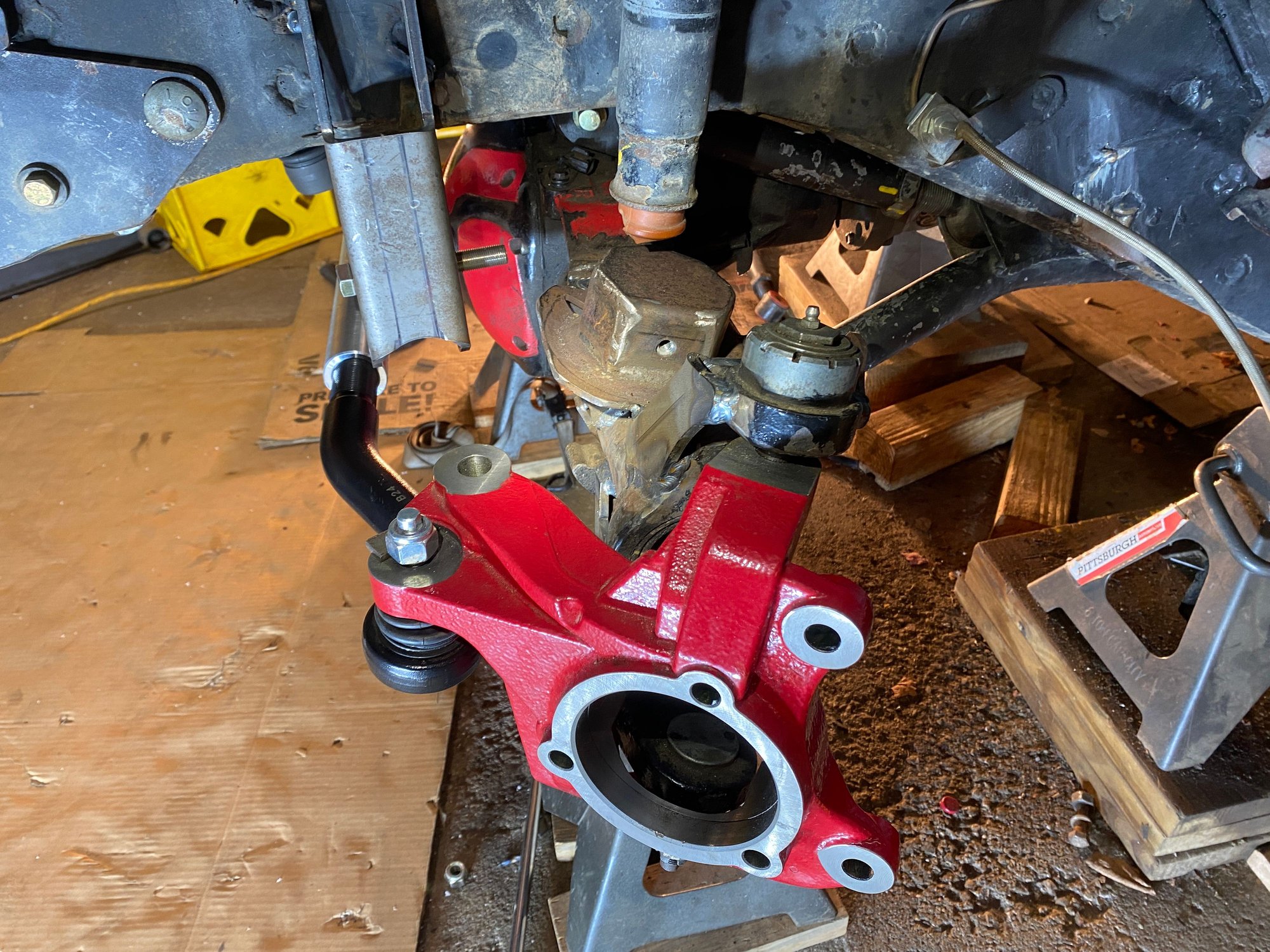 Checking clearances with the offset 1 ton tie rod end set into the knuckle had me feeling like a hero. There was the slightest sliver of clearance between the joint and the track bar bracket. Looked like the drag link might rub a bit on the head of the bolt, but I was confident I could make this work. It was too perfect.