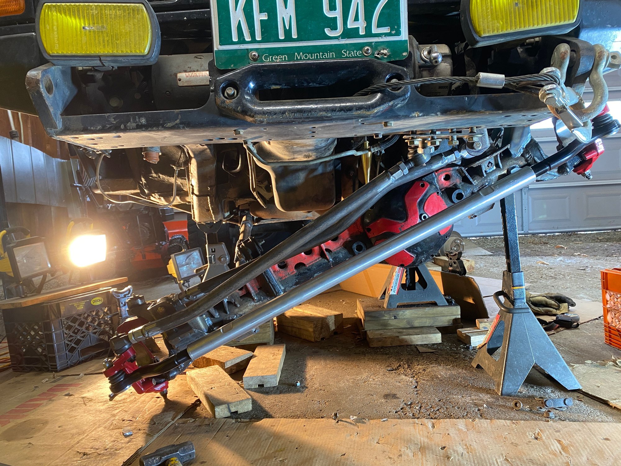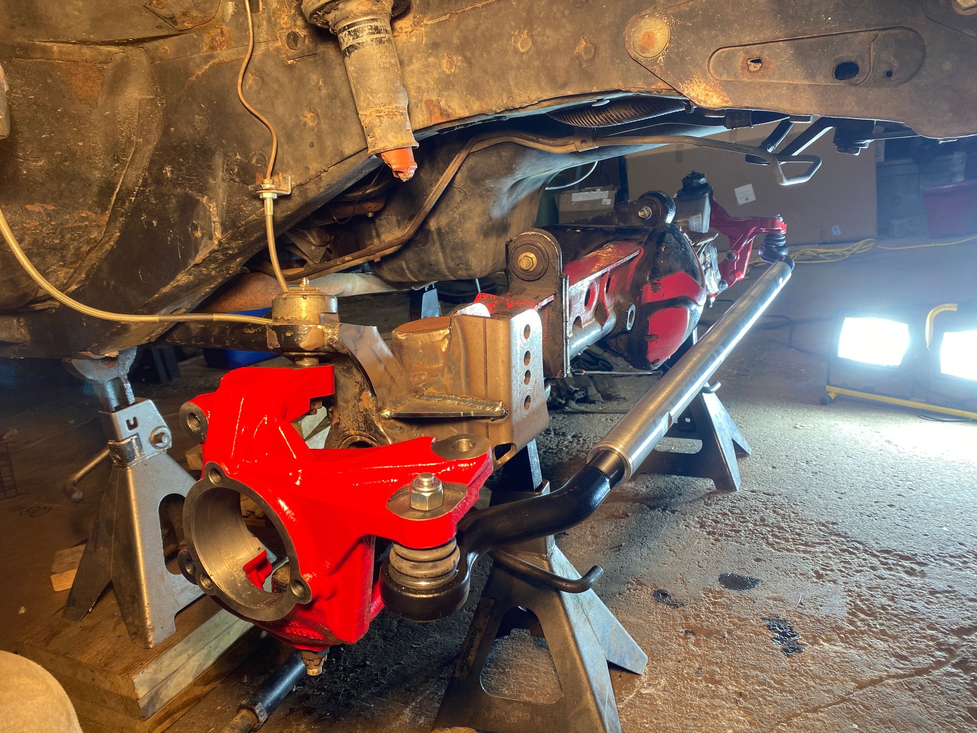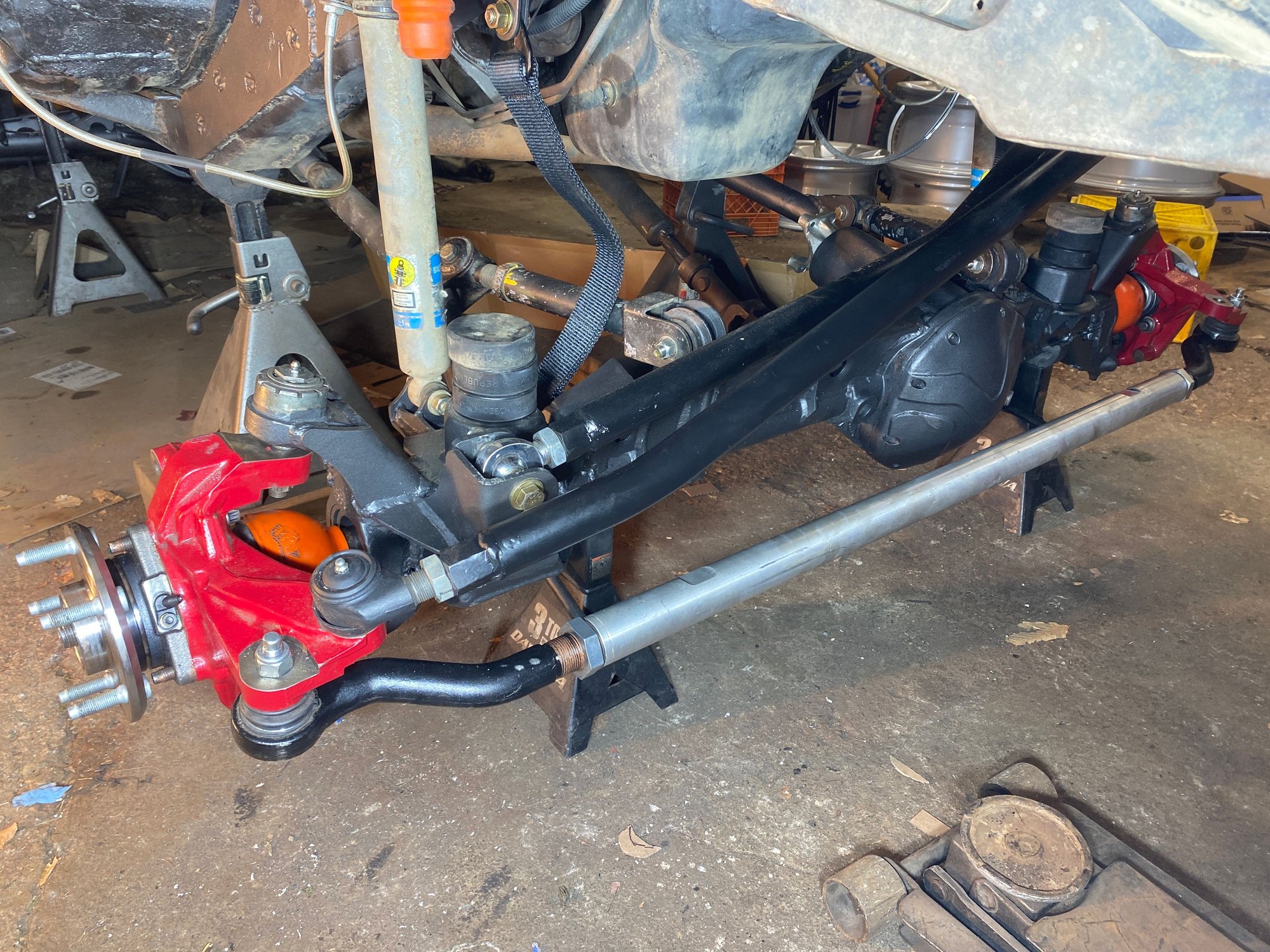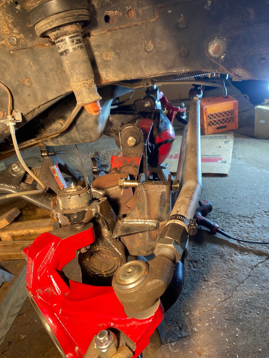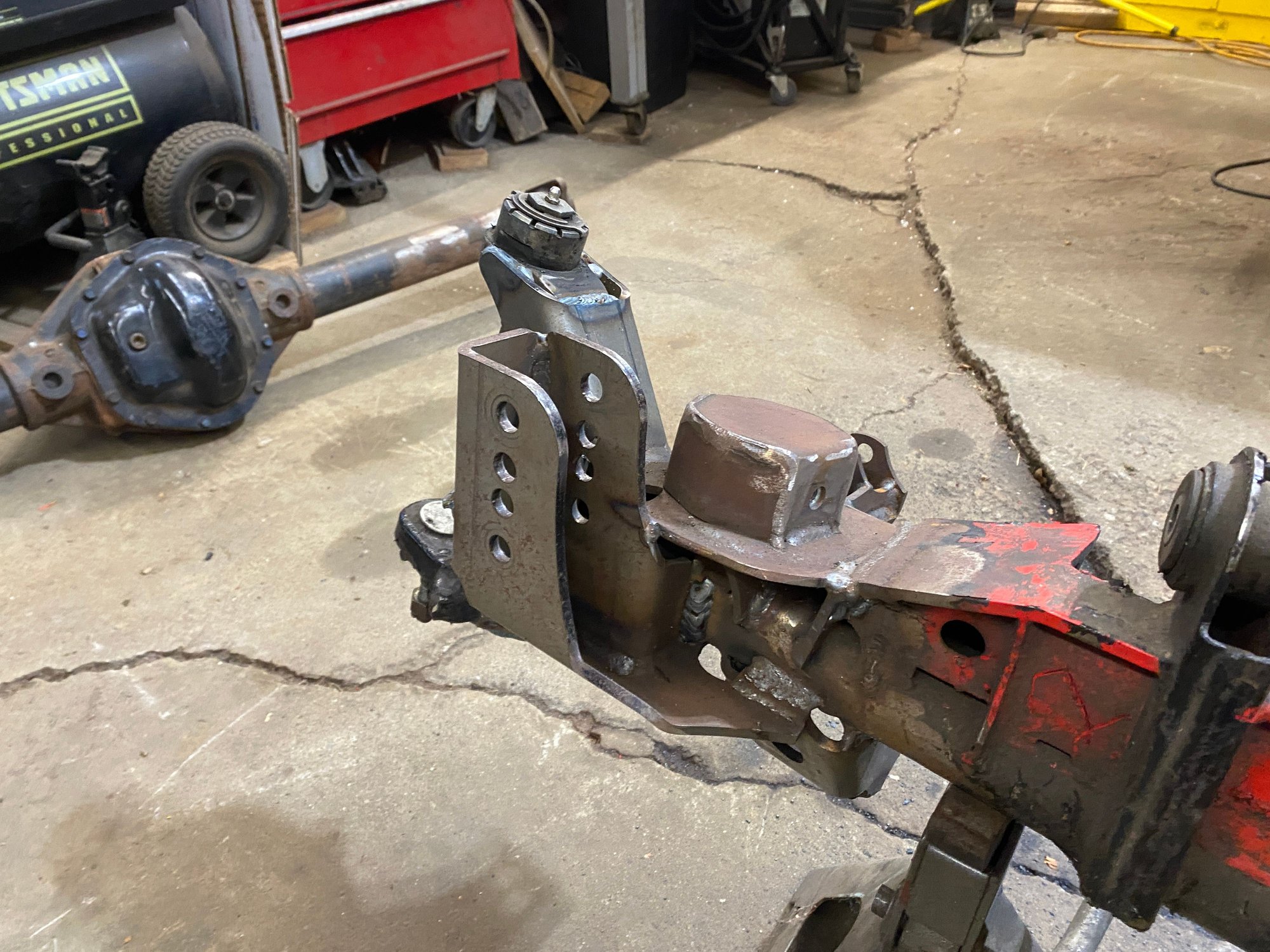I got the 44 placed back under the front and have the control arms bolted up. I set my wheelbase / thrust angle by measuring the distance from the front leaf spring bolt to the axle tube, and got the axle centered and set at ride height. My thought for order of operations is to get my steering setup finalized so I can then place the frame-side track bar mount to match the drag link.