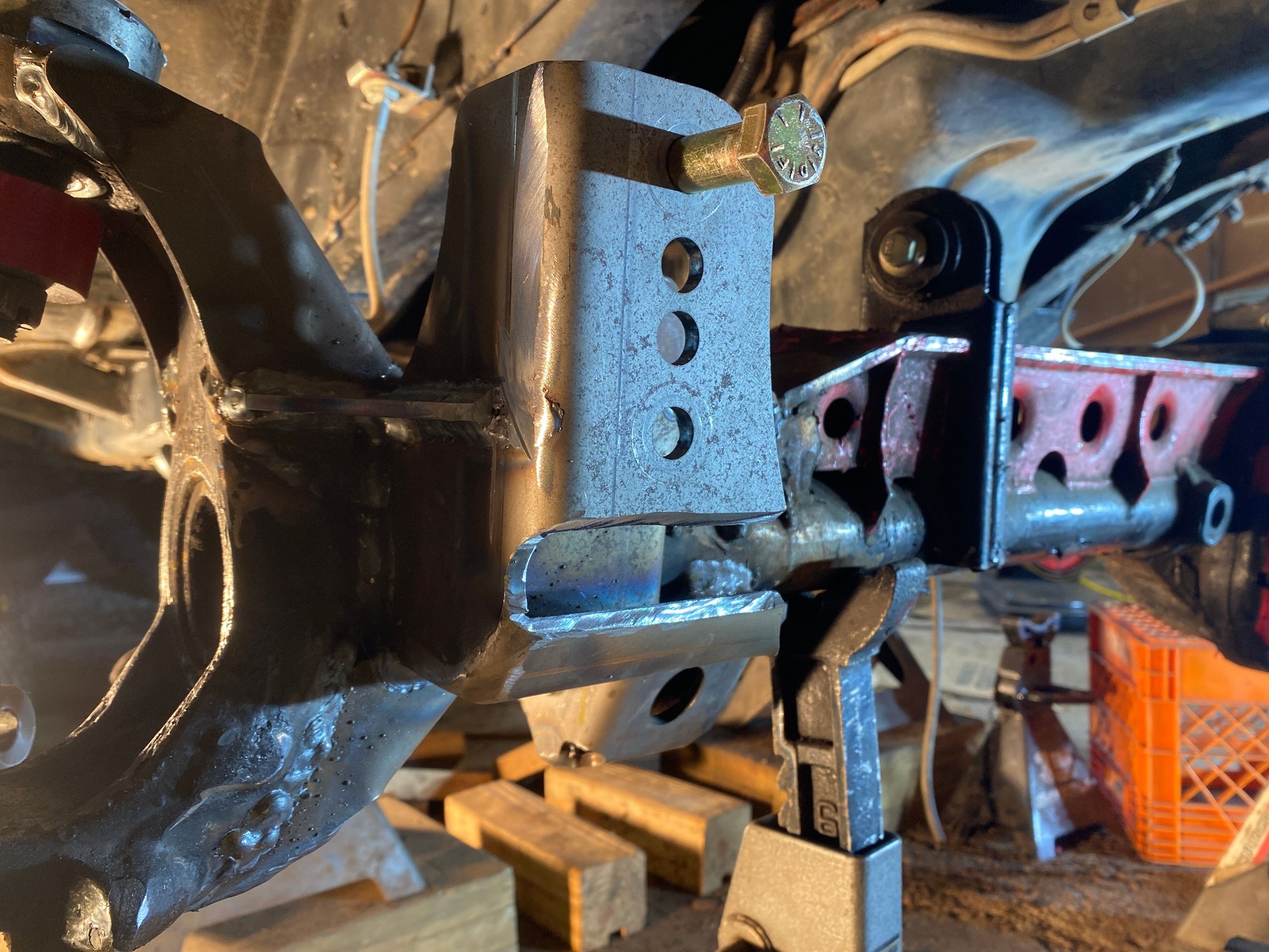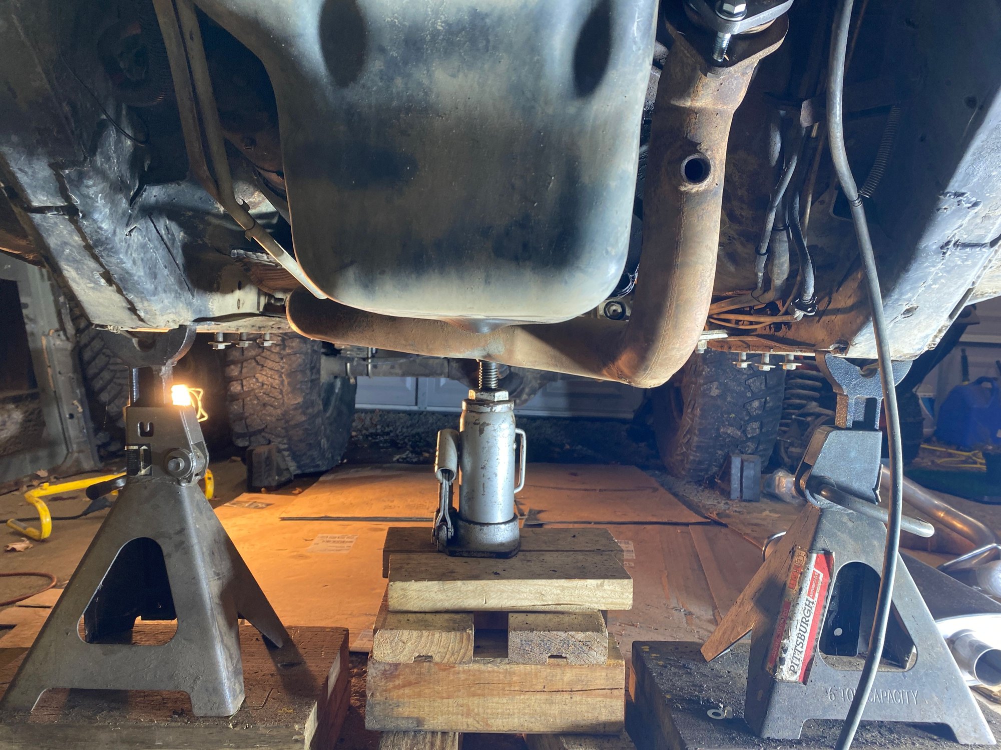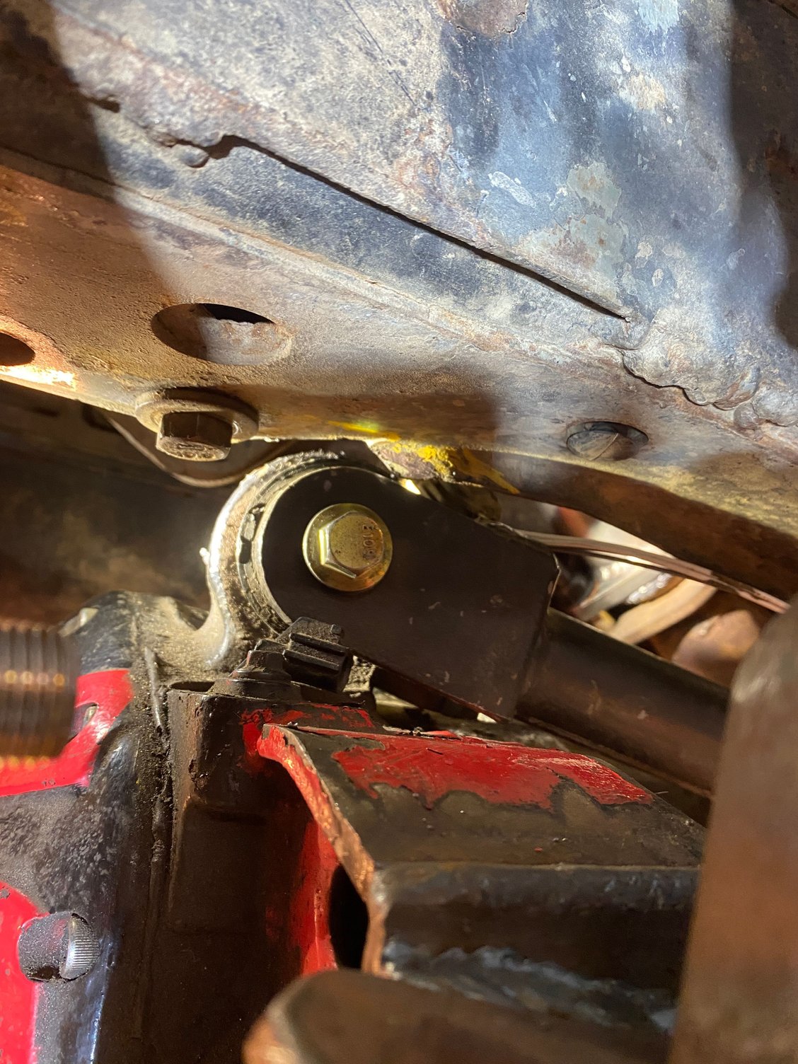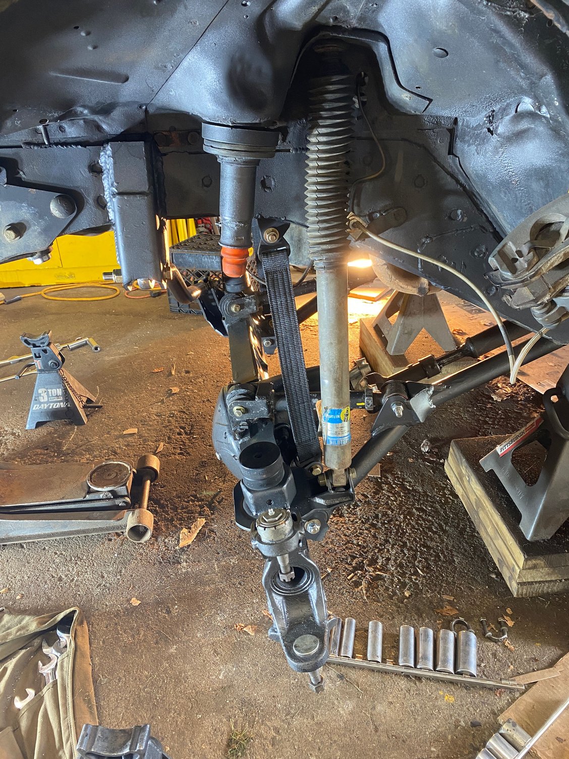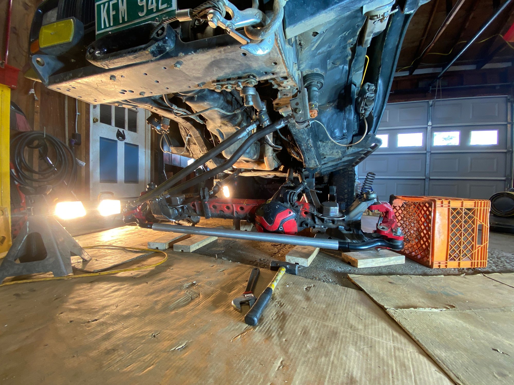 I got the 44 placed back under the front and have the control arms bolted up. I set my wheelbase / thrust angle by measuring the distance from the front leaf spring bolt to the axle tube, and got the axle centered and set at ride height. My thought for order of operations is to get my steering setup finalized so I can then place the frame-side track bar mount to match the drag link.