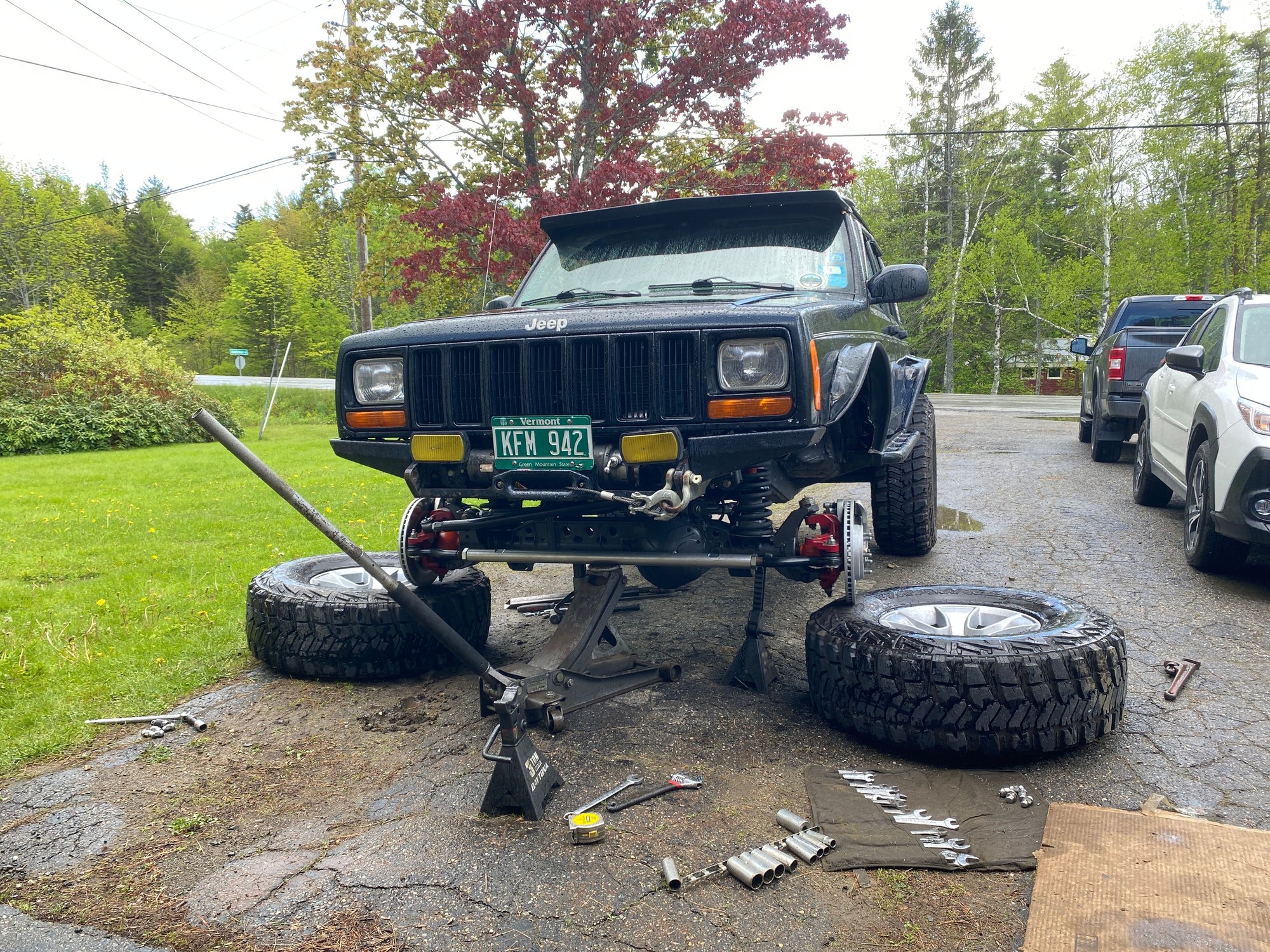 All that said, this thing still is an old lifted Jeep. These tires are LOUD, as is everything else. Exhaust is fairly quiet though. I'm questioning if I'm getting a drone from my front end, but honestly I can't hear anything over the tires and the entire interior rattling/squeaking/resonating. With the big drivetrain upgrade done, I'm hoping to fix up the interior a bit this year to make it more comfortable. I also am going to brainstorm ways to move my rear axle back another inch, and drop the lift more. Also I am taking opinions on what color to paint these wheels.