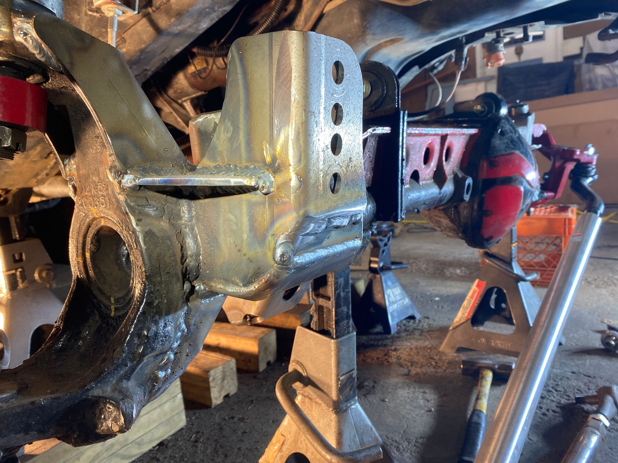 With the exhaust and all supporting hangers and mounts refreshed, I moved my attention back to the axle swap. Here are some pictures with everything welded on. New lower control arm brackets, coil buckets/shock mounts, track bar mount, and C gussets.