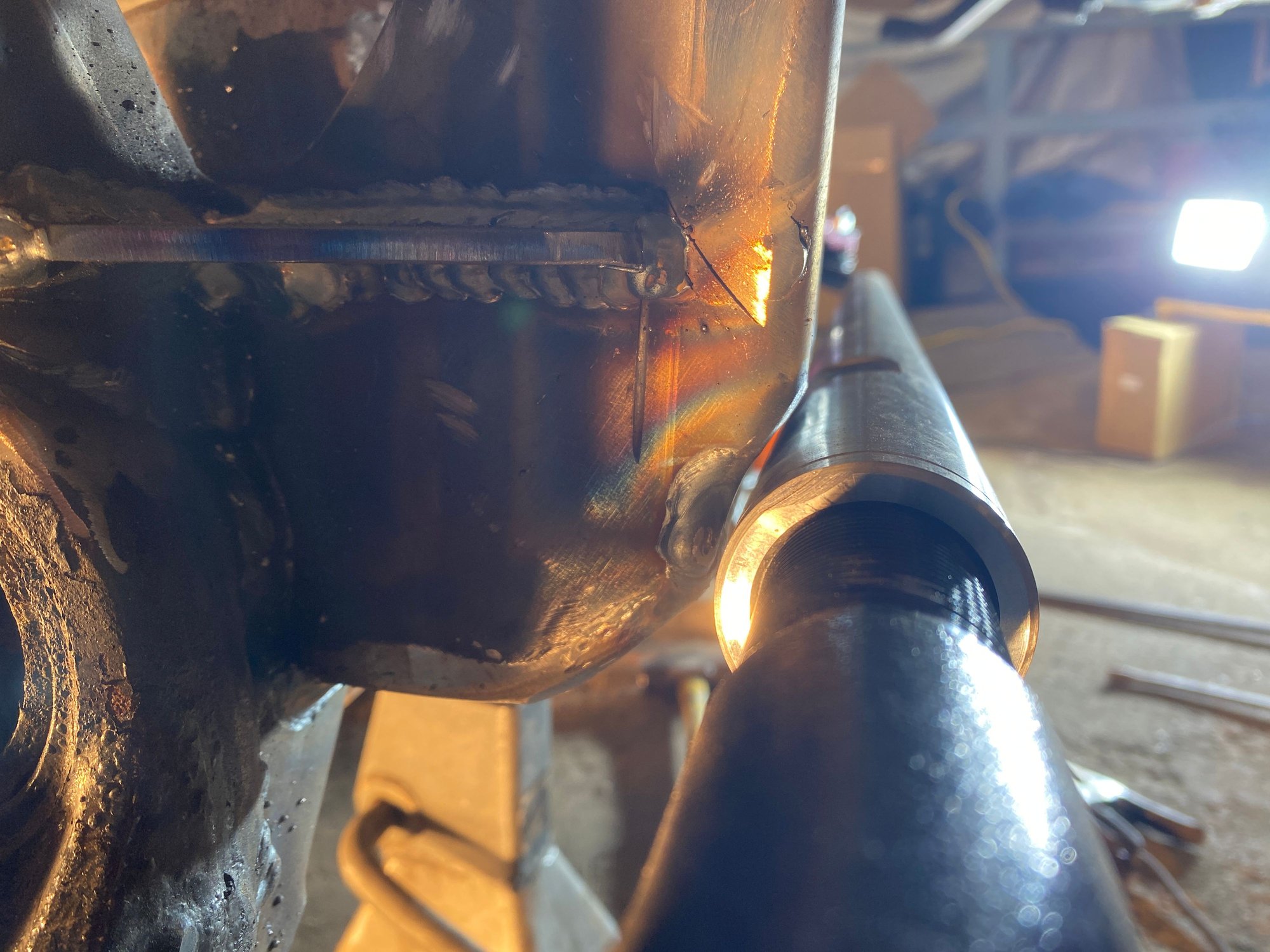 Got my truss burned on and leaf perches placed. First time ever welding to cast. It was interesting. I preheated the pumpkin to ~400°F, welded, peened, post-heated, and wrapped in a blanket. Everything seemed to come out pretty good. I mocked the axle up under the weight of the rear end to verify pinion angle before burning the perches in, and it was a good thing I did.