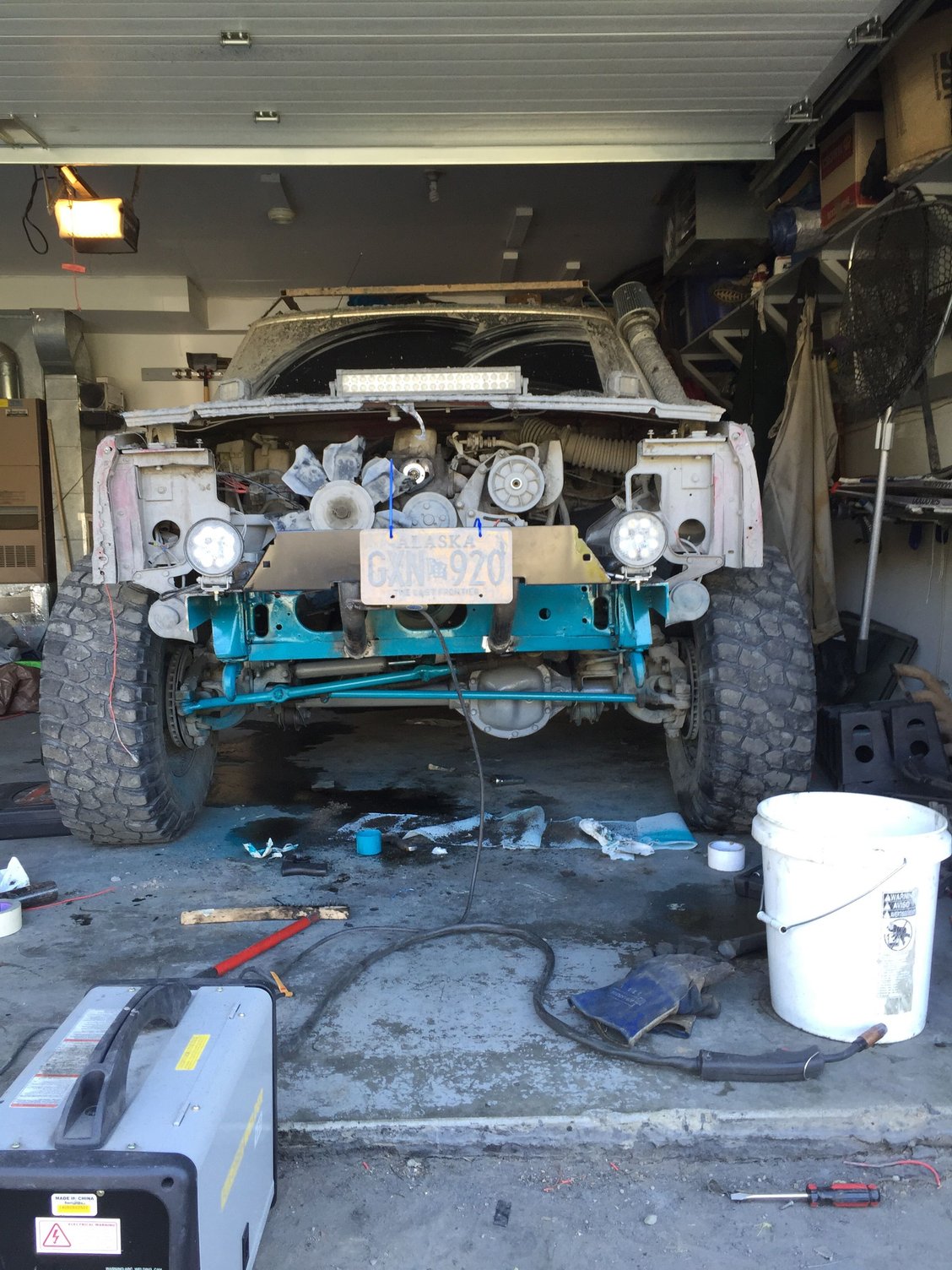 Finally got around to takin all the oil off all of the front end components and painted em. Then tied in some tubing from the bumper to a hefty piece of angle iron that runs from frame rail to frame rail below the existing piece. Hopefully have the motor in this weekend if I can get the rest of the parts I need