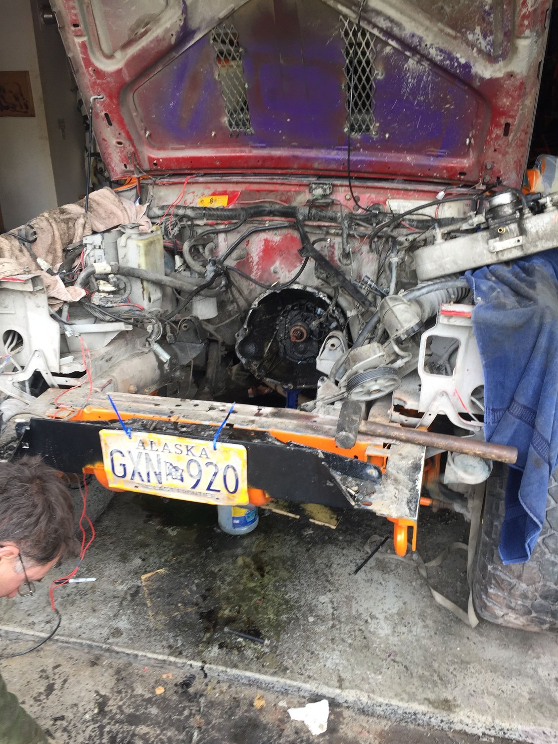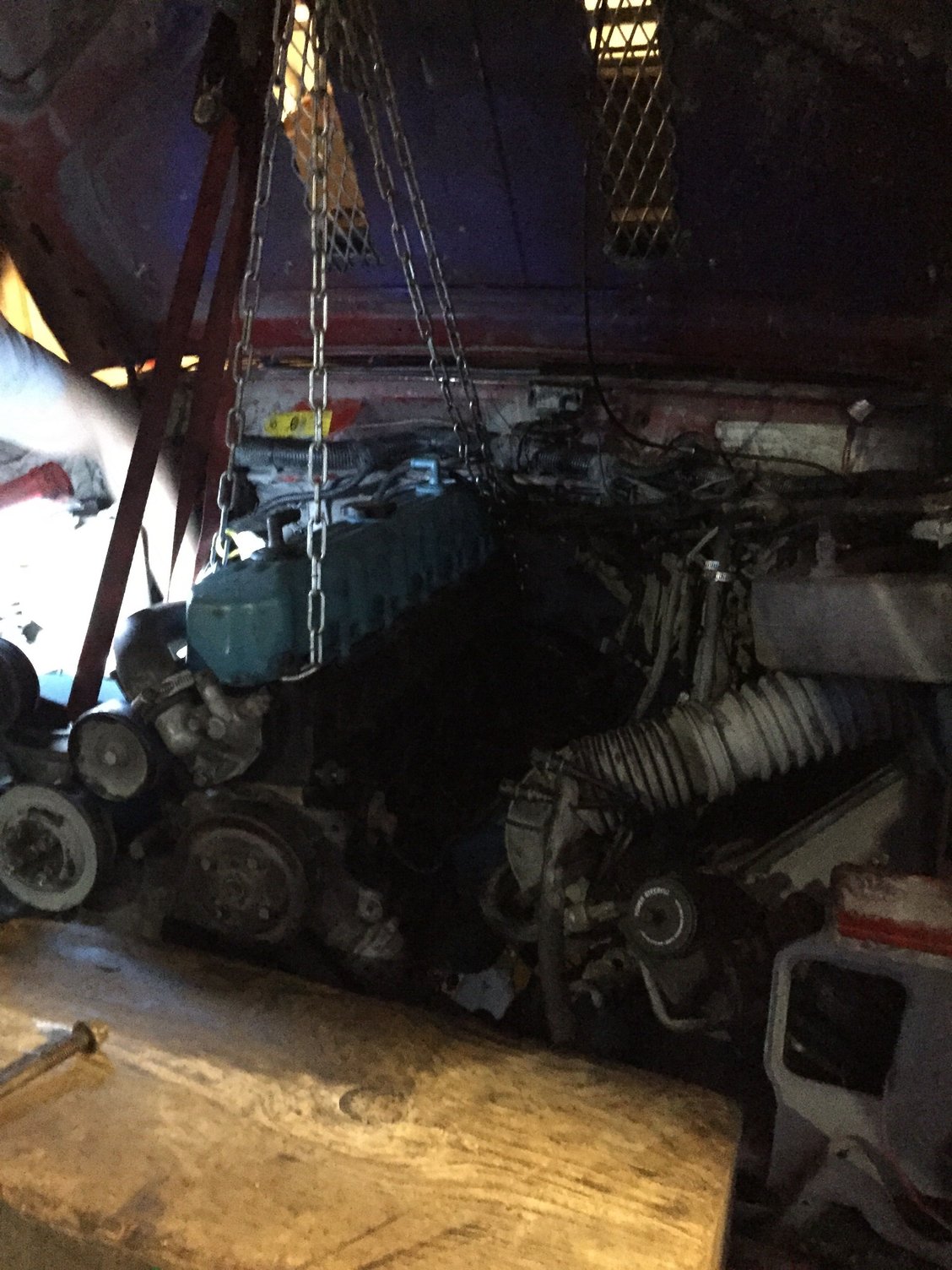 <br />Down to the last 2 bolts holding in the motor.. Having to get a lil creative as the top 2 bolts are hanging on for dear life.. Also a side shot of the half that's painted for those that asked!<br />