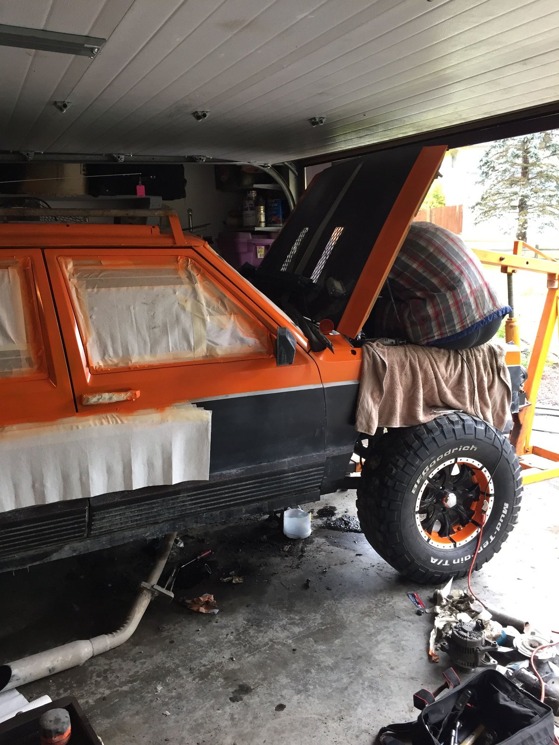 Down to the last 2 bolts holding in the motor.. Having to get a lil creative as the top 2 bolts are hanging on for dear life.. Also a side shot of the half that's painted for those that asked!