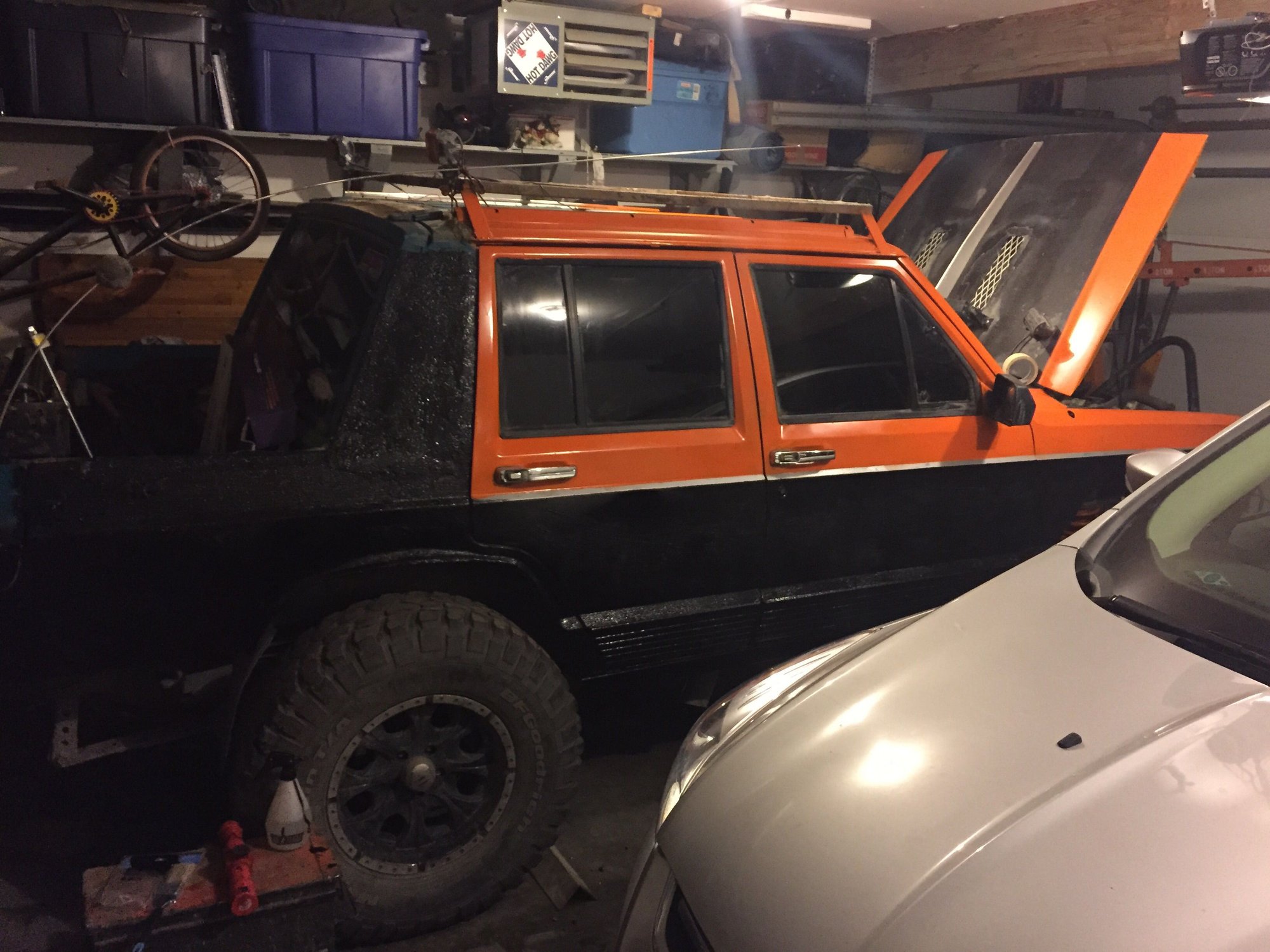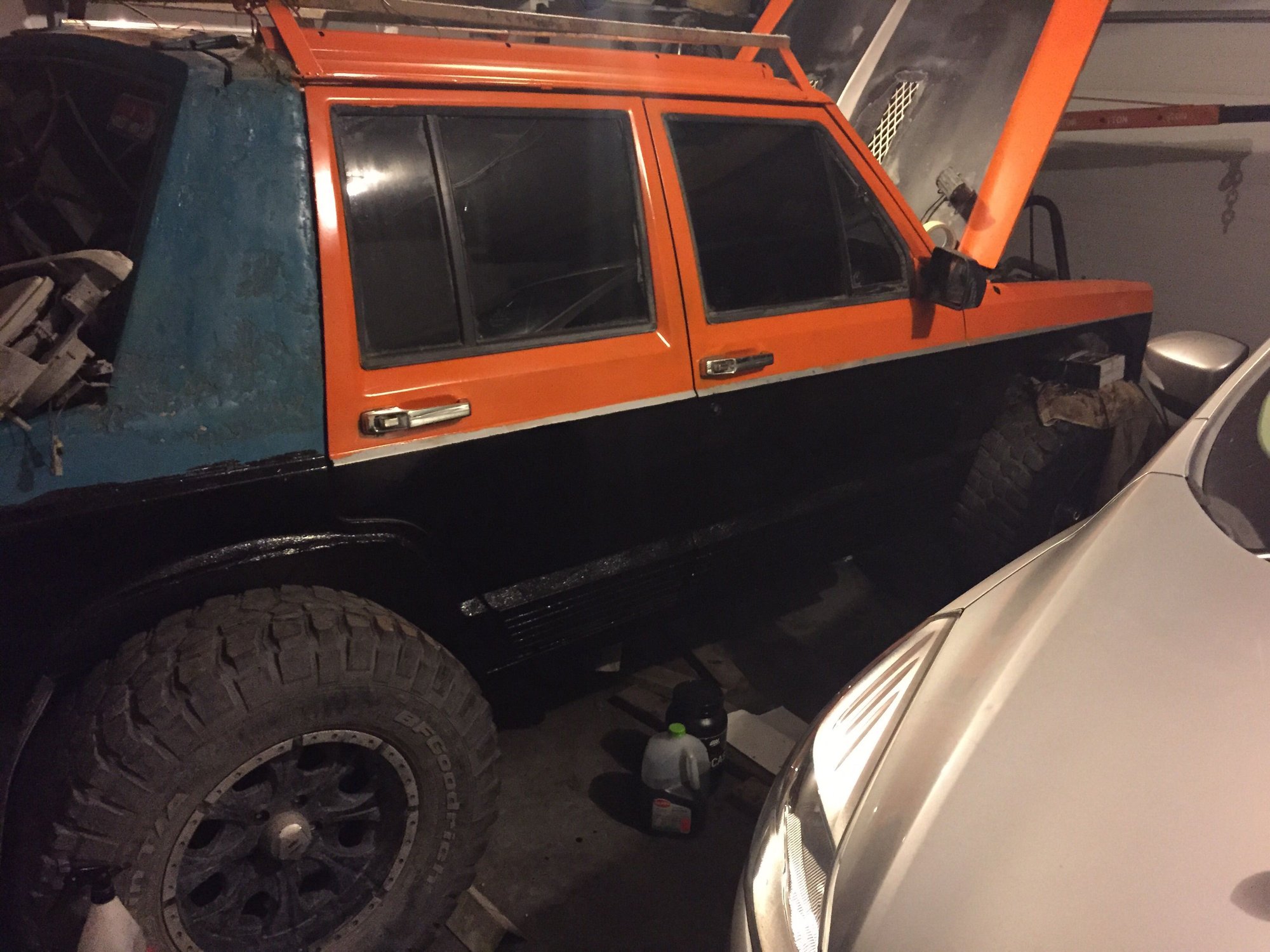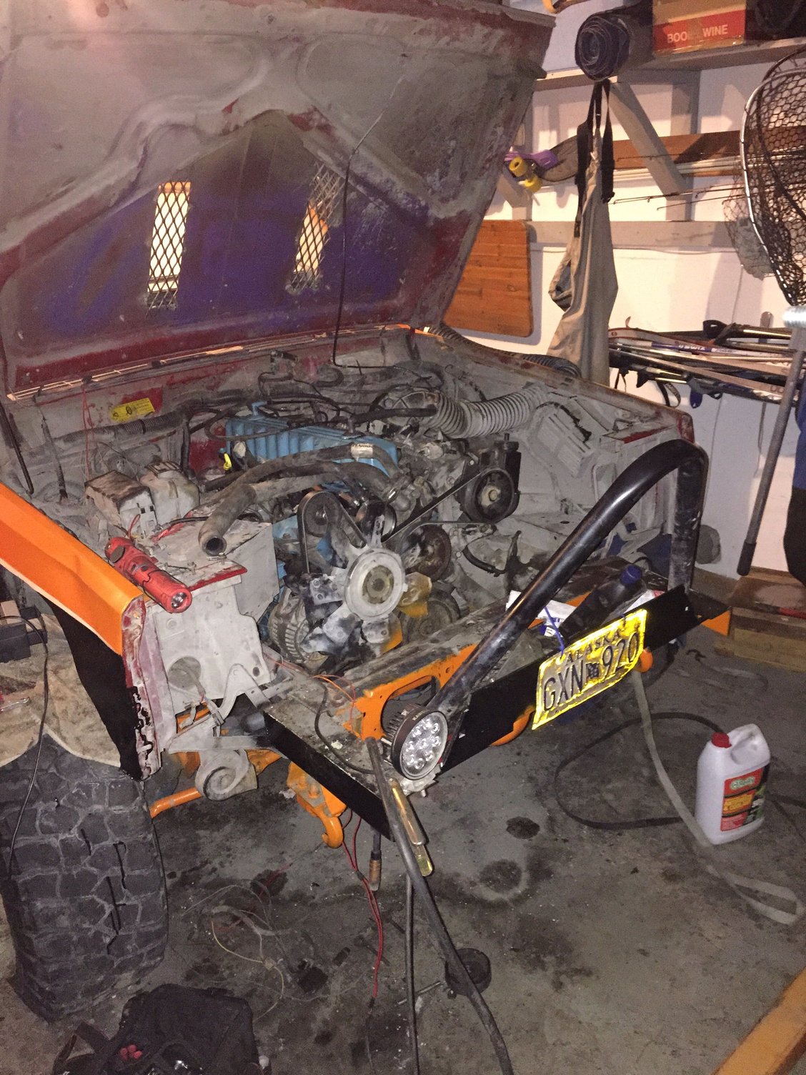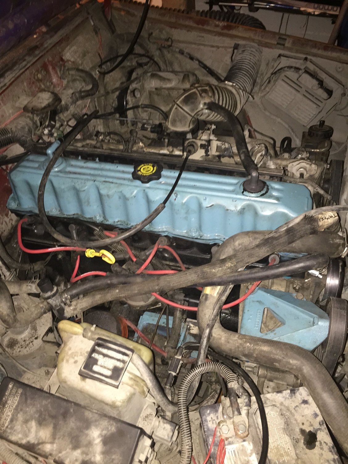 pretty stoked on that. Hooked up the heep to paws truck to see if we could get her to roll over since my battery is beyond dead and needs to be replaced. However, while the motor cranked it didn't wanna start. Thinking I might have an air bubble in the fuel lines, or I'm not getting spark from the plugs. Imma start by replacing the battery and wires (as the plugs are new) and see what we get from there!