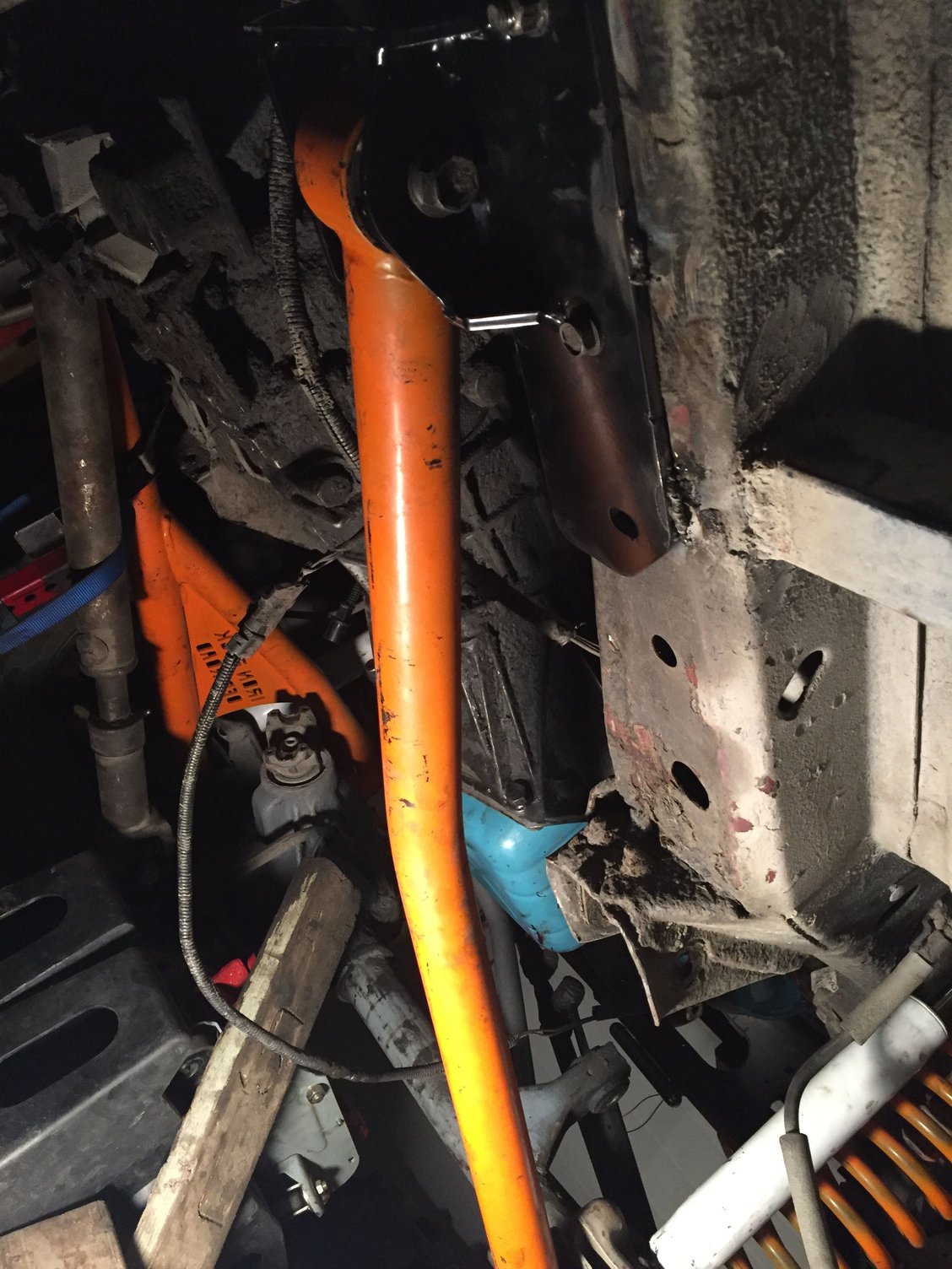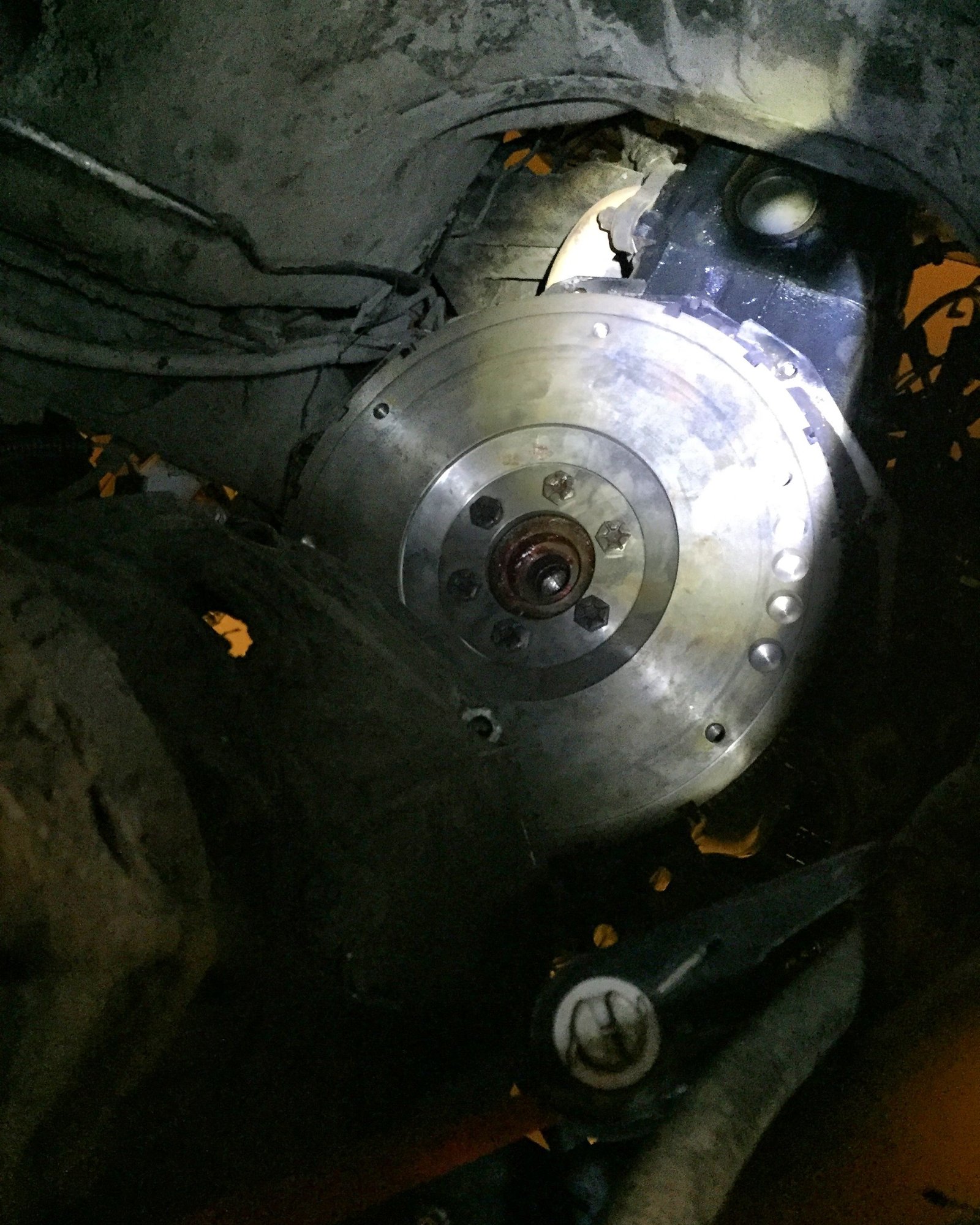 Trans and tcase dropped enough to get to the flywheel. Clutch and pressure plate pulled off, now to figuring out how I'm gonna snap the fly wheel bolts loose haha