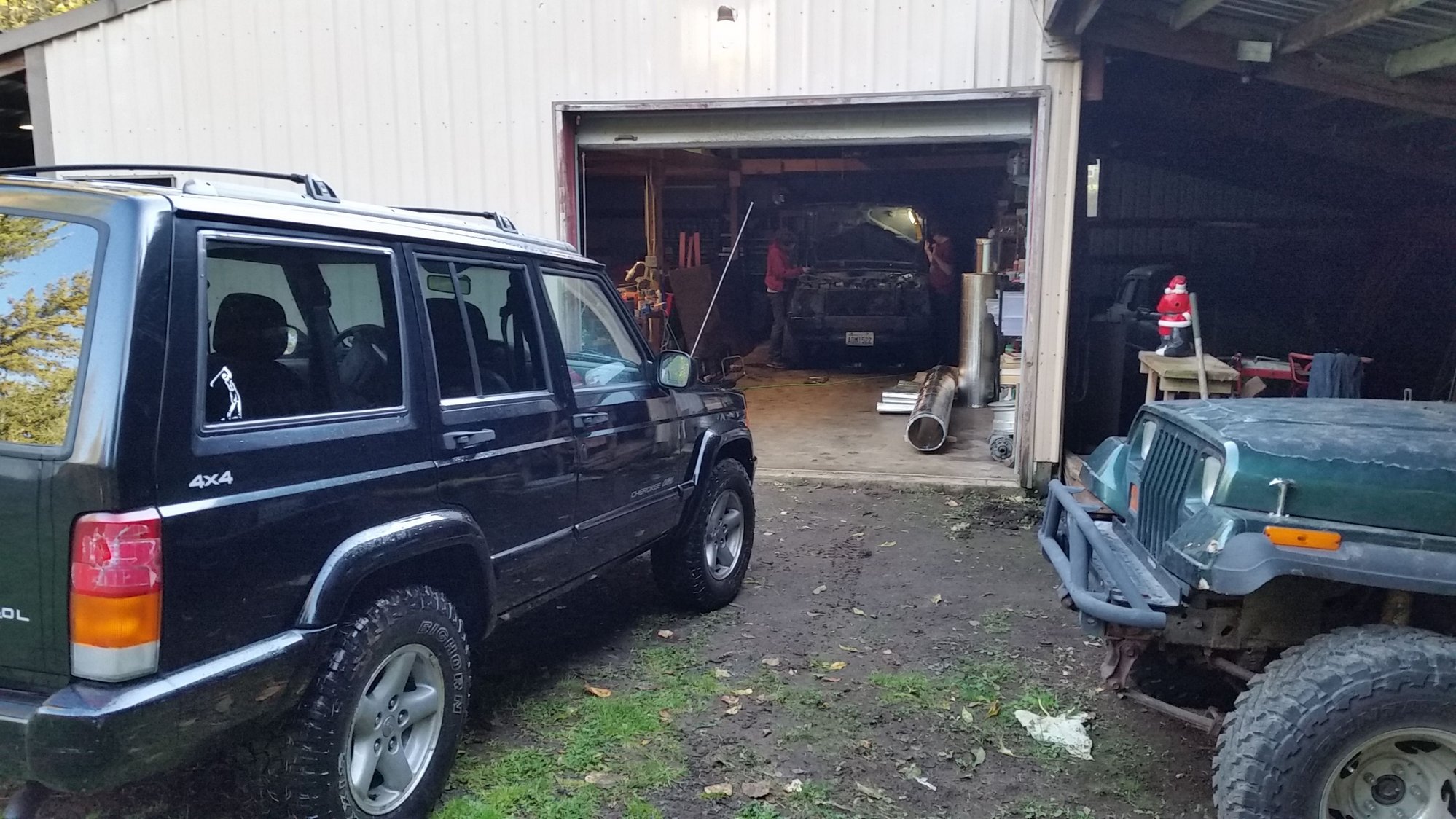 I was supprised at how nice the paint looked Looks good even with the broken tail light. Got the vines out of the grill I know its wet but even dry it looks damn good I took her down to the shop to introduce her to my 93 YJ and my wive's 99 XJ.