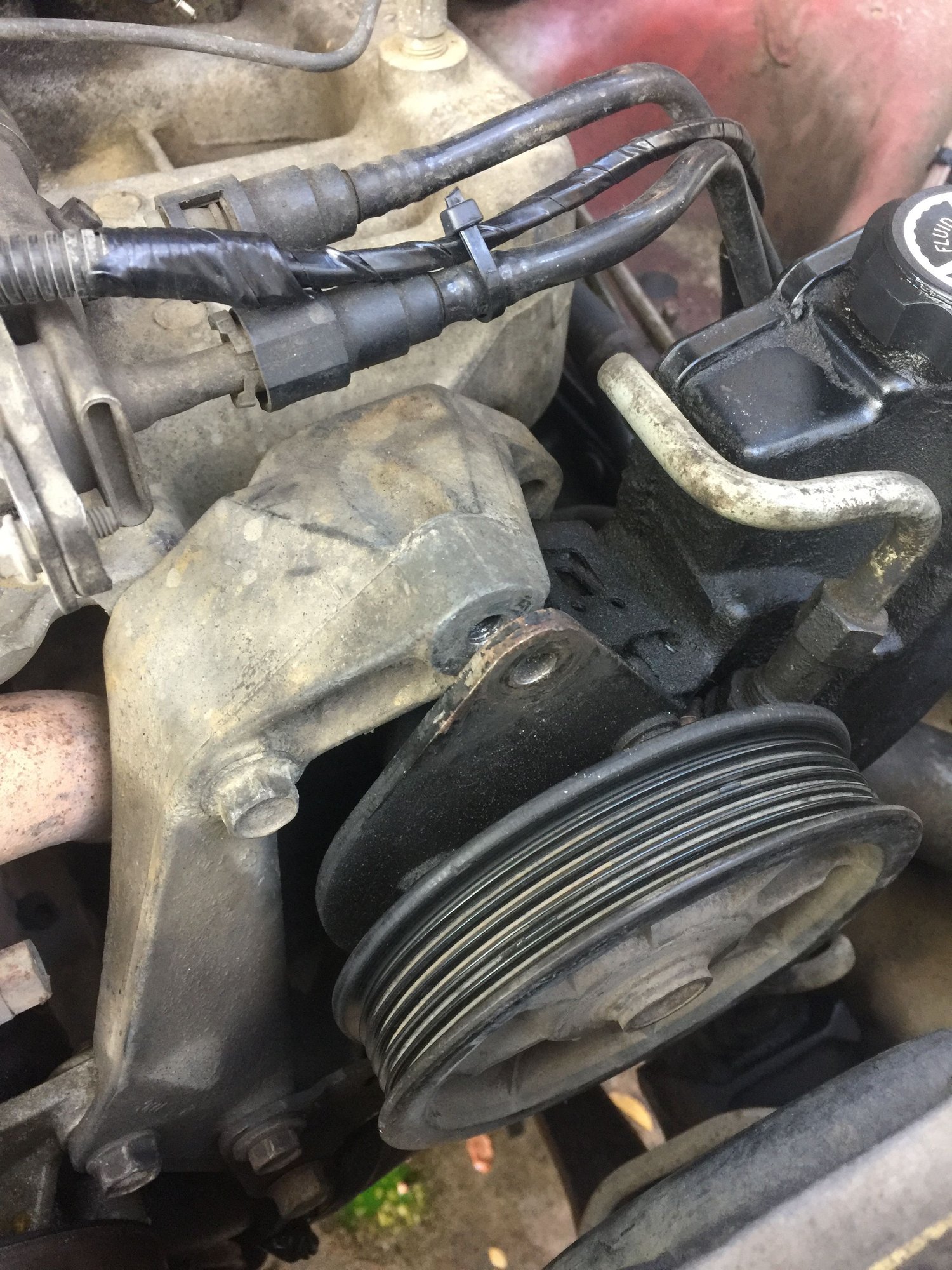 Day 3 was spent picking up a Haynes manual (which is like a gift from the Car Gods), finding out that the bolt head holding the power steering pump was snapped, and that the lower tensioner bolt seemed very loose (see below pics). I re-ran the serpentine belt, managed to rig a nut onto the bolt for the power steering pump, and tightened the tensioner bolt. Turned the jeep on and all was dandy........or so i thought. It was still running quite a bit hot.