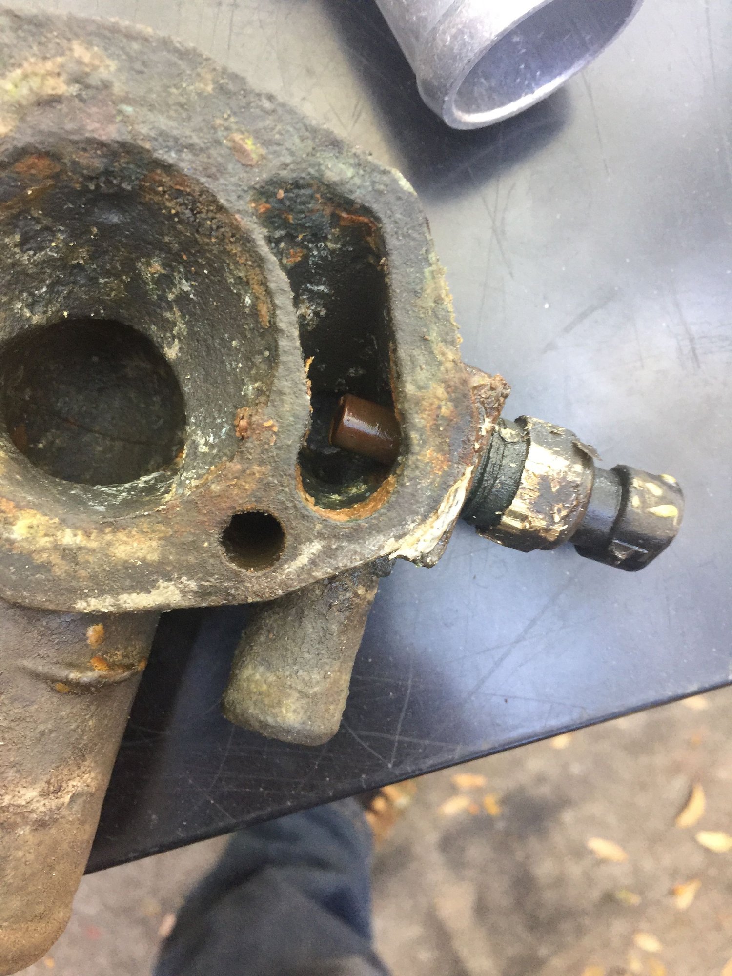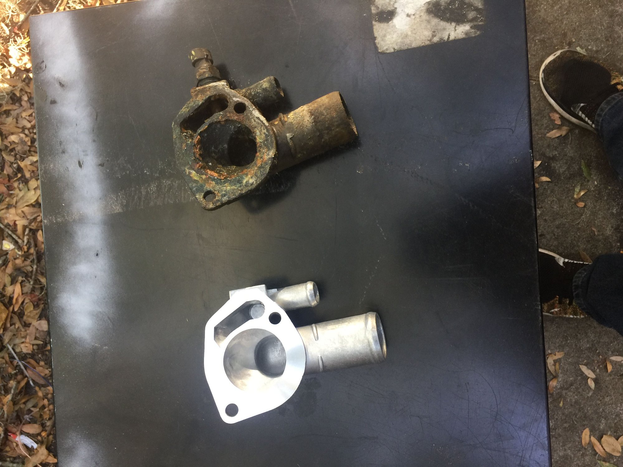 Housing removed, all the corrosion built up around the old gasket and thermostat