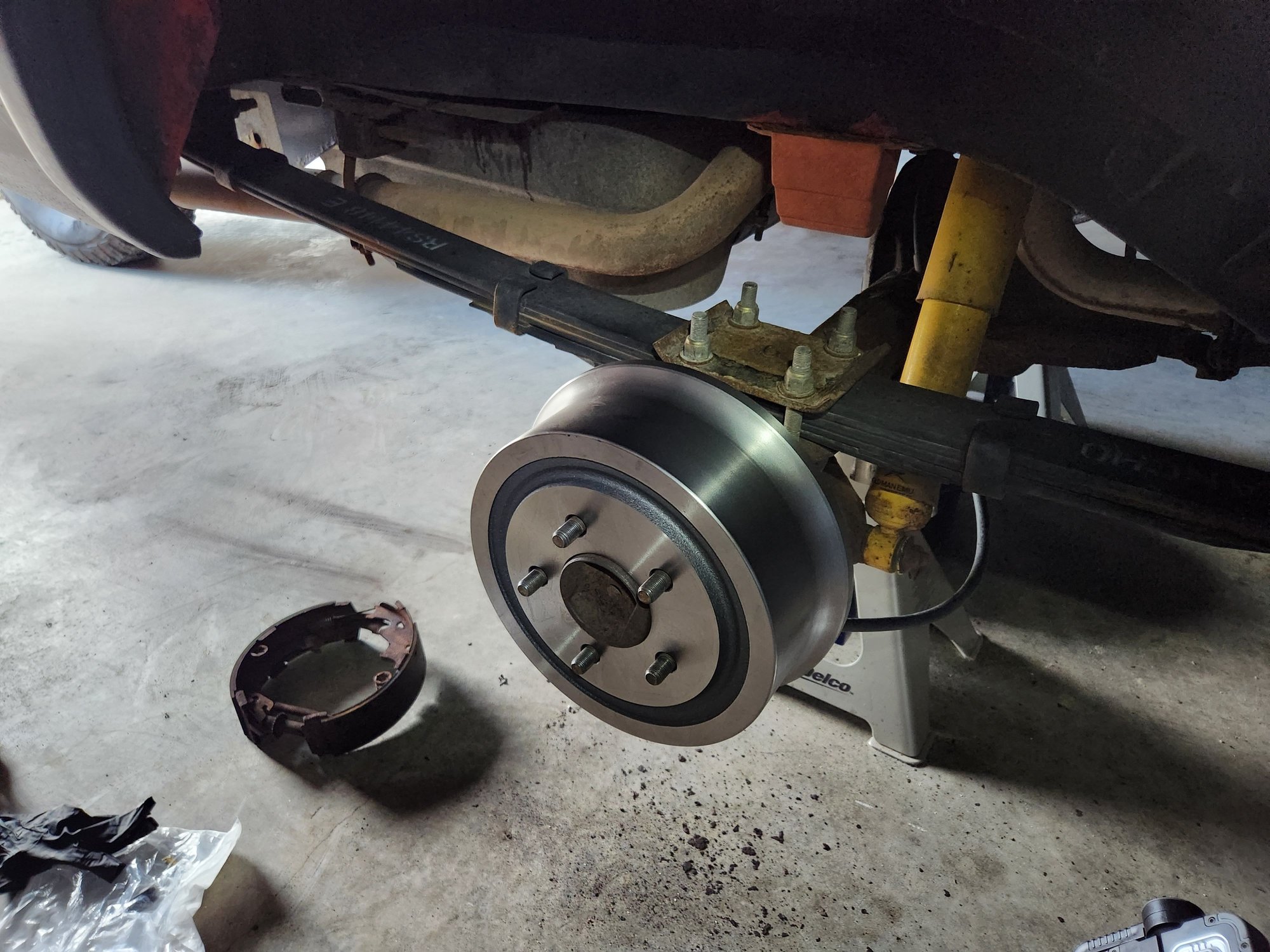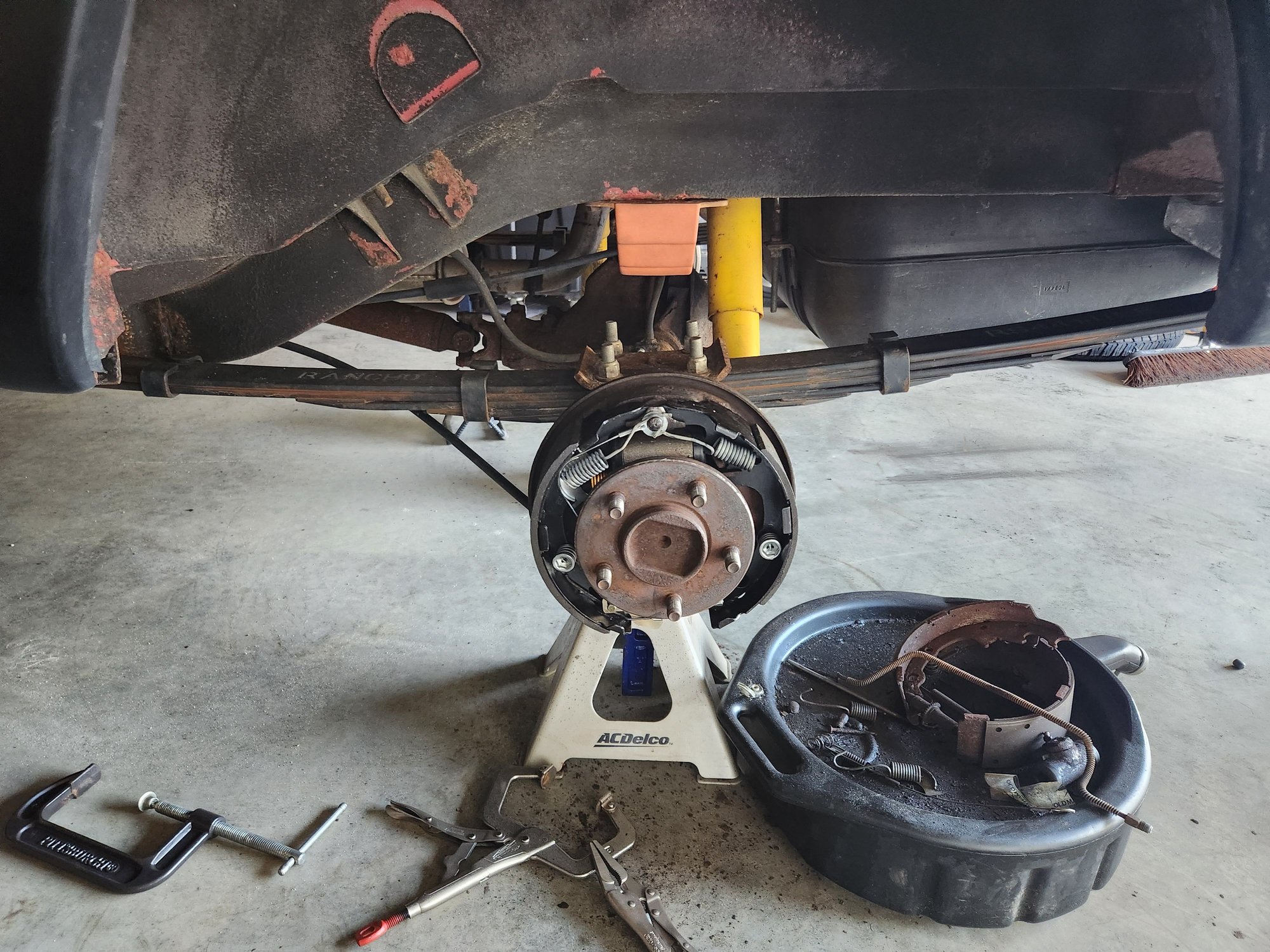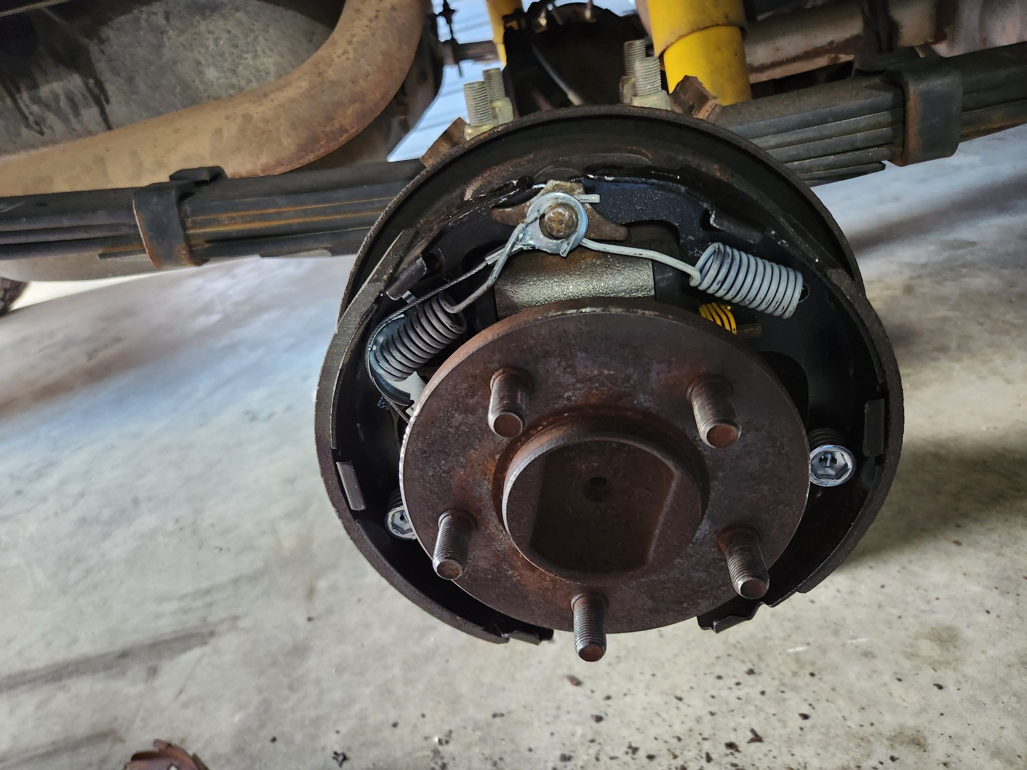 I got the front brakes put back on some crusty axles and have rebuilt the passenger-side drum brake already. I had to install a new brake line for the driver side and then ran out of time to finish the last drum rebuild (why I keep doing this instead of swapping over to discs is unknown).