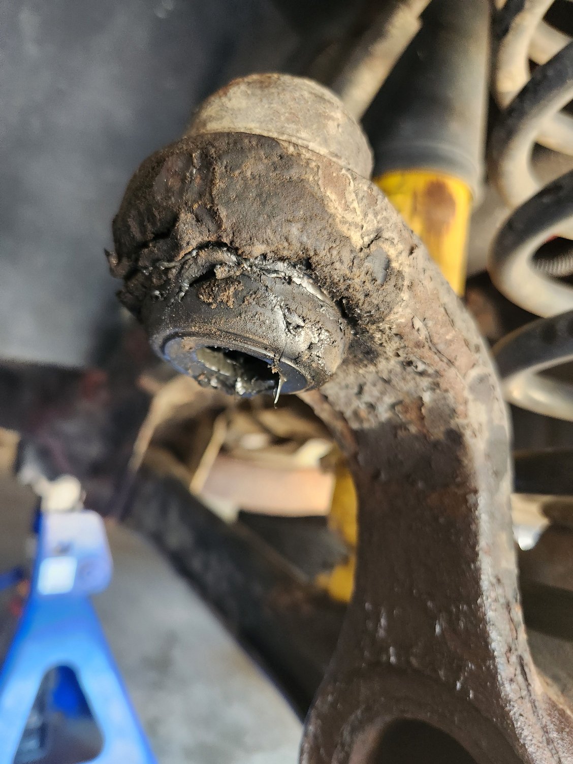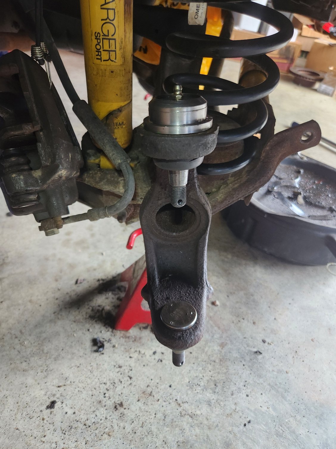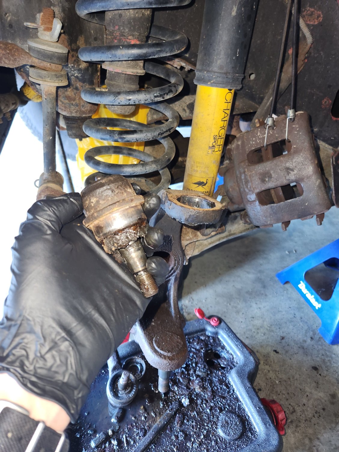 Sharing some slow progress pictures. I'm assuming this is the first time since it was first assembled 27 years ago that the knuckle has been removed. i had to drill out the upper ball joint cotter pin and bash on the knuckle HARD to get it off, but it's off. The lower ball joint has tons of play in it (I can easily wiggle it around) but the upper one is still stiffish.
