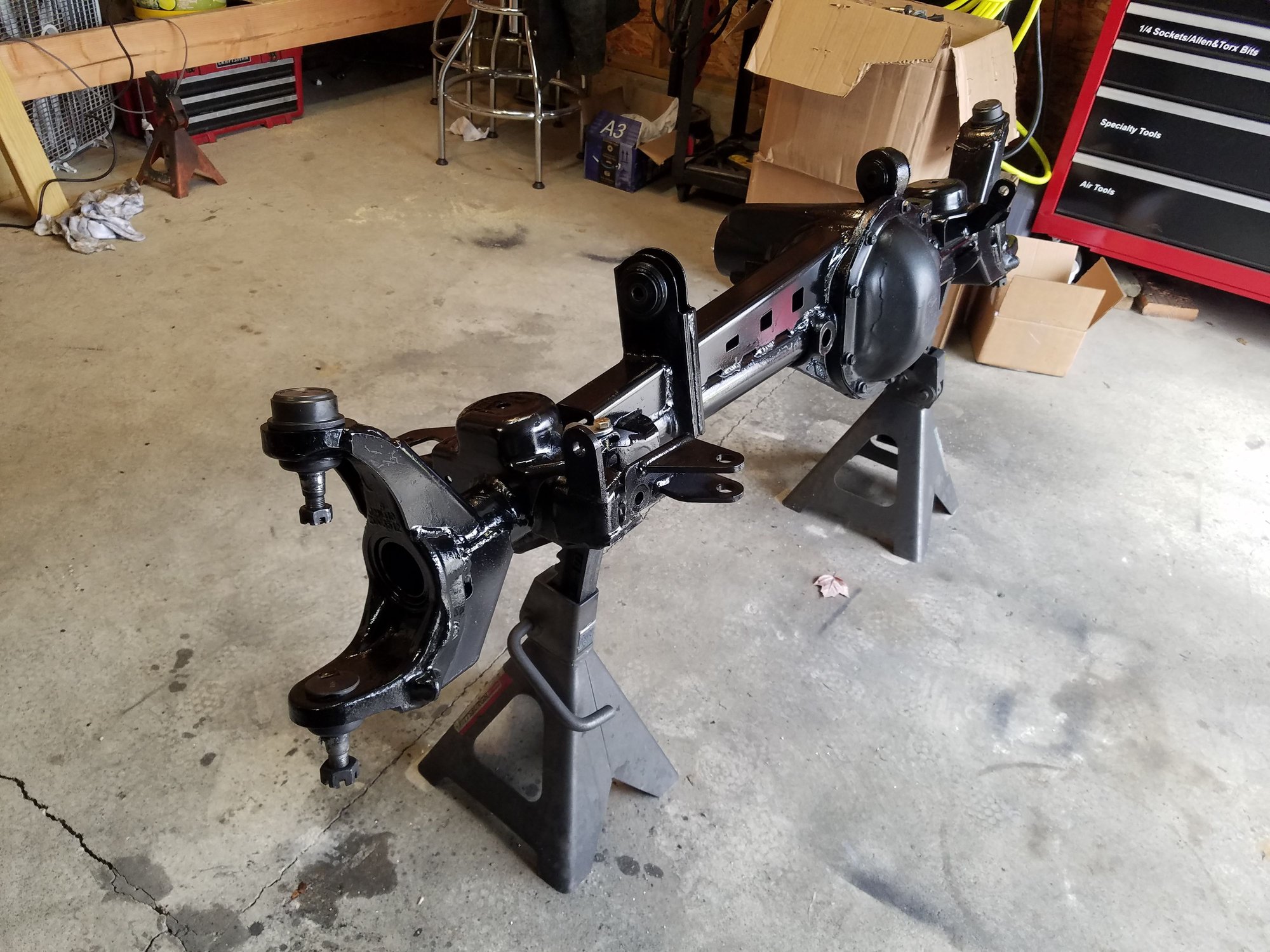 Now onto the axles. Decided to build the Dana 30 for the time being. Gusseted, sleeved, Synergy HD ball joints, Timken hubs, chromolly axle shafts. Scored a factory XJ rear 44 also, Did a rear disc brake conversion on it, and some chromolly axle shafts as well. Both were geared 4.88 with Detroit True Tracs.