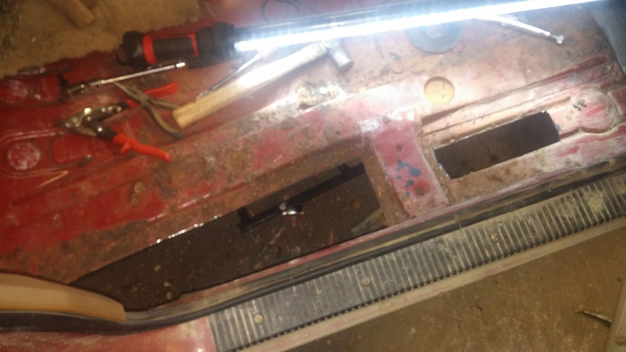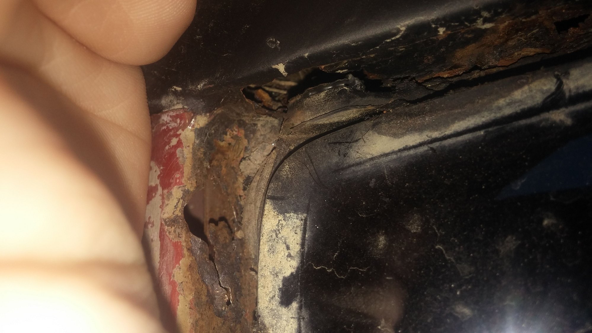 Found this in right upper corner of windshield frame. Got cleaned and repaired. New windshield installed. Did the same with rear window, but I have no pics of that.