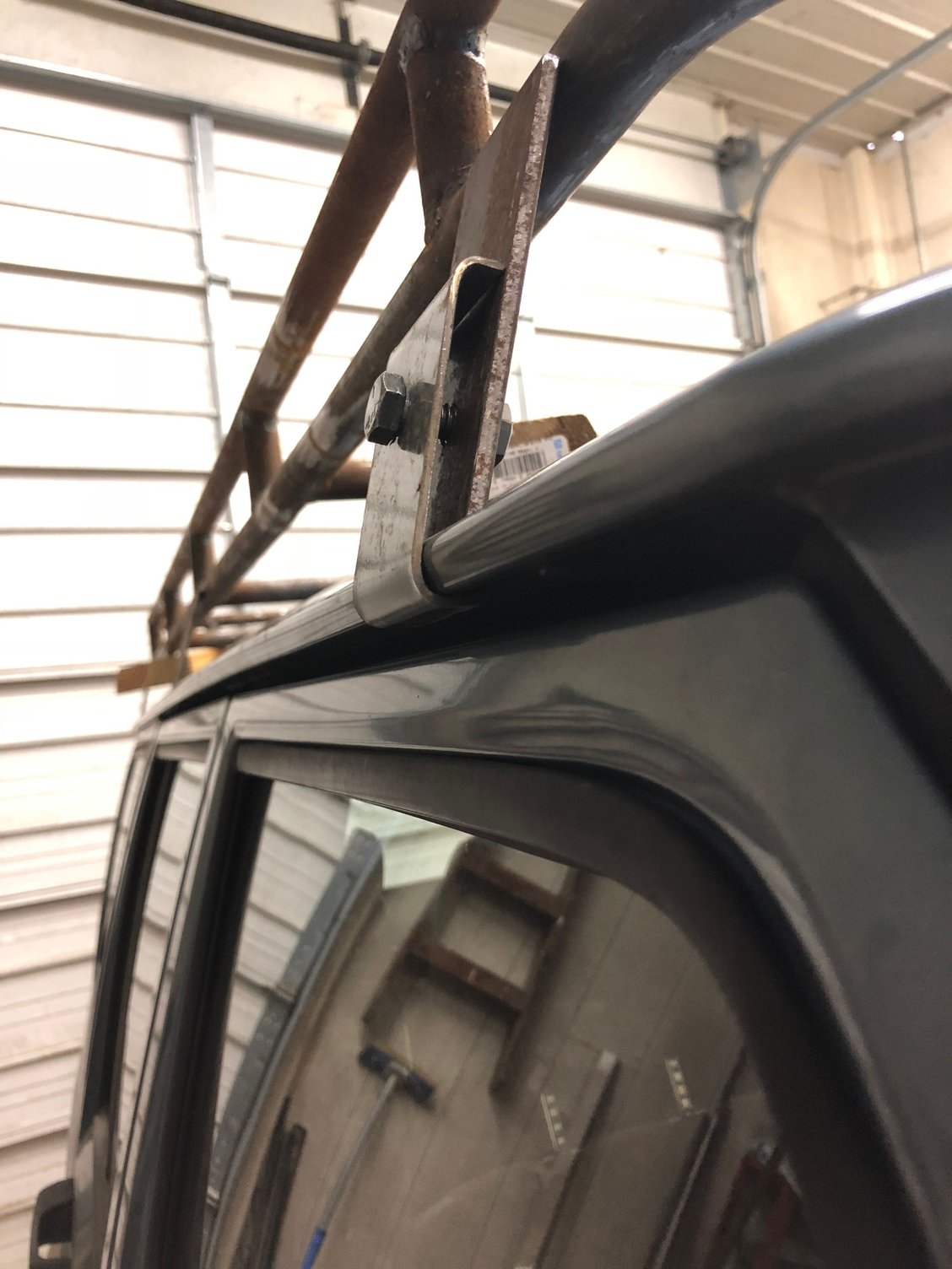 Once i got it, I started designing brackets to mount it to the Jeep. I figured the easiest way would be to use the gutter rails on the roof. So I made some really simple gutter rail mounts out of 2” (I think it’s 2”) flat bar, and some scrap steel that I had laying around. The flat bar went from inside the rail to the rack and the scrap steel I had was bent around the rail with a bolt through the middle that attached them both together. Here’s some pictures.