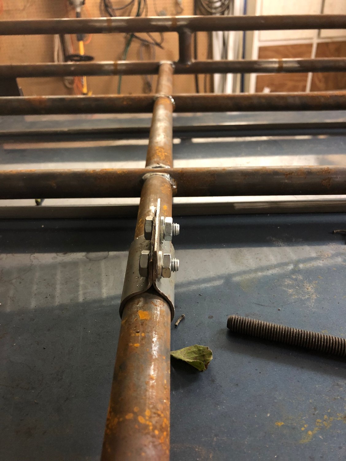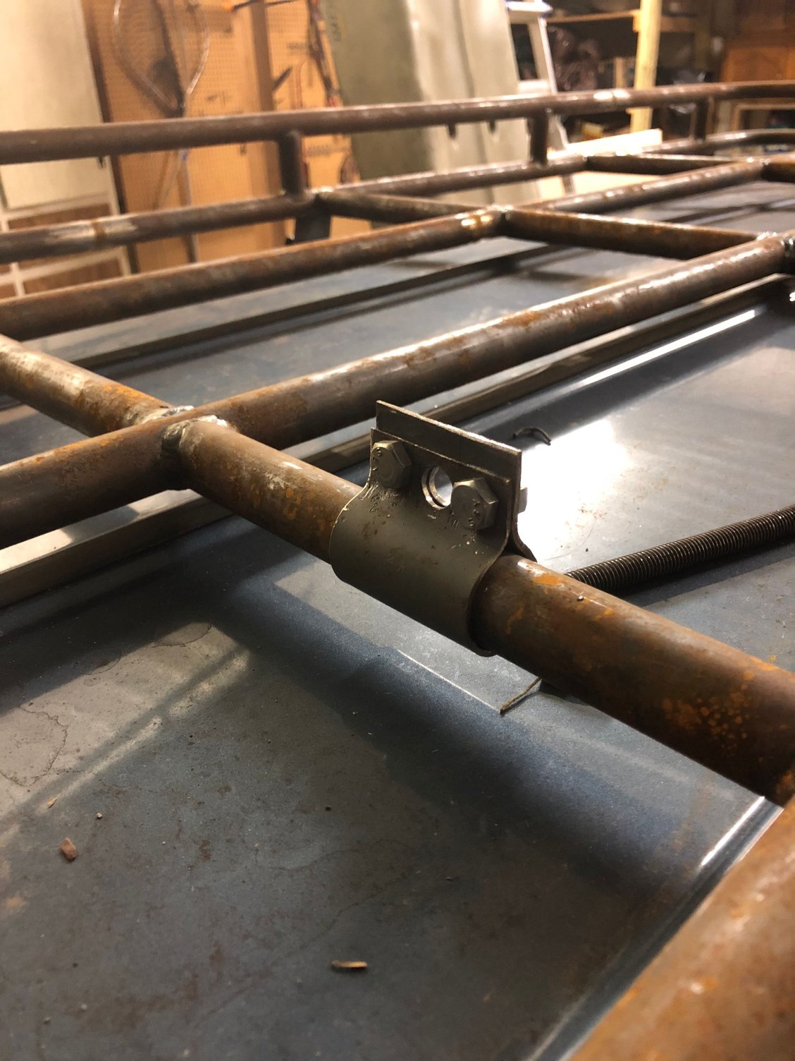 There are 6 supports/brackets total (3 on each side). After those were made I had my friend weld the supports to the rack. If you’re wondering how sturdy it is, the flat bar is welded to the rack on both front and back and the guy who welded it (who is 260lbs) got up on top of it and it held just fine. There’s no movement front to back or side to side at all and the clamp style mounts hold very tight. As for the spare tire mount. I wanted to mimic the way the spare mounts in the cargo area and use the same hardware so I made another clamp that wraps around one of the rack cross members and has a hole where the threaded rod slips through (and 2 bolt holes). Here’s a couple pictures.