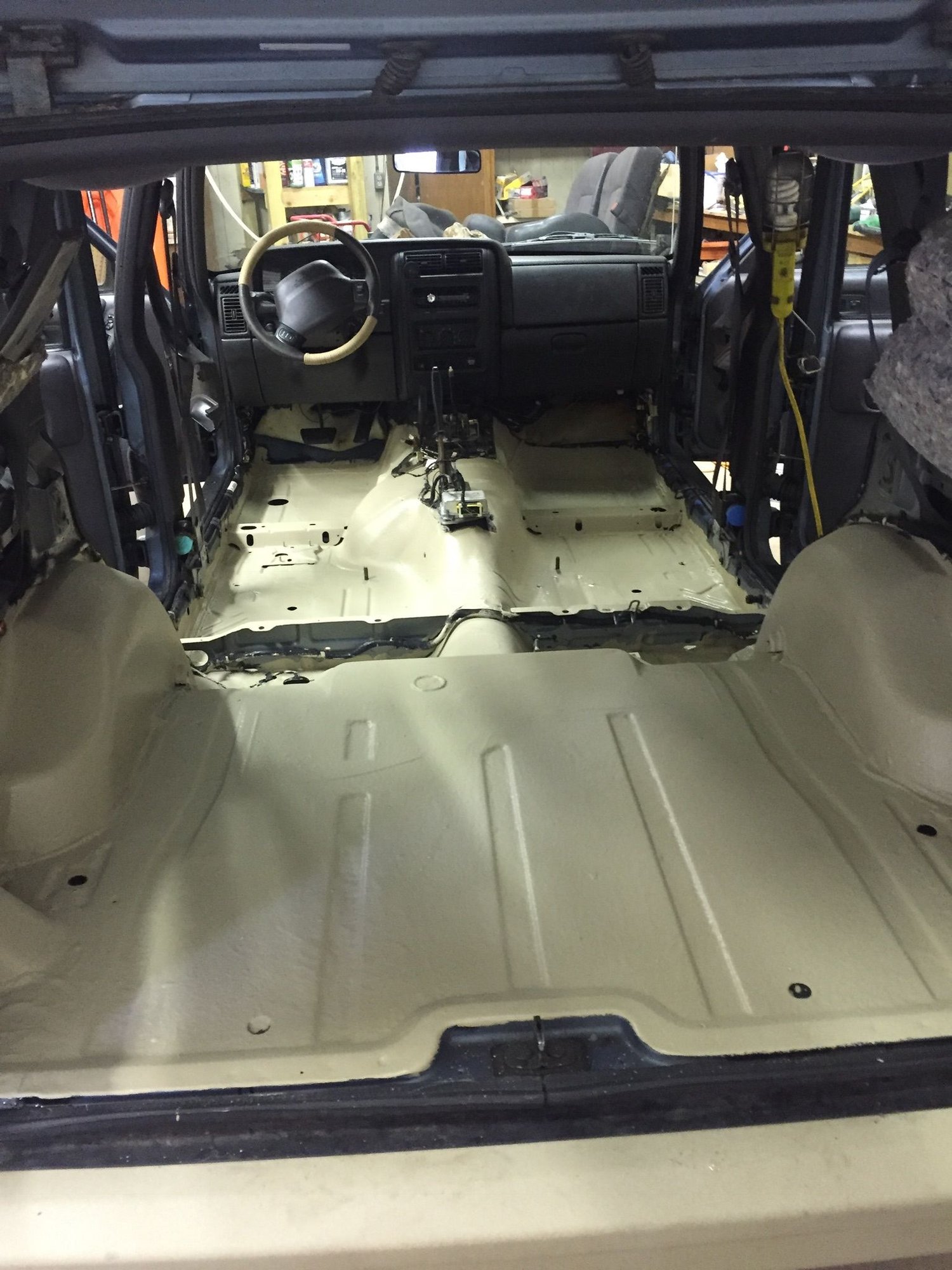 The Bed liner I was putting down can be painted over rust but por-15 does a better job at stopping it. Next I again sanded everything down and cleaned it out. Then I put the interior all back together (except for the back seat and all the carpet). Why you ask? Well the bed liner I was putting down needs a week to cure and seeing as I was leaving for a week long trip a couple weeks later I thought that would be a perfect time for it to sit and cure. And since I needed the Jeep in the mean time I Put it back together and drove it like that (which was pretty cool to be honest). So when the time came for me to paint it I removed the interior again, did a final wipe down, and went ahead and mixed the roll on bed liner. I went with monstaliner because of the reviews it got and the fact that it seemed to fit my application well. It’s not rough to the touch but kind of slick. It’s still textured and the best way to describe it (and the way I heard others describe it) is that it feels like an orange peal. Which makes it easy to clean out and won’t stain. I went with monstashades which is their tintable bed liner and I chose the color desert sand. I just rolled two coats on and let it sit for the week I was gone. I really think it turned out great. I decided to leave the carpet out of the back half of the Jeep and keep it in the front passenger area. I would like to leave all of it out but it helps with noise reduction and insulation so I decided to keep it.