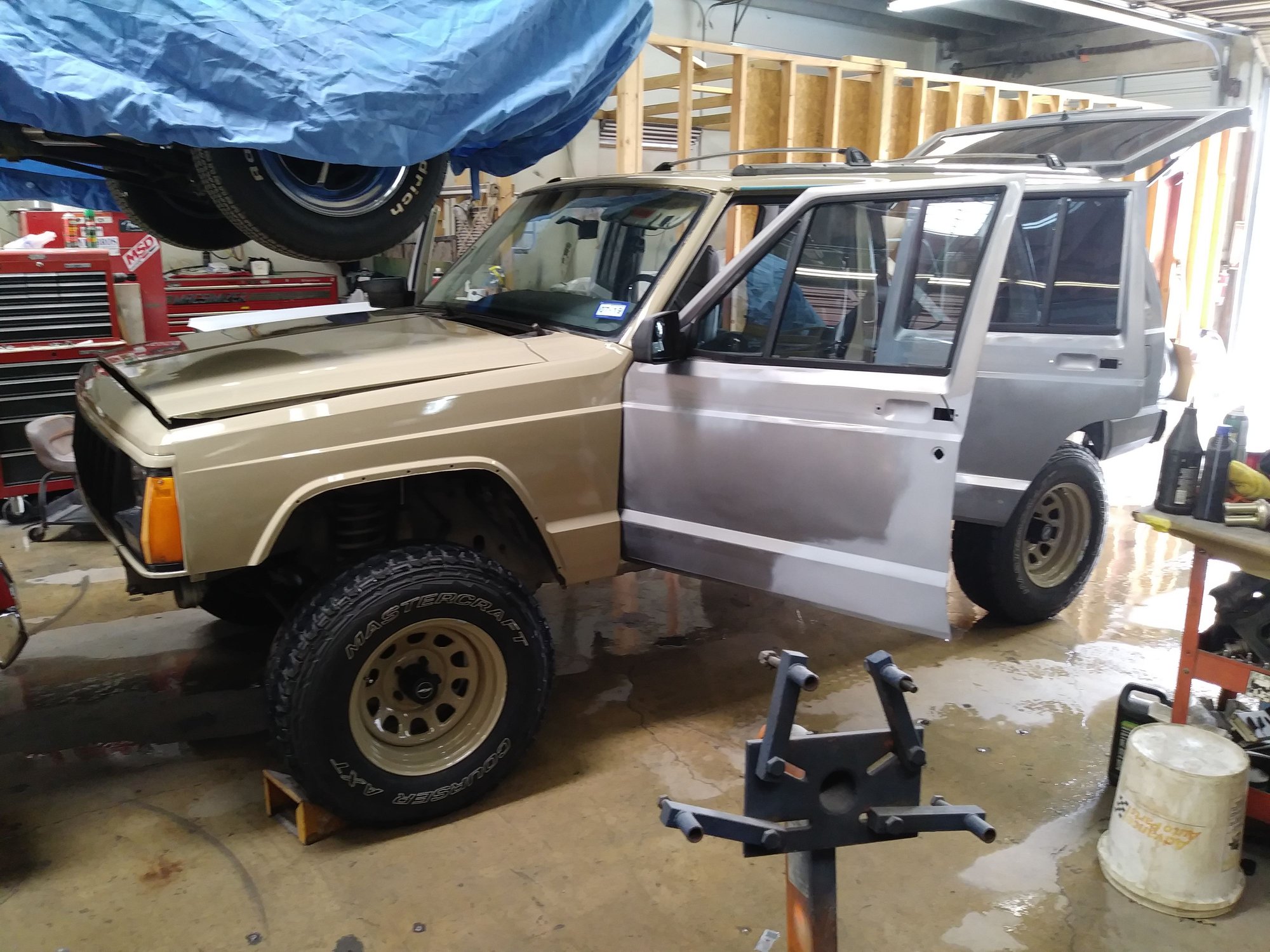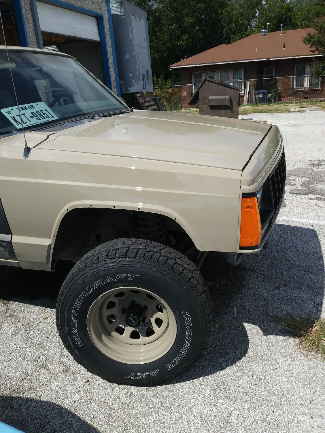 Current state. She's slowly getting there, lol. I've had a slew of jeeps with different kinds of aftermarket wheels... but never the classic, basic D-windows. So those are in her near future. They'll be painted to match the XJ though, right now im really leaning towards '18 Wrangler "Gobi" color.