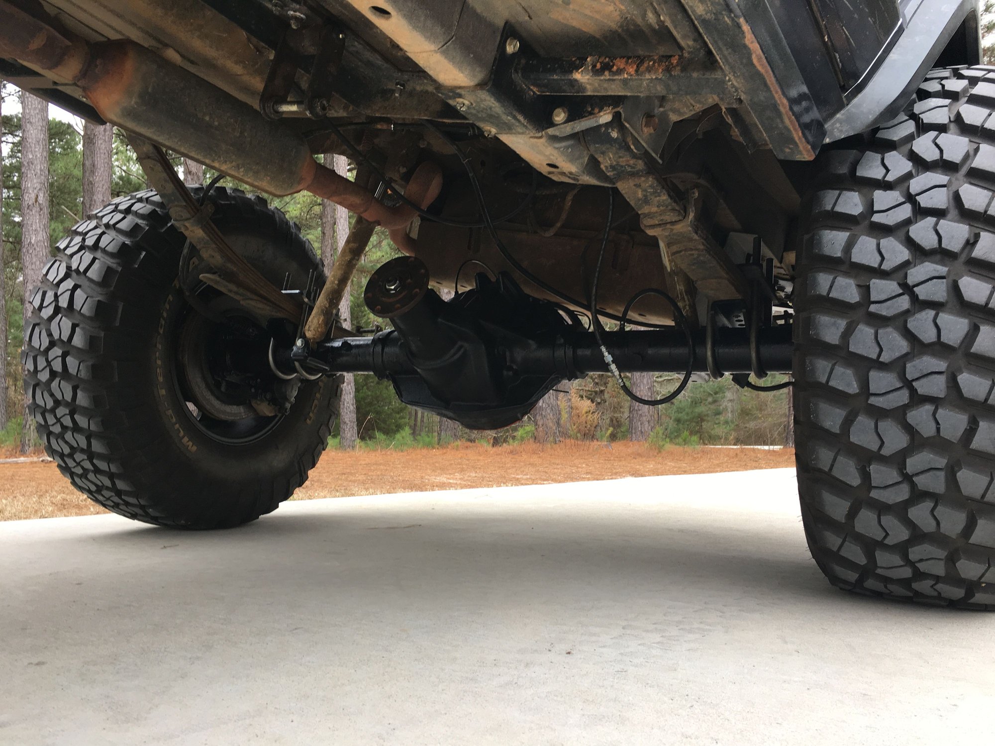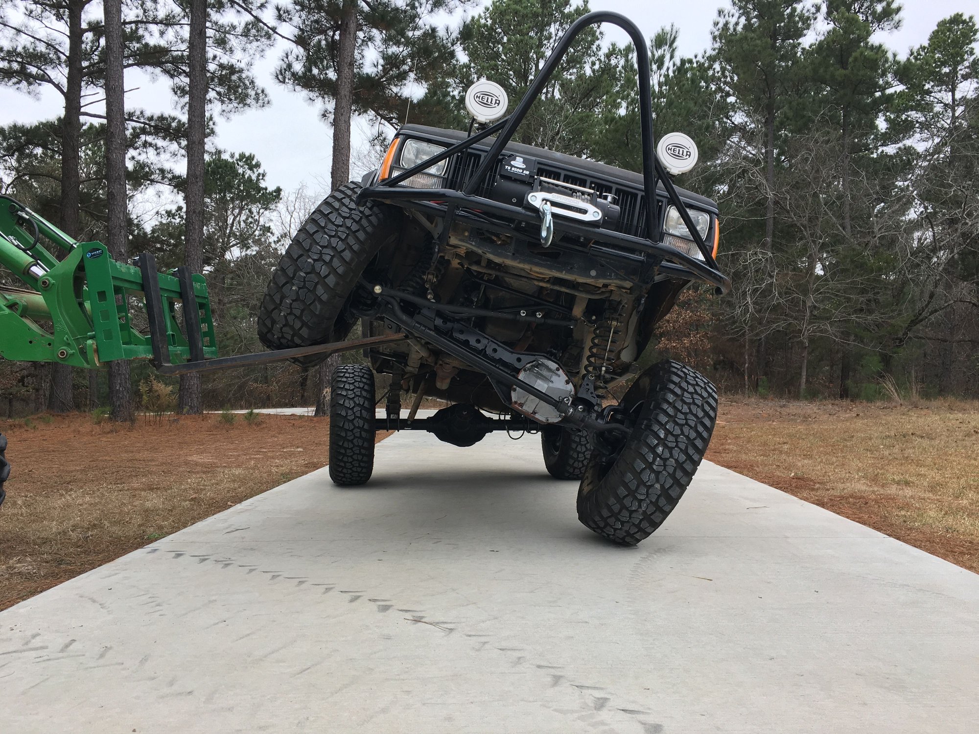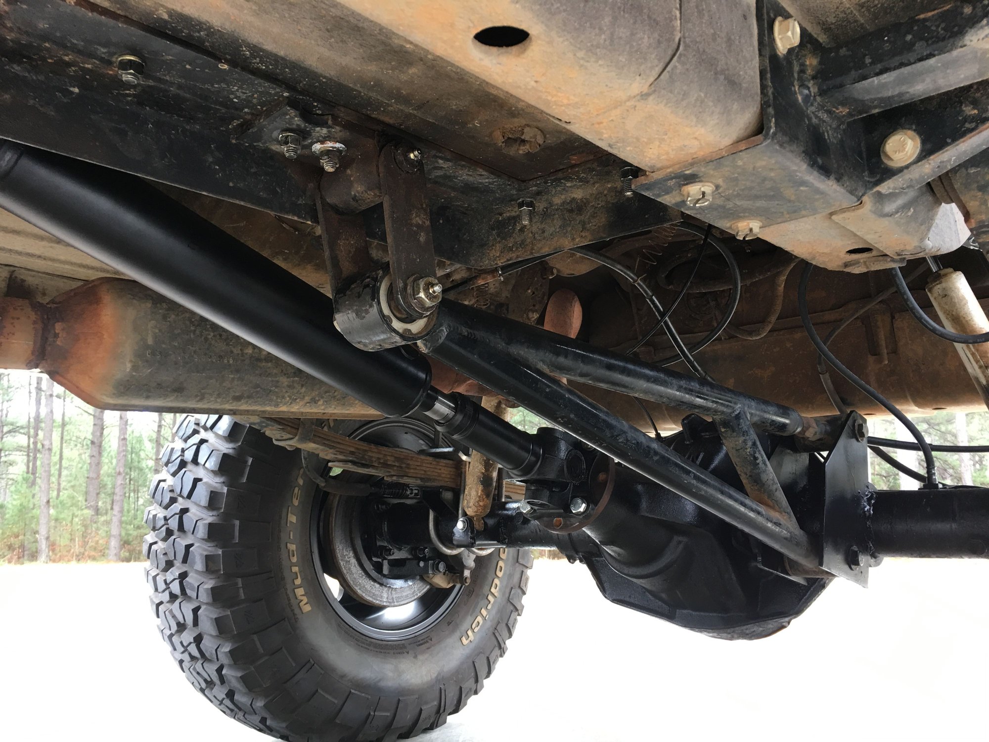 Rear sterling setup and suspension. Took out the blocks and used a INSANELY beefy Iron Man Fab XJAX shackle relocation kit with adjustable shackles (thickest and hardest poly bushings i have ever seen and sleeves are massive)....so the rear suspension is 5 inch BDS leafs (super supple and soft love them) with Adjustable shackles to accomplish 8 inches of rear lift total...the Sterling is setup with 5.38 10.25 gears and a Yukon zip locker with onboard air supplied by a VIAIR compressor mounted in the spare tire location in the rear of the XJ. We used a Barnes 3 hole leaf spring pad kit for the 3.5 inch axle tube of the sterling and paired 3 hole ubolt plates so we were able to stretch the rear 1 inch back for a slightly longer wheelbase...tom woods driveshaft with matched flange to fit the machined circle on the sterling pinion flange. went together very well and E brake etc was not an issue...pushing 14+inches of wheeltravel with leaf springs in the rear...shackles were the best mod we had done to the rear suspension...the flex is off the charts...practically matches the front for the first time.