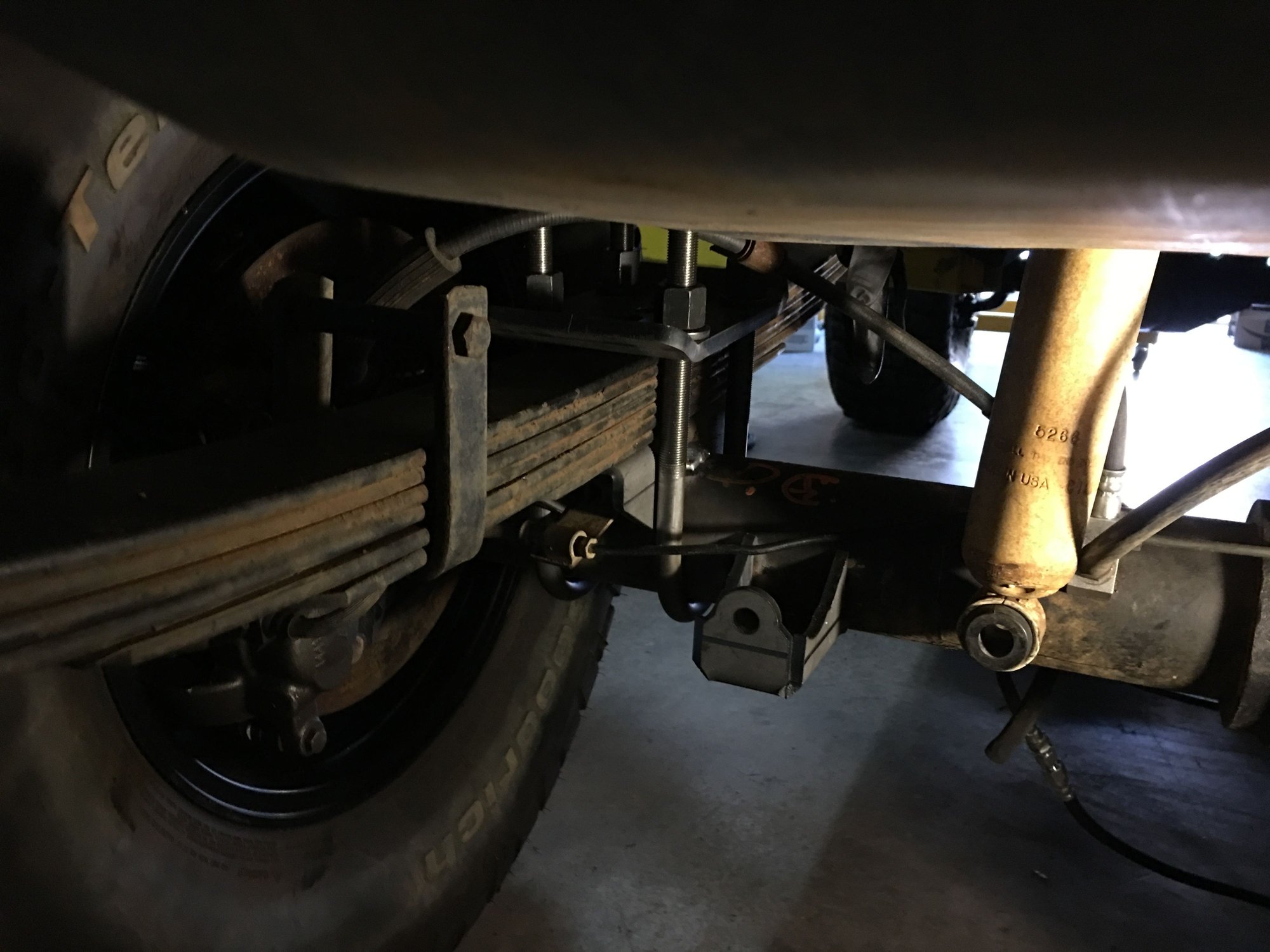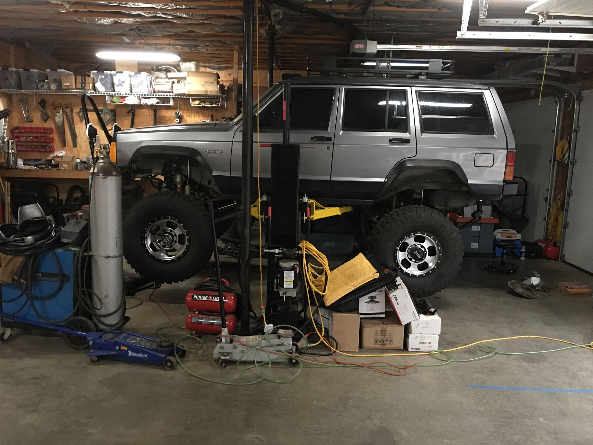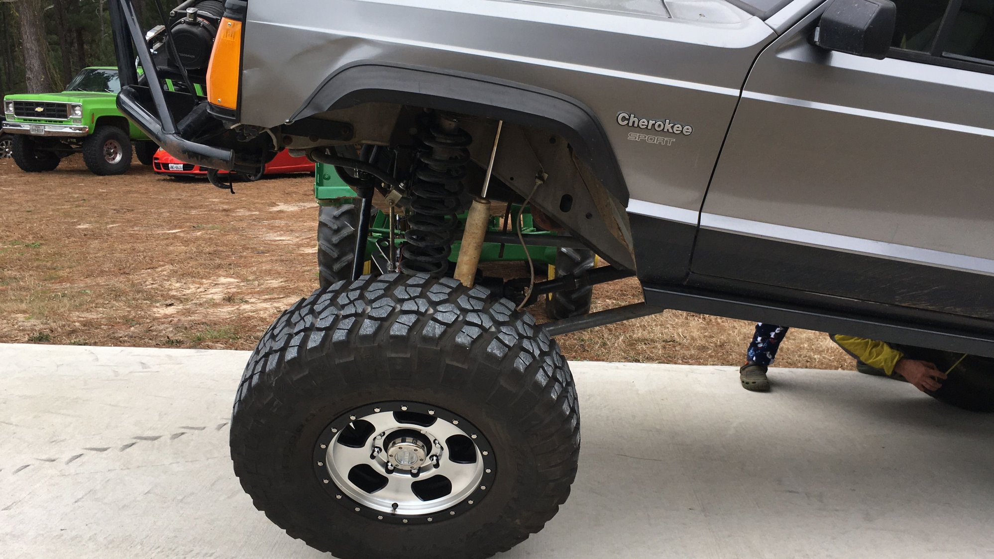 Rear sterling setup and suspension. Took out the blocks and used a INSANELY beefy Iron Man Fab XJAX shackle relocation kit with adjustable shackles (thickest and hardest poly bushings i have ever seen and sleeves are massive)....so the rear suspension is 5 inch BDS leafs (super supple and soft love them) with Adjustable shackles to accomplish 8 inches of rear lift total...the Sterling is setup with 5.38 10.25 gears and a Yukon zip locker with onboard air supplied by a VIAIR compressor mounted in the spare tire location in the rear of the XJ. We used a Barnes 3 hole leaf spring pad kit for the 3.5 inch axle tube of the sterling and paired 3 hole ubolt plates so we were able to stretch the rear 1 inch back for a slightly longer wheelbase...tom woods driveshaft with matched flange to fit the machined circle on the sterling pinion flange. went together very well and E brake etc was not an issue...pushing 14+inches of wheeltravel with leaf springs in the rear...shackles were the best mod we had done to the rear suspension...the flex is off the charts...practically matches the front for the first time.