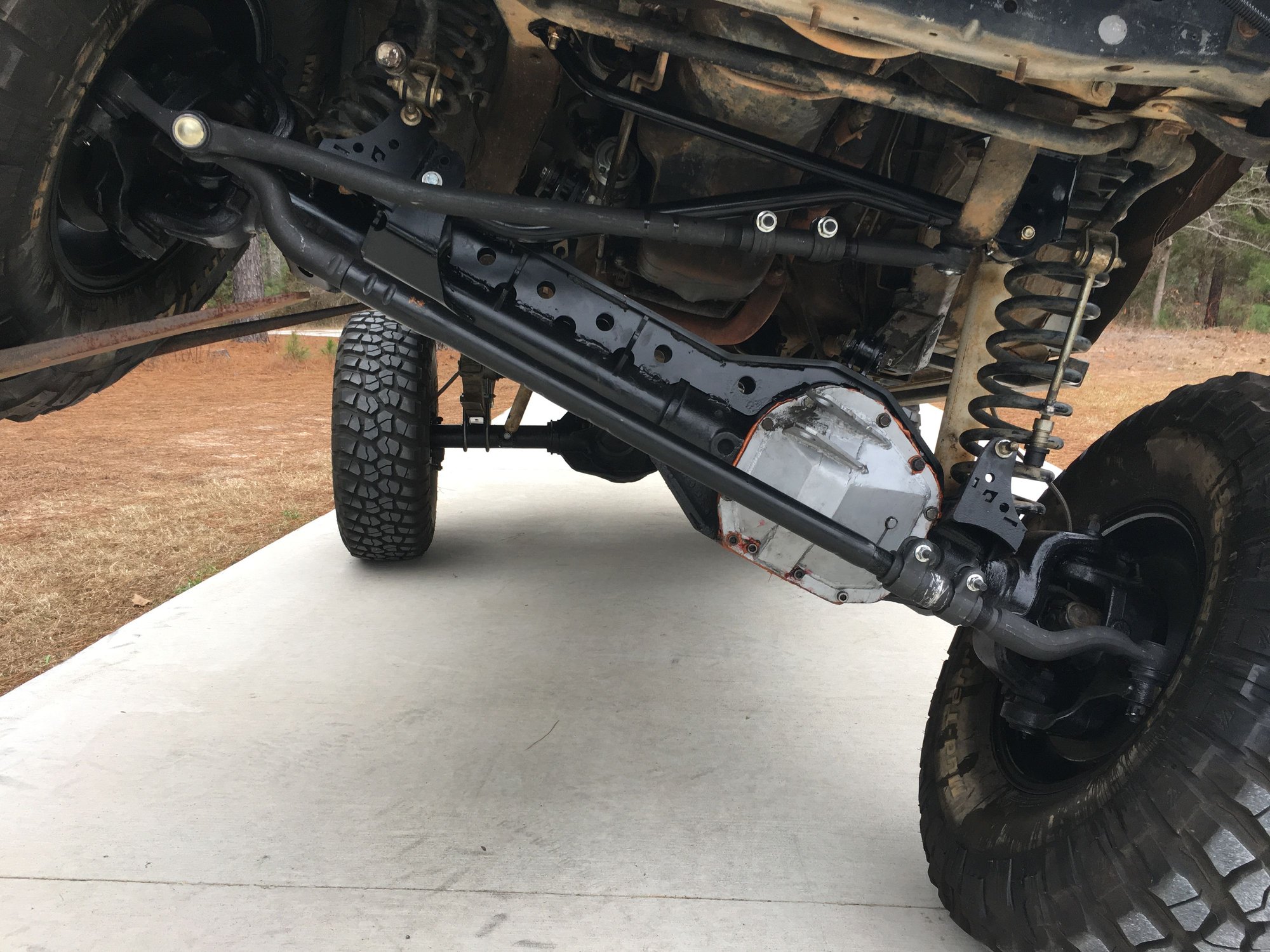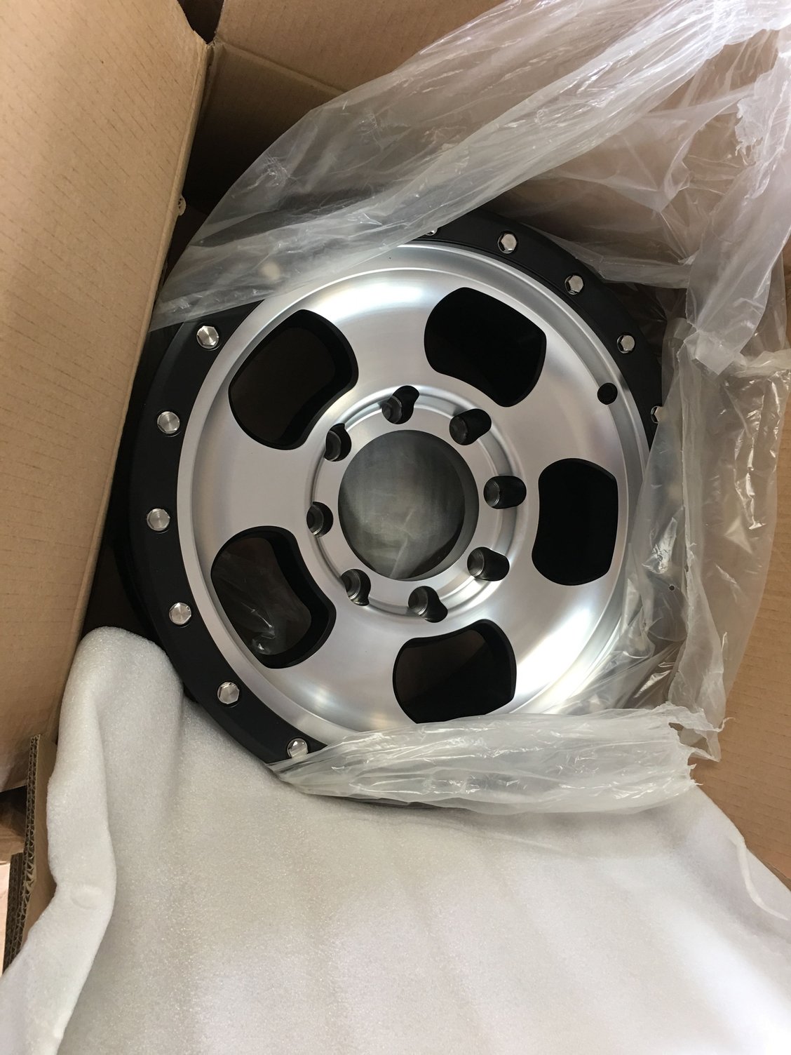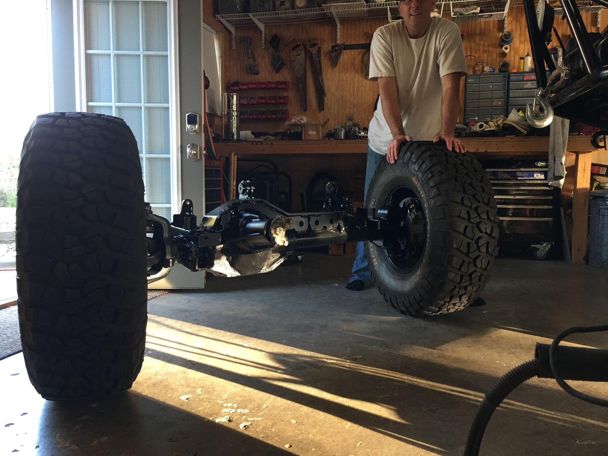 Got the wheels in...American Racing Ansel Off Road in 17x9 with 5.7 inches of backspacing to tuck in the tires as much as possible. The Tie rod ends at the knuckle had to be ground a bit to clear the wheels but they worked!