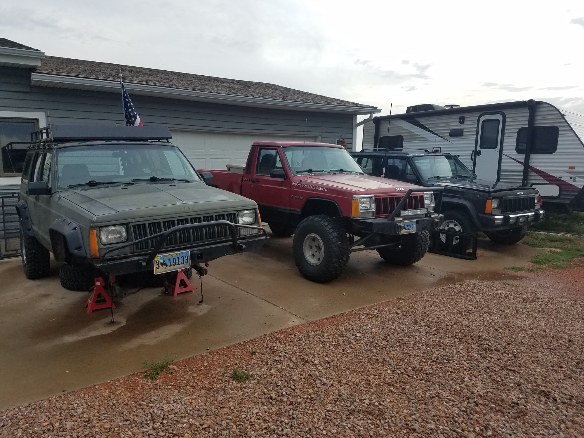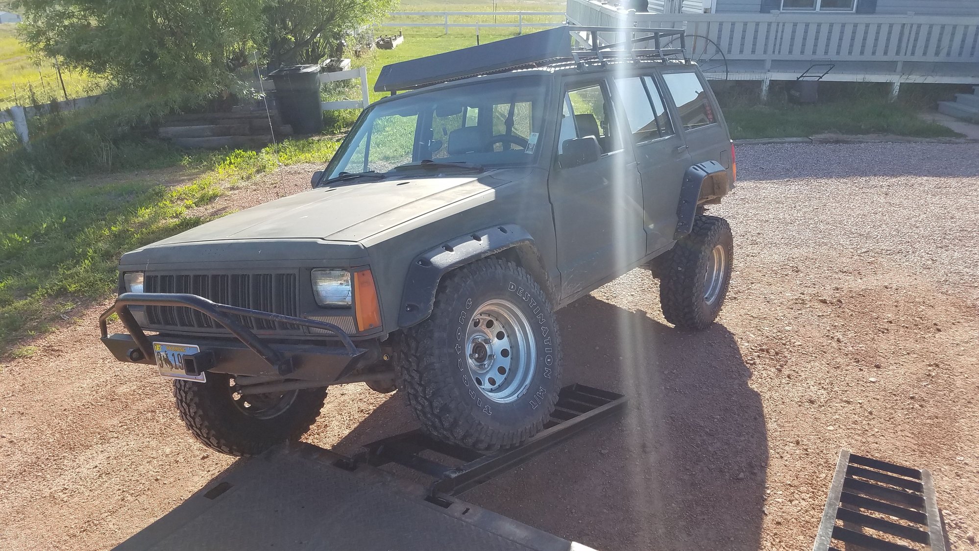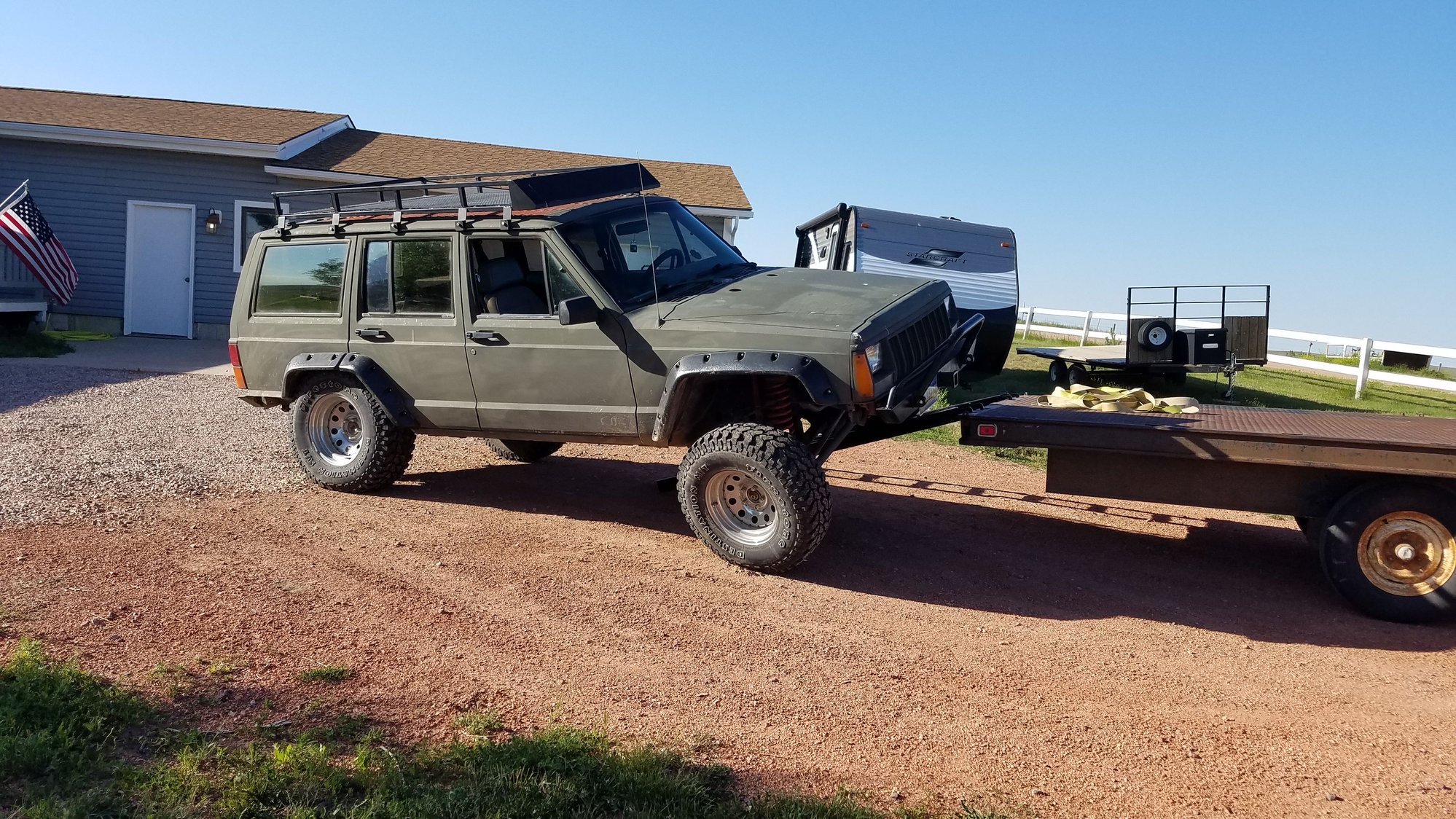 Welp, finally got her on the road. Completed the brake swap from Bendix 9 to a manual system from a 96XJ. i literally stripped the entire brake system including hardlines, booster, axles and everything, and swapped them in to the 90. The hardest part was swapping in the hard line for the Right front. I had to remove all the wiring from the engine bay, plus nearly everything on the passenger side, and snake the hard line in to place. After that, it was pretty straightforward. Had to grind down the mast cylinder push rod to be flat and match the brake light switch. The brakes are a tad spongy, but im going to attribute that to the rubber lines. The brakes worked fine in the donor vehicle before i tore them apart. While i had everything apart, i added rear shackles, and wired up the winch i got for half price. I have some Ironmanfab adjustable short arms coming in the mail, so those will go on next. Also in the process of swapping it to a Open Cooling system. Shes now sitting at a measured 4" lift. New shackles going in 4" lift