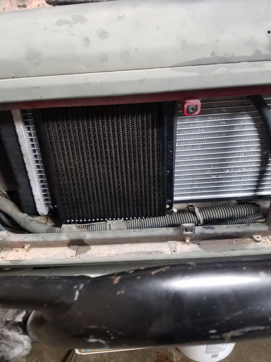 Got the cooling system all back together, and converted it to an open system. While I was at it, I plumbed in a Hayden transmission cooler. Hardest problem Was figuring out how to run the lines. Hayden cooler