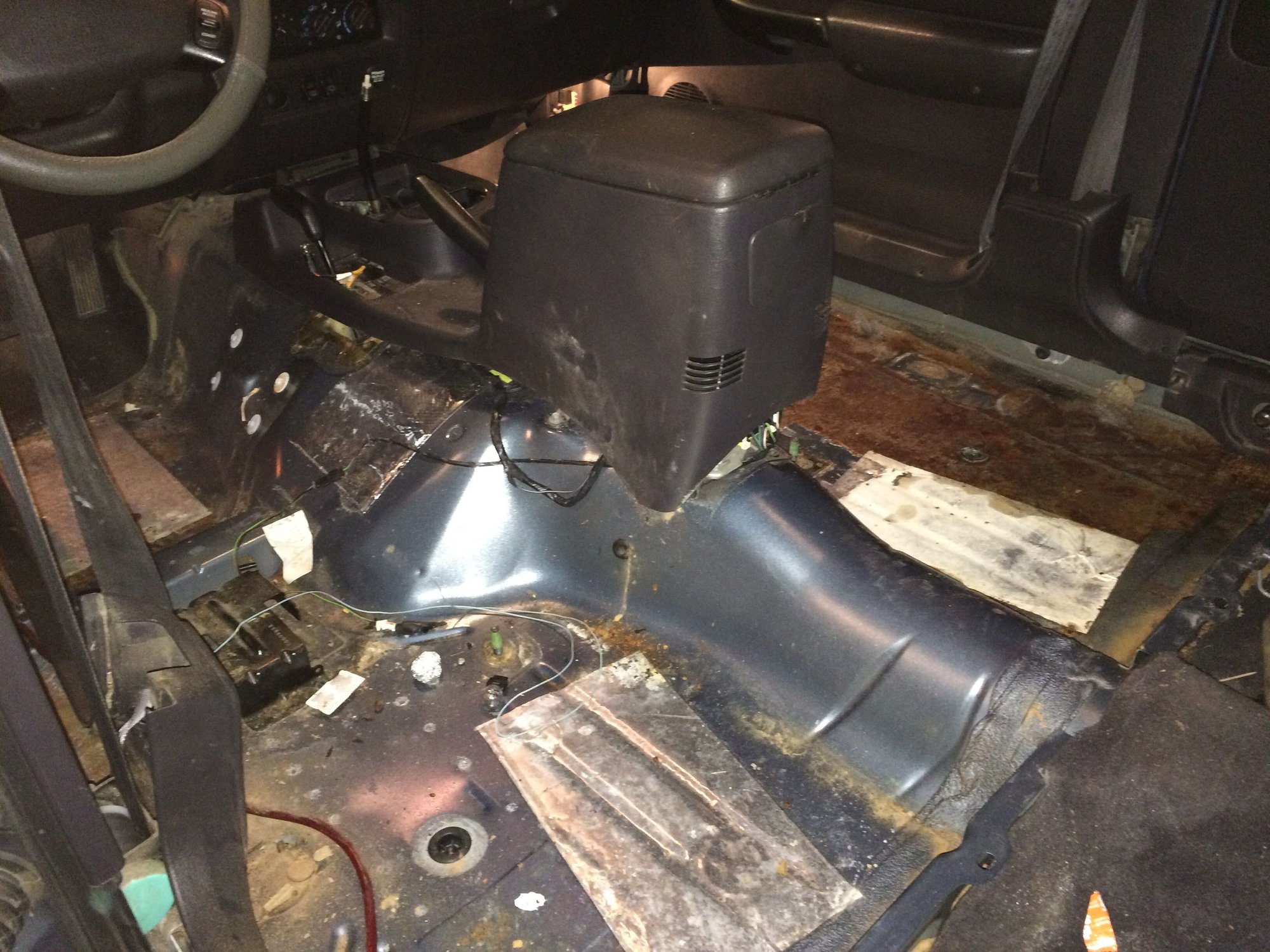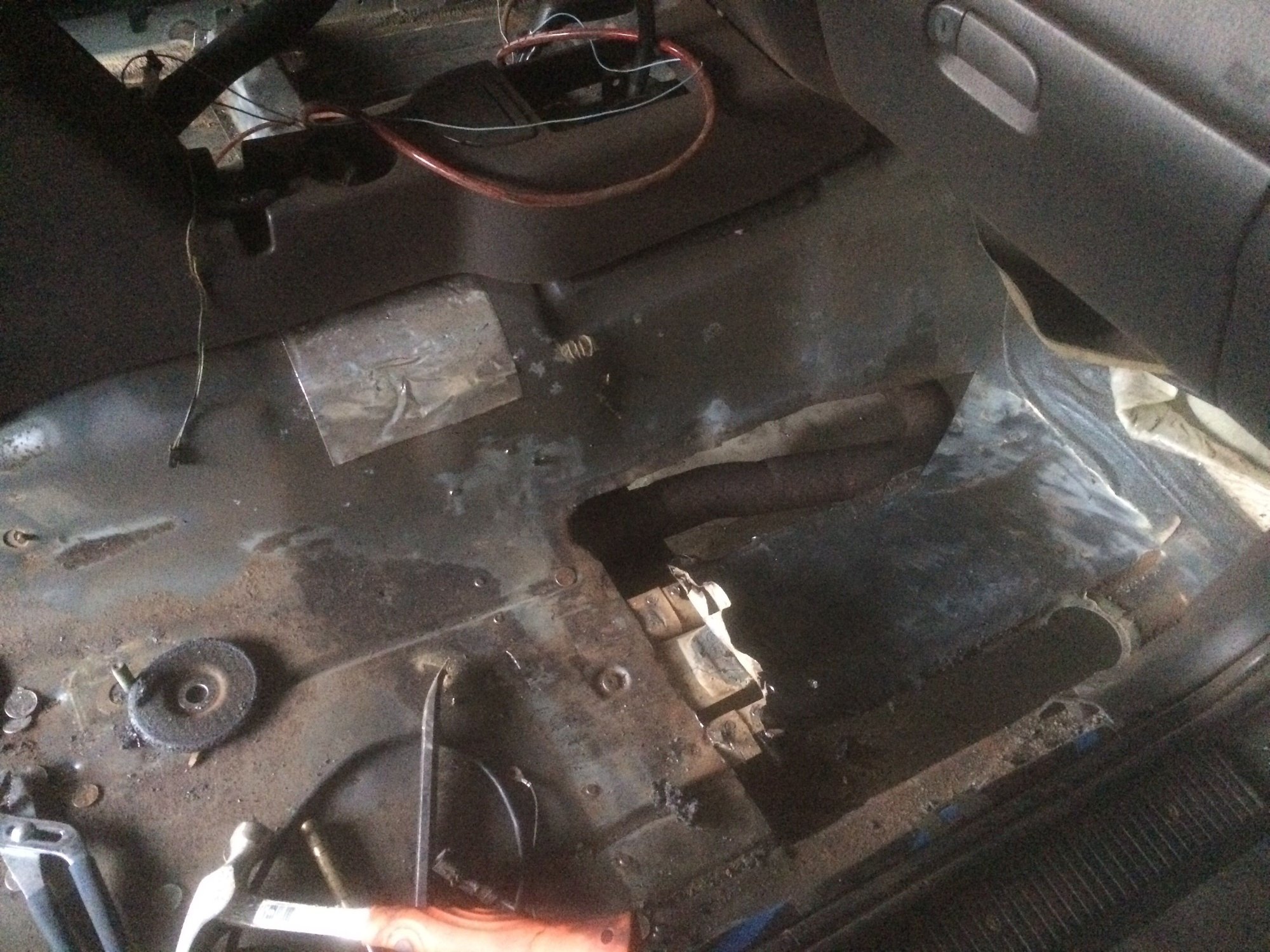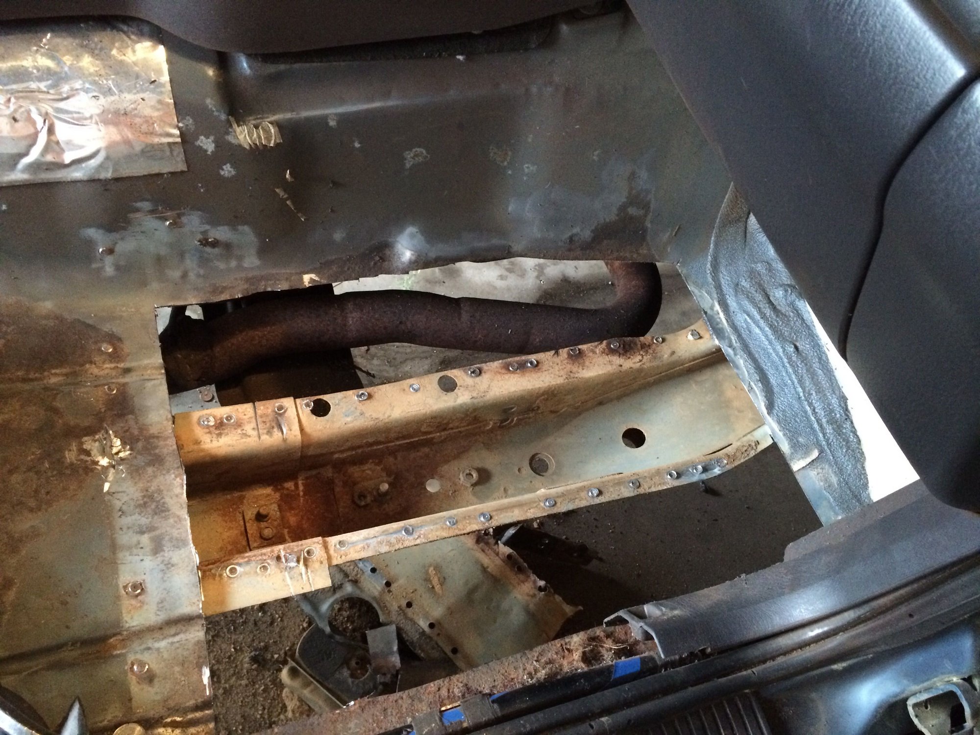 ok, so what I thought was turds, was not. I got the wire wheel out tonight and started going to town with it and a shop vac. It ended up being rusted bb's. Someone had spilled a ton of them. I think if I get a good grinding wheel or a really stiff wire wheel brush I can knock most of the rust away. I still have to cut out the front passenger floor board no matter what and redo it. I am unsure how big to cut though as I dont know how big the pans are the come from online. Also, i am trying to figure out how in the world I remove the hump section that the front part of the seat bolts to. I am guessing drill out the welds??