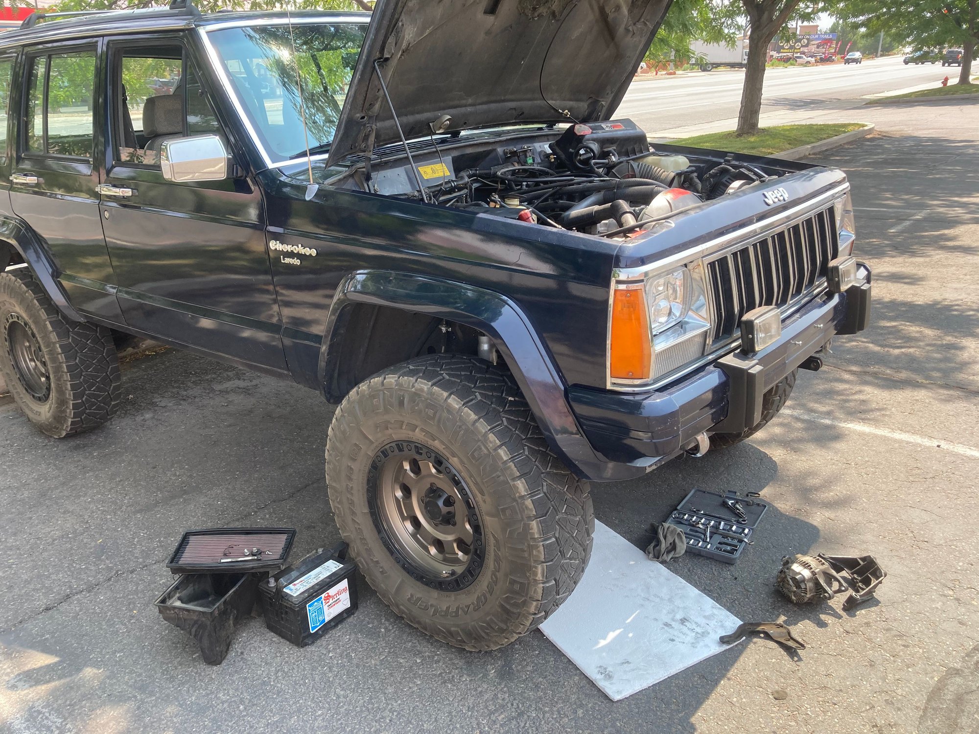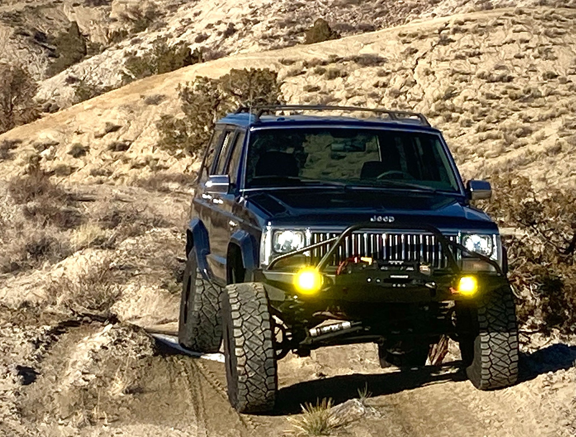 Big road trip for the XJ. I work as a linemen in New Mexico but the Jeep was built in Idaho at my family’s shop. Now that the build is complete enough to be road worthy I had to make the 1000 mile trip from Idaho to New Mexico. I made it to Moab and it was HOT. At this point the relay for the fans quit working. I had to limp it to the parts store and with a new relay I was able to do the trail “ Fins and things“.
