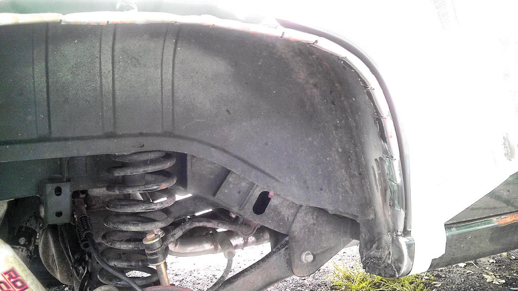 I cut vertical lines 1 1/2" up, and in between pinch welds. Bend up into wheel well. Used Deadblow to shape, and welded a few of the tabs for more strength. Mike |