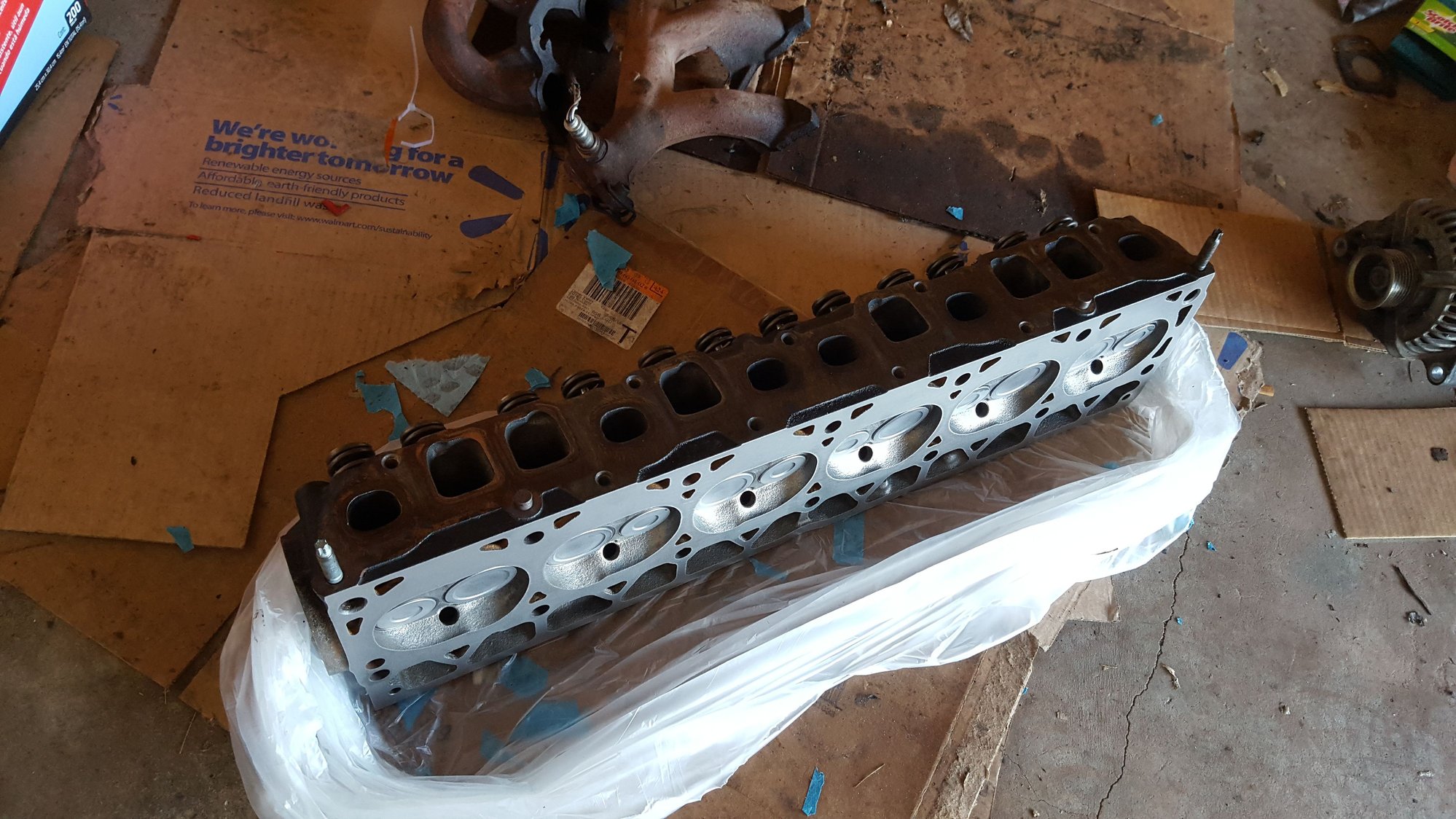 I finally had to stop for the night. Two hours connecting the exhaust manifolds. I have that CA emissions deal and I had an incredible about of difficulty with the front bolt on the back pipe. It was cross threaded and breaking the starting threads on all 4 bolts. Finally I ran a tap through the clip in a vice and saw the retaining part of the clip that applies pressure and holds the clip in place was broken and gouging whatever bolt I tried to send through. I got that out of the way... then sent a bolt back and forth through it over and ovet until I could do it with my fingers. I finally got both manifolds (exhaust, not intake) mounted loosely to the head and tightly to the exhaust pipes. Will start on the intake manifold tomorrow and can tell I am going to have plenty of difficulty and frustration getting it on and everything torqued down. After that everything is a lot easier to get to and I should be able to crank it up in no time.
