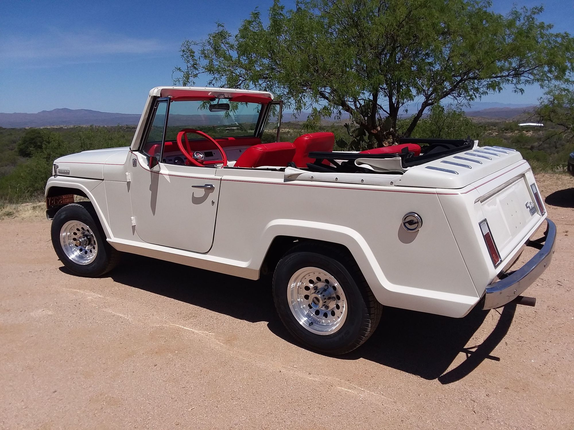 My Grandmother, even though she was a Rancher, she had class. Wanting something that would go off road yet have class and ride good like a (Sunday go to town car) car she bought this 68 Jeepster Commander brand new. My Uncle Dave ended up getting the honor of restoring this classic Jeep. He did one hell of a job! These are images from when he was just about done with it. About the only things still missing appears to be the radio and the "continental" spare tire carrier for the back. It is so cool to have these memories restored for us all as a family. Just fantastic to see this on the road again!