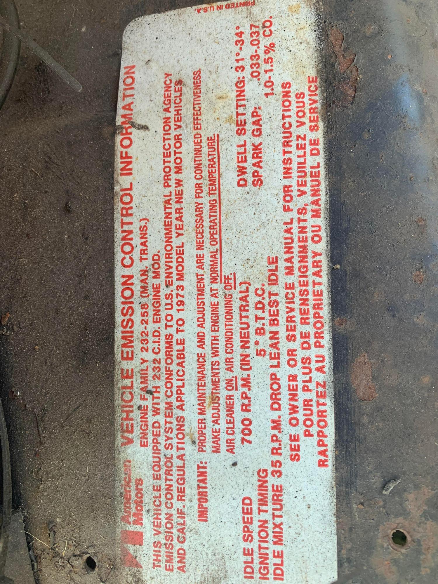 While I was snooping around the truck I found an "Emission Control tag" on the front arch of the wheel well in the engine bay. With the information stating its meant for 232-258 Manual Trans.
