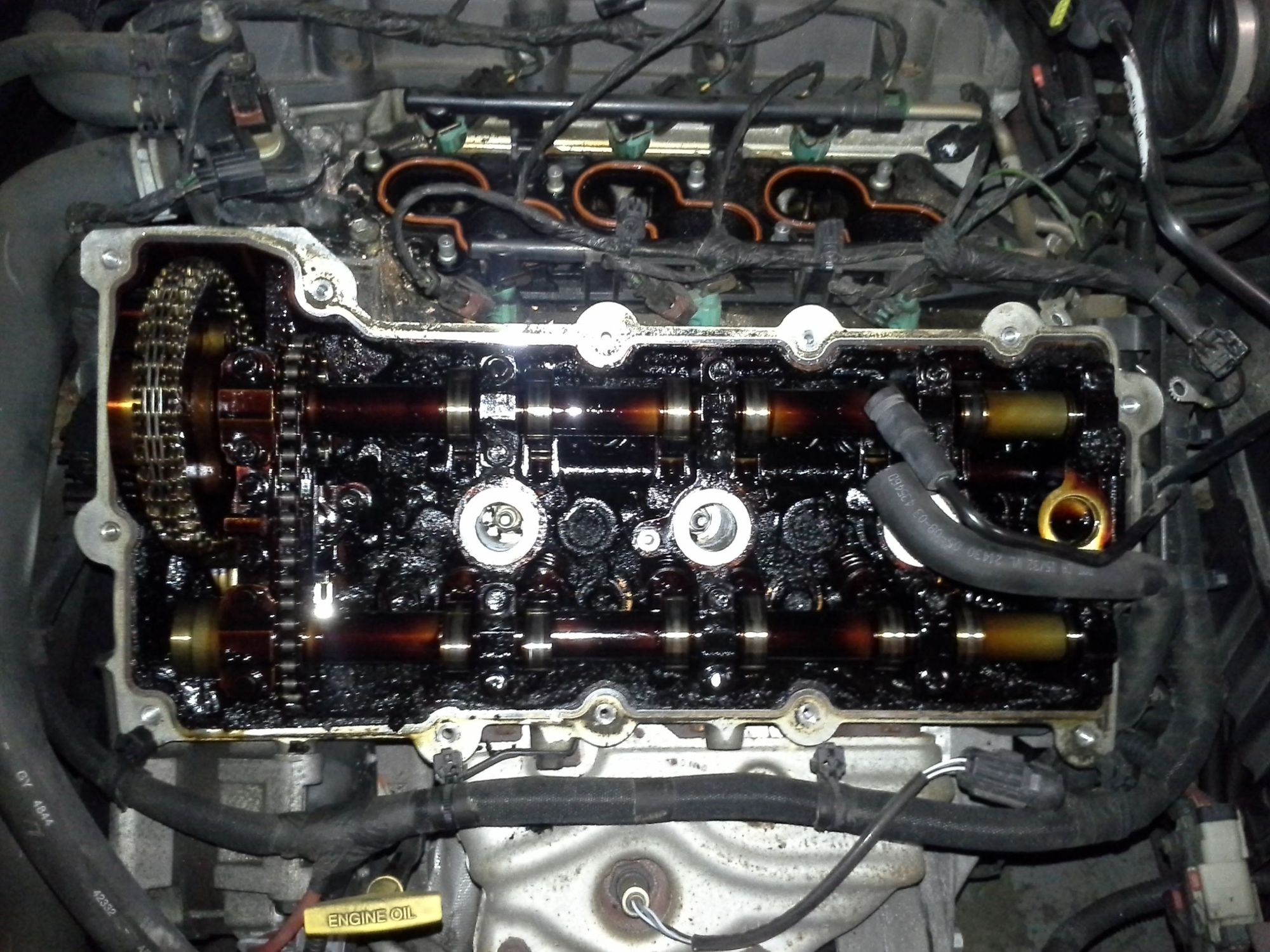 Oil light has always been flaky. Used to flicker on and off, and for the past year or so it's been on steady. Research said the PCV was probably clogged. Fast forward to a few weeks ago. Told me she started it to go to work and there was a loud tapping noise, so she shut it off and got a ride. Hasn't driven it since. Well this past week i took some time to tear into the engine a bit. Engine has a definite metallic tapping in the top end, right bank, front of the engine. It's dead silent and purrs like a kitten when it's cold, but after driving a bit or letting it idle for 5 minutes, once it warms up the tapping slowly starts to get louder. https://cimg9.ibsrv.net/gimg/www.che...8ff0820899.jpg Intake Off https://cimg7.ibsrv.net/gimg/www.che...96d628083d.jpg Valves look good https://cimg5.ibsrv.net/gimg/www.che...fbad7dc93a.jpg Uh oh https://cimg0.ibsrv.net/gimg/www.che...b1aeb111cf.jpg Lots of heat discoloration and oil sludge https://cimg3.ibsrv.net/gimg/www.che...972b824cba.jpg https://cimg4.ibsrv.net/gimg/www.che...5a88fa4f45.jpg https://cimg6.ibsrv.net/gimg/www.che...7fcdffb702.jpg And this is what was coming out - hardened (it flaked apart), compressed oil sludge, 1/4" to 3/8" thick at the bottom edge of the valve cover https://cimg8.ibsrv.net/gimg/www.che...3bd4eedbc3.jpg |