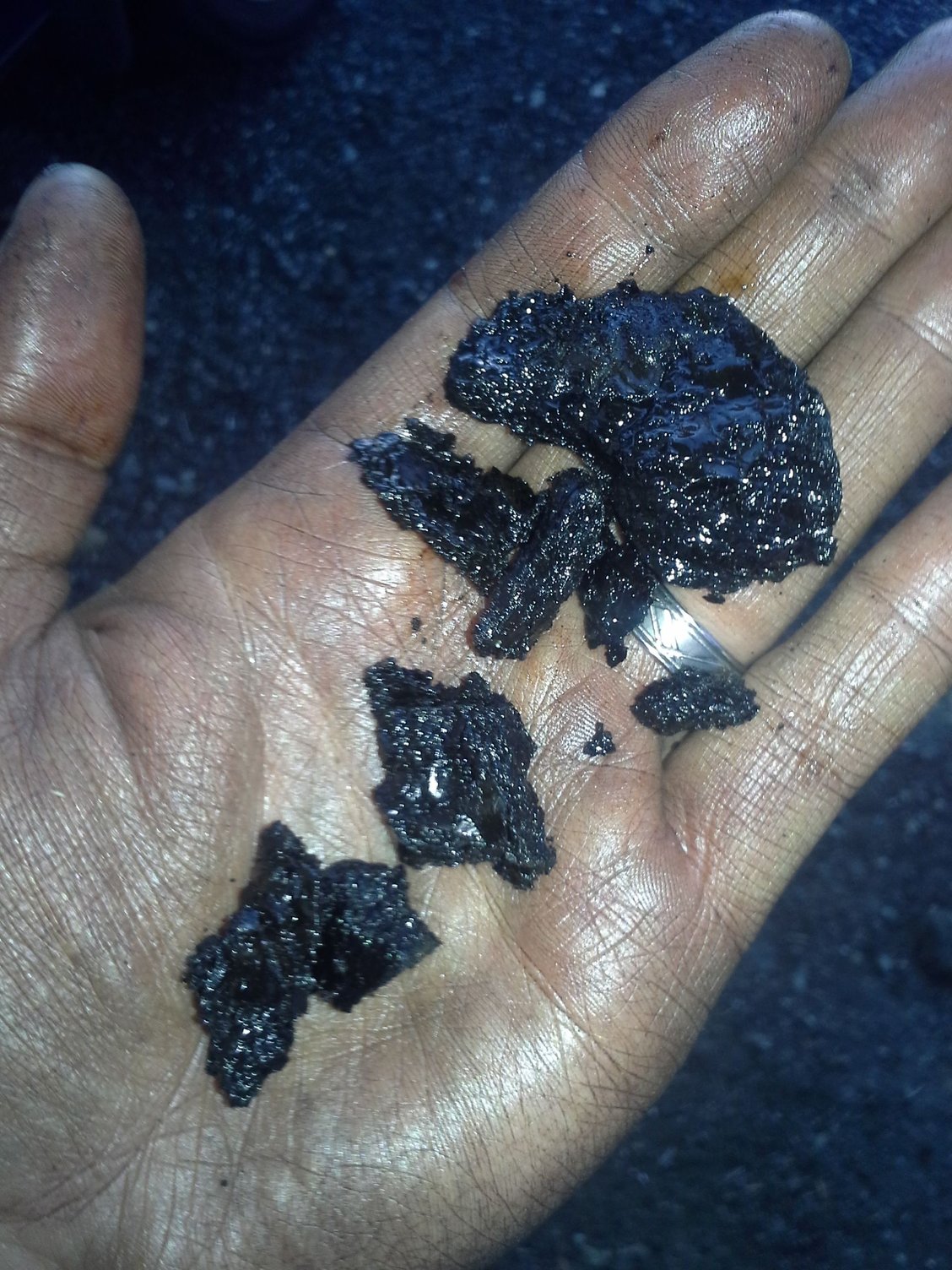 And this is what was coming out - hardened (it flaked apart), compressed oil sludge, 1/4" to 3/8" thick at the bottom edge of the valve cover