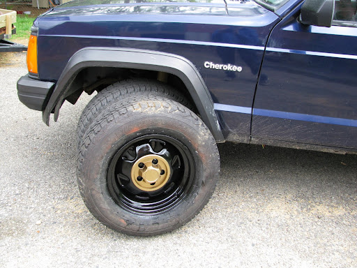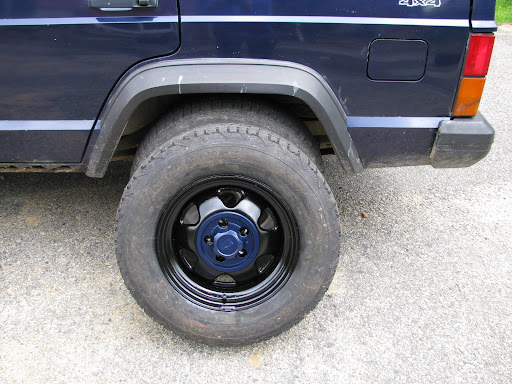 So, I was de-rusting and painting my set of winter wheels. I decided on black for the wheels, just because my parents had about 15 cans of it lying around. I got to thinking though, that i'd like to give them a little color. I'm pretty much decided between painting the center either gold or blue, so I tried one of each. Lemme know what you think looks the best. (Note, yes, I did tape over the Jeep logo in the very center)